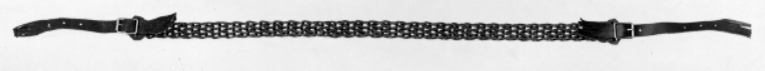 Bärrem flätad av smala lädersnoddar, i ändarna bredare och fransad med rektangulära söljor avförnicklat stål.