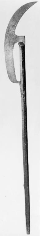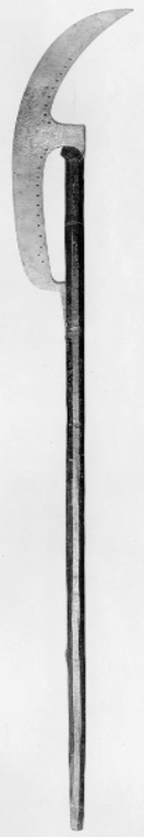 Yxbladet format som en månskära, holken ovanför mitten. Den bakåtsvängda överdelen spetsigt avsmalnande, nederdelen avslutad med en ca 117 mm lång, smal tunga, följande intill skaftet, tungans nedre ände fäst vid detta med en spik. Utmed yxbladets hela inre kant (utom framför holken) genombruten ornering av en rad runda hål, sammanlagt 30. På båda sidor om holken ett punsat och prickerat bladornament, framför detta i samma orneringsteknik ett stiliserat figurmotiv av en häst, kämpande med en ormliknande drake. Från motivet utgår ett prickerat rankornament, som följer de genombrutna hålen utmed yxbladets ryggkant. På holkens nacke en längsgående rad av tre spikar. Skaft av trä med mörkbrun yta, ojämnt åttsidig genomskärning. Nedre änden något avsmalnande och tvärt avskuren.
