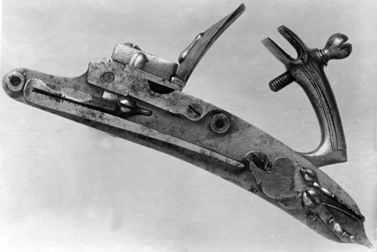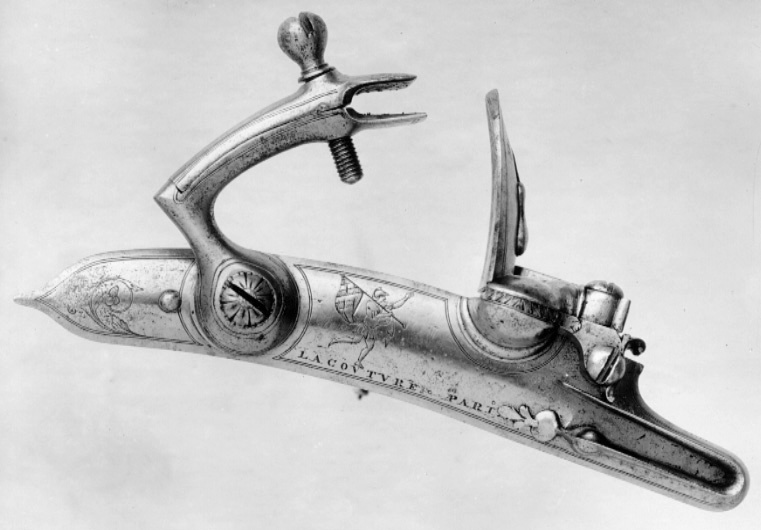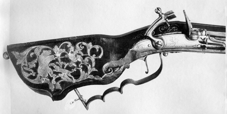 Flintsnapplåslodbössa, springlås, pipan stämplad H H S, lås av La Couture, Paris ca 1660-1685.