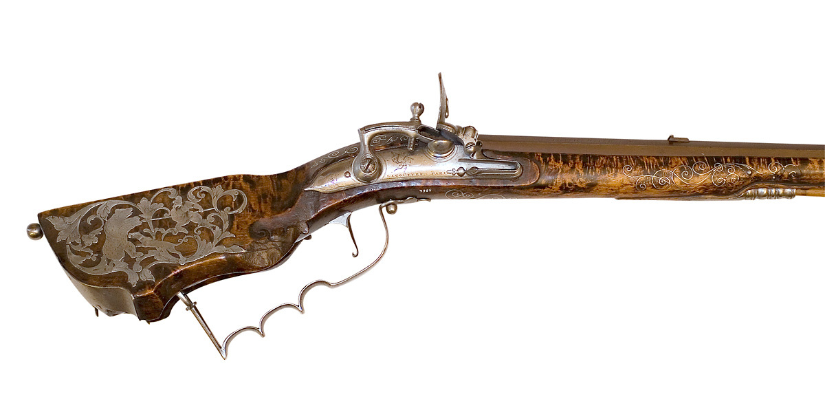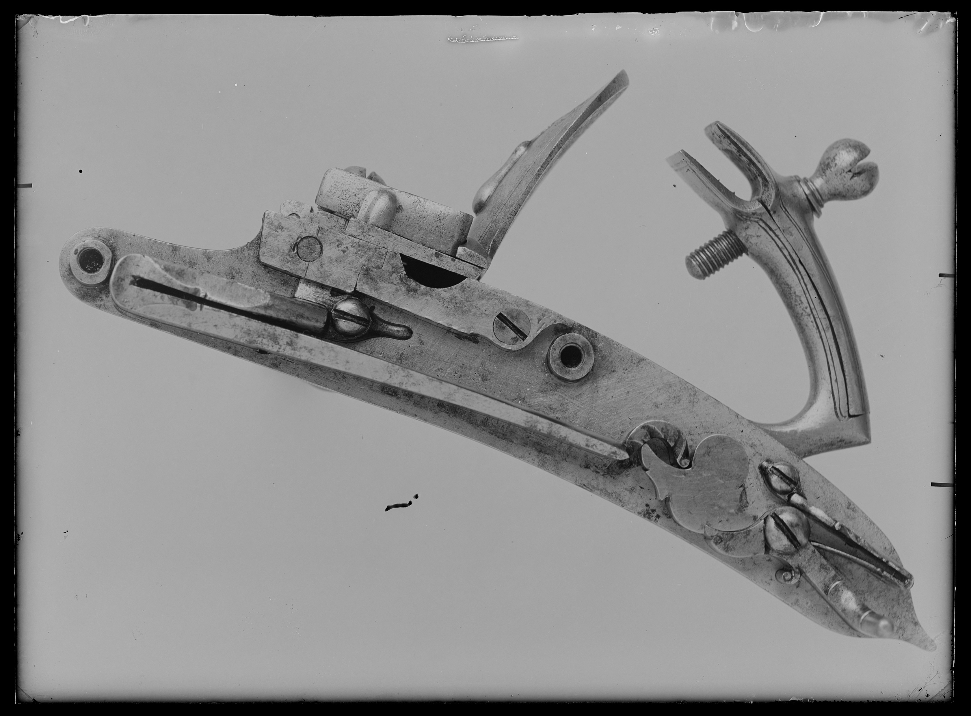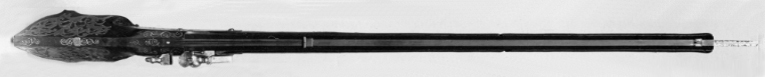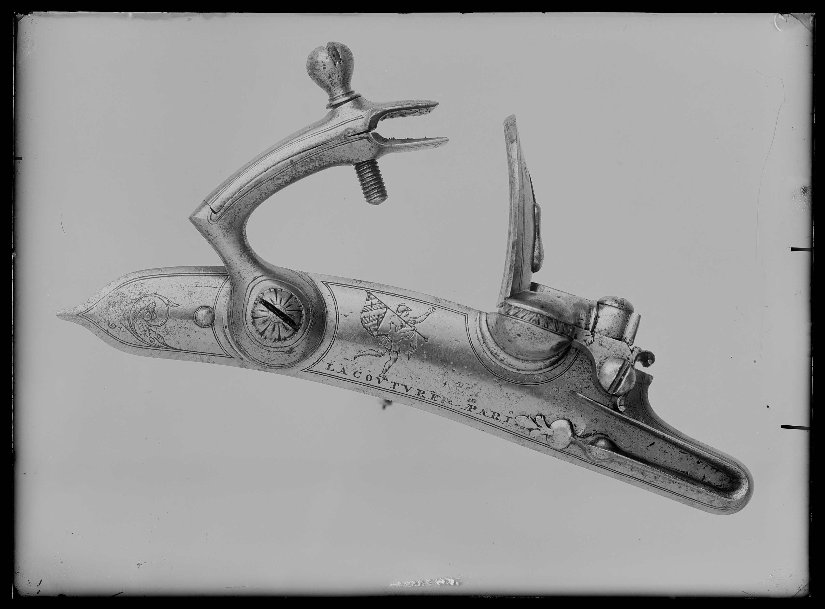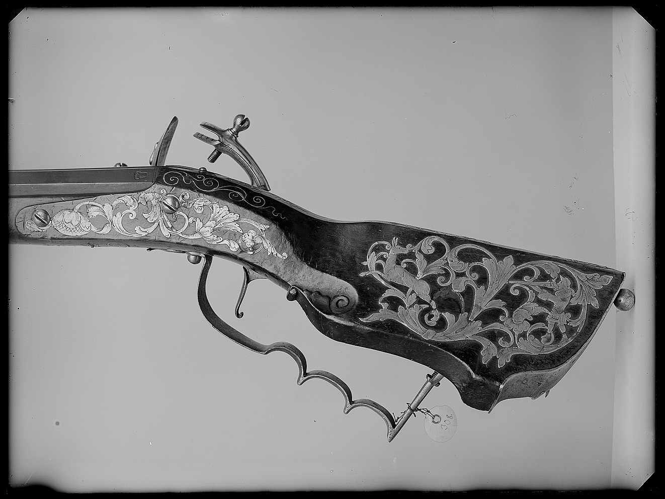 Åttsidig, brunerad pipa av stål med åtta räfflor. På kammarens ovansida två stämplar: H H S och riksäpple (Stöckelnr 2901). På kammarens ena sida graverat: "FRIDERICH MANGNUS STEINBOCK". Riktmedel: Siktskåra över kammaren fram till ståndsiktet av stål. Stolpkorn av mässing. Fästning: Tre häften. Pipan fäst med krysskruv samt två pipstift av stål. Flintsnapplås, springlås med välvt låsbleck, graverad dekor i form av en blomma på bakspetsen och en fanbärare framför hanfoten. Hane med kraftig, rund hanfot, hankropp i vinkel, inlaxad överkäke. Rund fängpanna med fals, nedanför fängpannan signatur: "LA COVTVRE A PARIS". Eldstål med kägelformig dekor på ryggen, stålet vridbart och fäst på fängpannelocket. Fästning: Två låsskruvar. Avtryckare. Helstock av björk med kolv av typ mellan den tyska och den hjortklövsformiga, snidad bladvolut på vingen. Silvertrådsinläggningar på kolv och framstock, på kolvsidorna silverbleck i form av bladvoluter samt en björnjakt, genombrutet sidbleck i form av växtornament. Övriga beslag av stål. Bakplåt med stödkula, rustkammarnummer: N:o 4. Tre profilerade rörkor. Varbygel med tre fingerlägen, bakre stolpen tvådelad, främre skruven krysskruv. På kolvens undersida kolvlåda med lock av björk. Anmärkning: Framstocken avbruten vid mittrörkan, ett pipstift och delar av silvret saknas. Tillbehör: Laddstock av trä. Låset utvändigt av springlåsform, men den inre konstruktionen är ett flintlås med nöt och på nöten verkande avtryckarstång.
