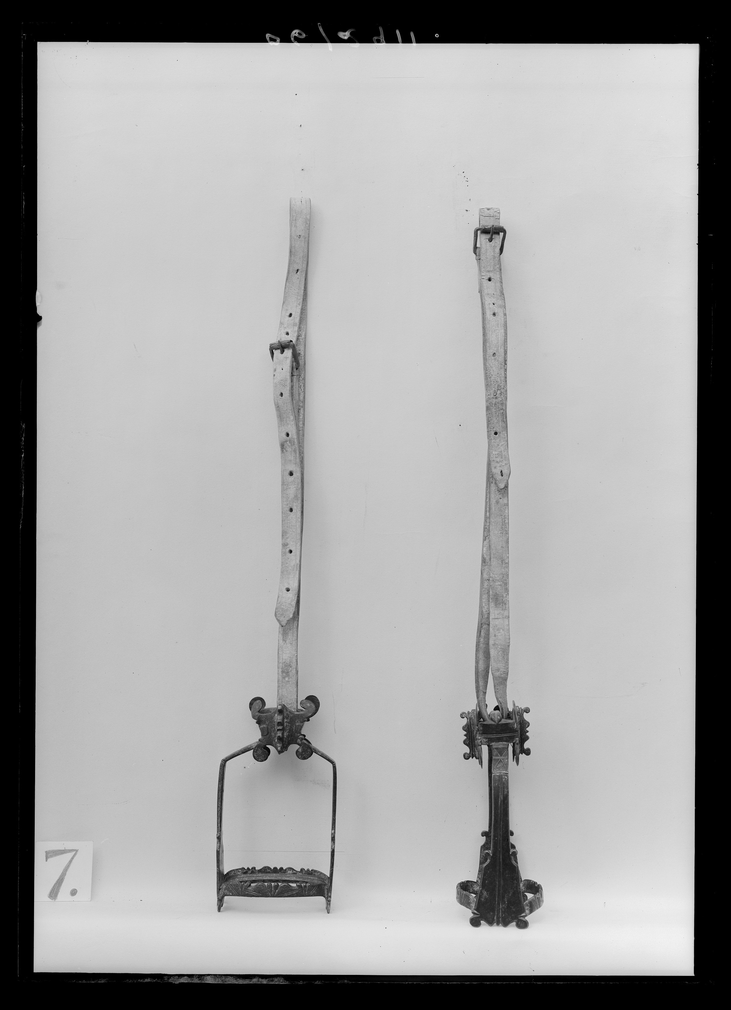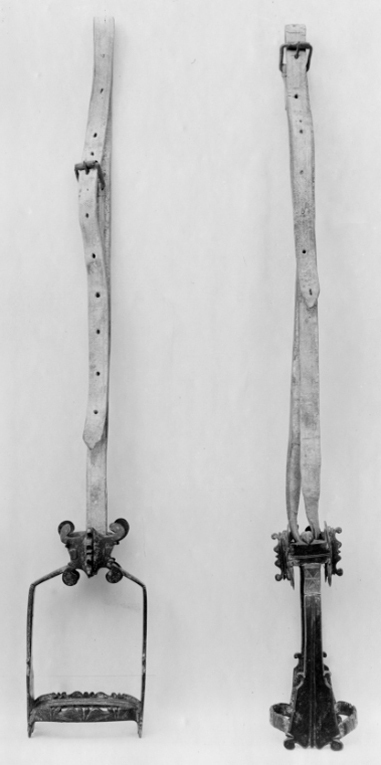 Stigbygel av förgyllt stål, U-formad bygel, skänklarna upptill vinkelformigt böjda, nedtillbredare med på mitten två utskott samt dubbla längsgående skåror, nedtill konturerad kant. Fast kistformigt remläge med konturerad skärm på båda sidor, skärmarnas fyra hörn med storavolutliknande utskott. Ovalt trampstöd med två fyrsidiga, parallella ståltenar. Fram- och bakkanten konturerademed tre grupper snidade V-formade ornament.