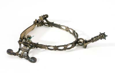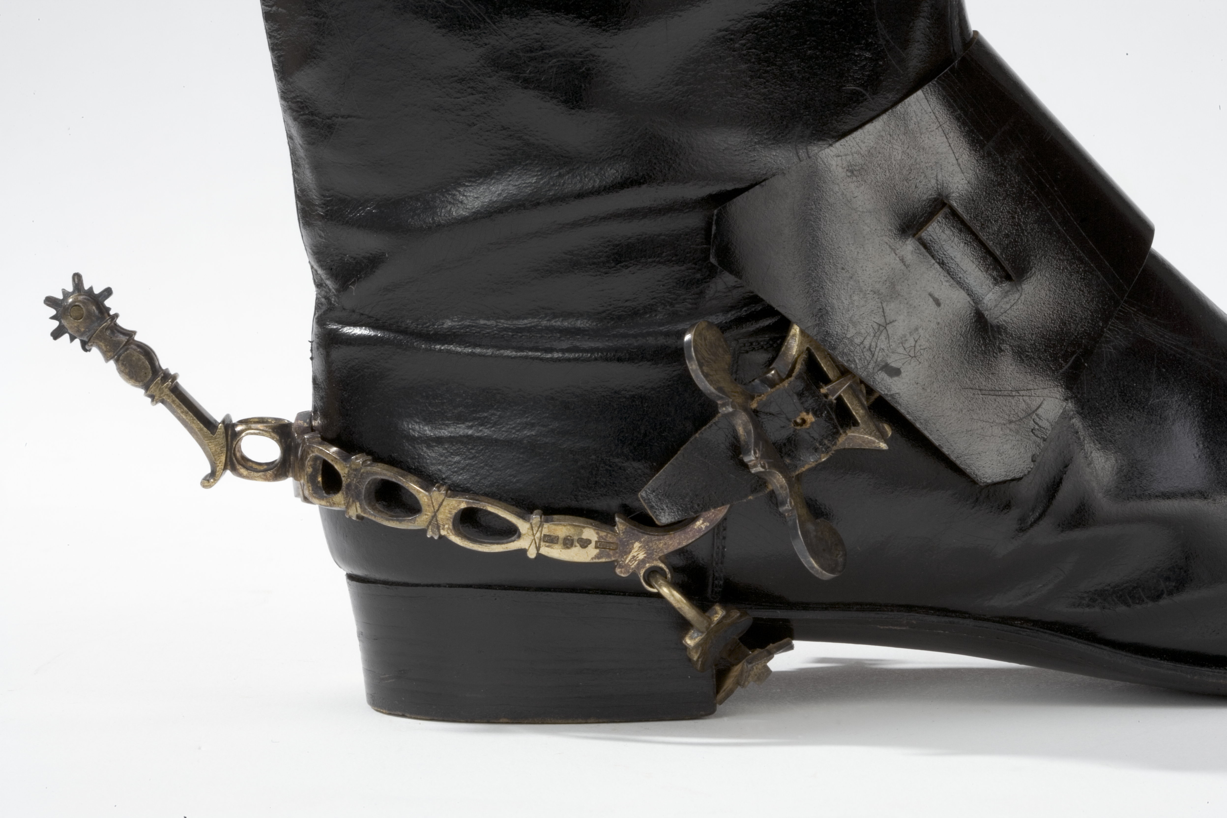 Sporre av förgyllt silver med klinga av stål. U-formade skänklar, genombrutna i ovaler och ciselerade. Ändarna uppåtböjda med två hål, vari sitter i de båda nedre två hakar med hålfotsrem, b:17 mm, 1: 65 mm, av på utsidan svärtat läder. I de övre hålen sitter på ena sidan en hake, på andra en sölja, l: 30 mm, b: 51 mm, med två utstående voluter. I dessa är fäst en vristrem, b: 16 mm svärtad på utsidan. På denna är trädd en svärtad läderrem, l: 160 mm, b: 72 mm. På ena skänkelns utsida silverstämplar: kontrollstämpel (tre kronor), S:t Eriks stämpel, R 4 (året 1847) och stämpeln "G.M.".Hals, l: 53 mm. Halsfoten rund genombruten, resten av halsen i vinkel mot halsfoten och ciselerad. Liten klinga av stål, d: 15 mm, med sex större och sex mindre uddar.