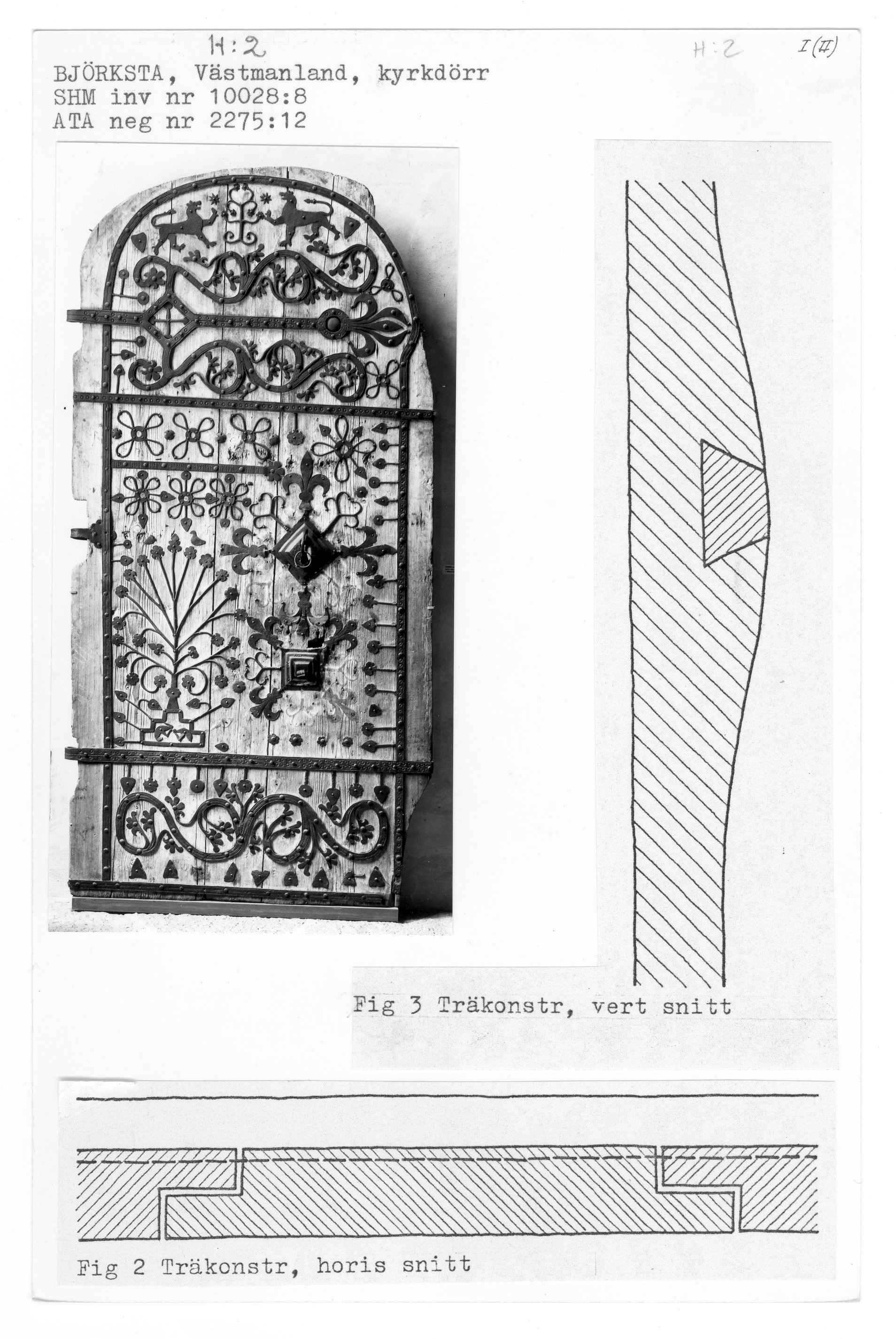 På ett horisontellt beslag på dörrens övre del finns en runinskrift som lyder: "Gud signe eder, mäster Röding och Bo fris. O, Alfa". 1400-talets mitt. Dekor livsträd