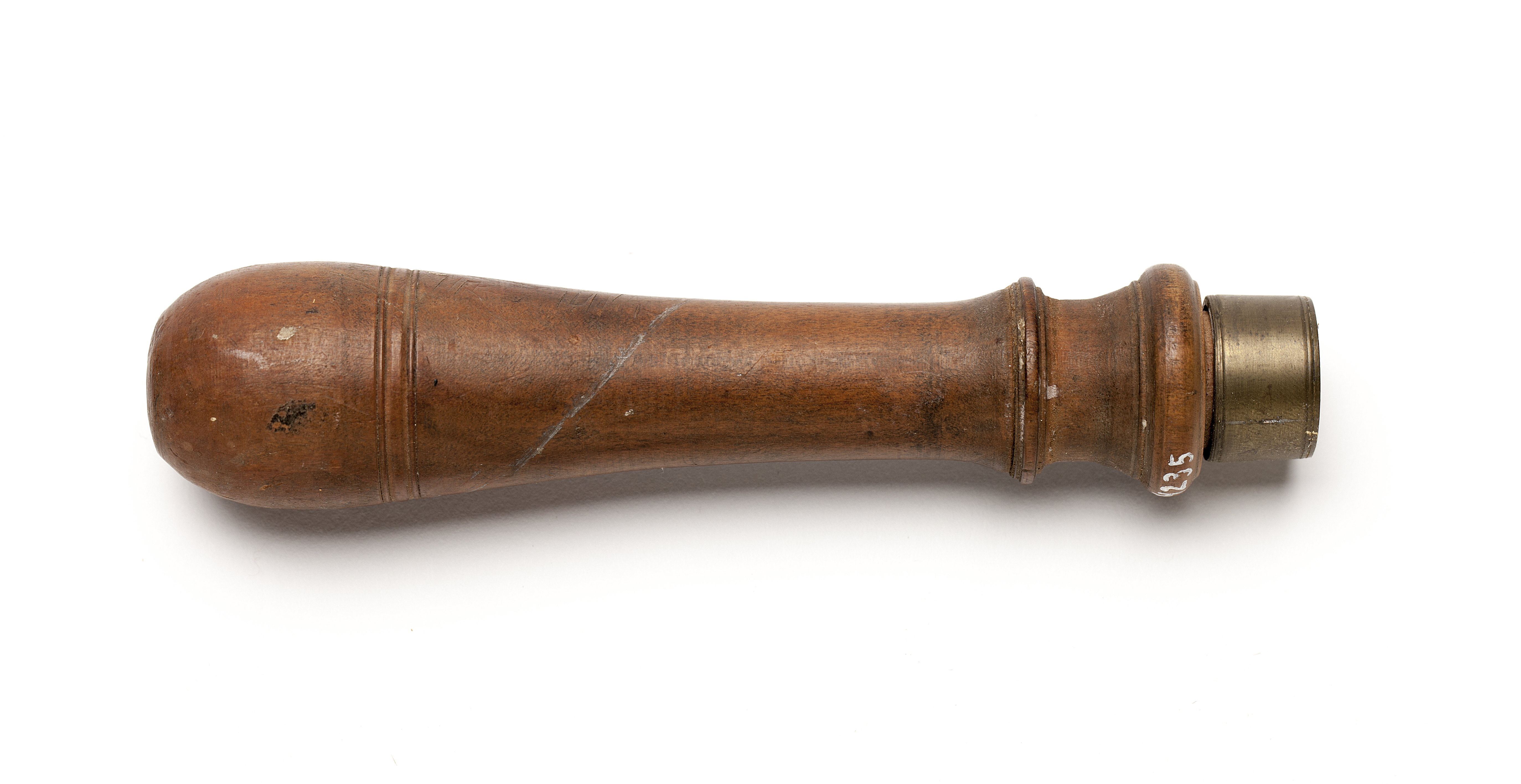 Klinga med rektangulär genomskärning. Två sidoeggar samt en främre spetsig egg, bildad av två varandra motställda, konkava eggar. Svarvat skaft av päronträ med en vulst. Mässingsring. Stämplat på klingan: "S B".