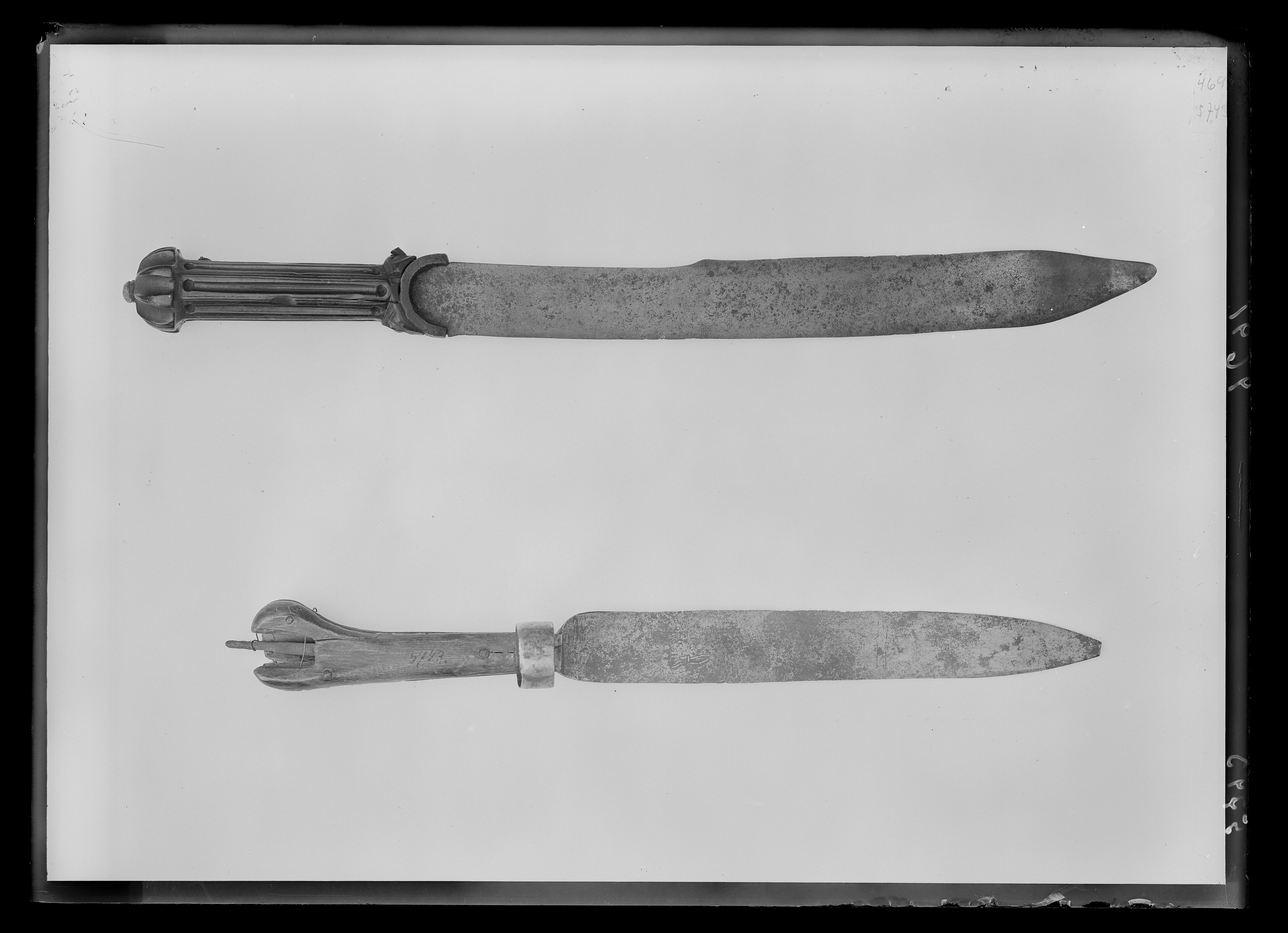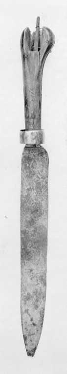 Knivbajonett med fäste av brunt trä i två plattor fäst genom tången medelst tre små nitar. I skaftets övre ände ett rektangulärt urtag, vari rester av en fjädrande låsanordning (?) syns. Rakt eneggat blad, med 19 mm långt indraget parti närmast fästet. På ena sidan av detta en 15 mm bred ring (för fästande runt gevärets pipa). Ringen fäst med en nit genom bladet. På ena sidan av detta en inslagen stämpel i form av en dolk.