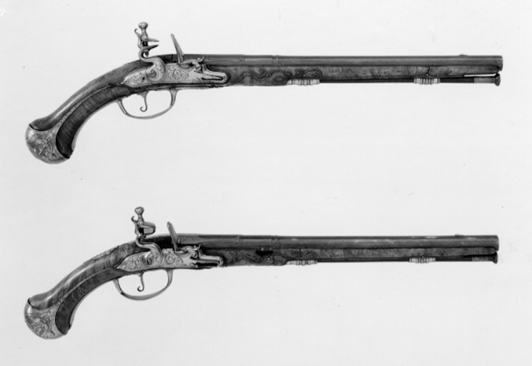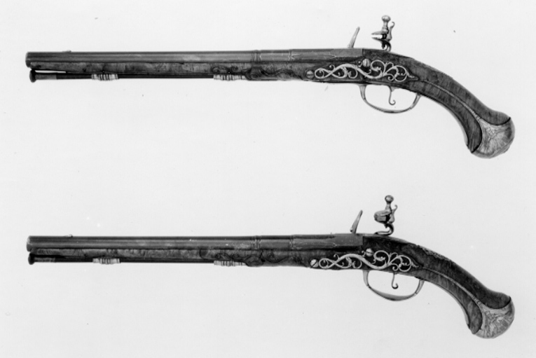 Rund, slätborrad, blånerad pipa av stål med kantig bakre del av kammaren, l: 30 mm, kanterna därframför fasade med graverad dekor. På kammarens främre del tre ringar, den bakre vid den fasade delen, ett otydligt, graverat spegelmonogram E H(?) N B under öppen krona (kontinental grevekrona). Rektangulärt, svagt böjt svansskruvblad, graverad dekor, sicksackbårder och ranka med fågelhuvud. På kammarens undersida en oval stämpel: M. Riktmedel: Spolformigt korn av silver. Fästning: Två häften. Pipan fäst med krysskruv, bakre låsskruven genom svansskruvplattan samt två pipstift av stål. Flintlås av stål med svagt välvt låsbleck, smal, rundad kantlist, graverad dekor. Bakom hanen en ranka övergående i häxfigur, framför hanen ranka och mansfigur med lyft klubba (?), vid nederkanten graverad signatur: "MONLONG ET FRAPPIER", nedanför batterifjädern "APARIS". S-formigt svängd välvdhane med graverad ranka. Runda käkar, överkäken lös, käkskruv med päronformigt huvud. Rundad fängpanna med smal fals med mjuk övergång till fängpannan, på överkanten graverad pärlstav samt ansikte. Batteri med välvt fängpannelock, eldstål med kantlist och droppformig mittlist, kommaformig häl, batterifjäder med urneformigt fjäderlöv. Invändiga låsdelar blånerade. Fästning: Två låsskruvar. Avtryckare med upprullad ände. Konturerat avtryckarbleck med graverade, dubbla kantlinjer. Helstock av valnötsrot, snidade bladrankor vid svansskruvblad och spetsrörka. Beslag av stål. Kolvkappa med långa flikar, graverad dekor, på flikarna pärlstavar, på kolvkappans sidor trofégrupper, fanor, klubba, fasces, spjut, kanon(?), därframför en stående, antikiserande krigare med svärd i ena handen och en vinge i den andra, trampande på en liggande örn. Oval centrumplatta med graverade sicksack- och bladstavsringar samt i mitten en groteskt grinande ansikte i stålsnitt. Genombruten, plan tumplåt med mittplåt med graverat mansporträtt, bröstbild, profil v, plåten omgiven av hermer och upptill två med ryggen mot varandra sittande fångar. Genombrutet sidbleck i form av rankverk i stålsnitt med två ormhuvuden. En + en kraftigt profilerad rörka, slät, smal spets med graverat, skäggigt mansansikte. Varbygel med välvd främre arm, utsträckt framför och bakom framstolpen, på framänden bladrankor i stålsnitt, ände i form av fransk lilja. Bygel med på mitten kraftigt breddade kantlister, graverat två trollansikten, mellan listerna bladrankor. Smala, runda stolpar, lång, välvd bakre arm med graverade, dubbla kantlinjer, på mitten graverat: "N:o 7", ändblad i båda ändar. Namnchiffret troligen E H N B - greve Nils Bielke (1644-1716) och hans hustru, grevinnan Eva Horn af Björneborg (1653-1740), gifta 1669. Bielke var ambassadör i Frankrike 1679.