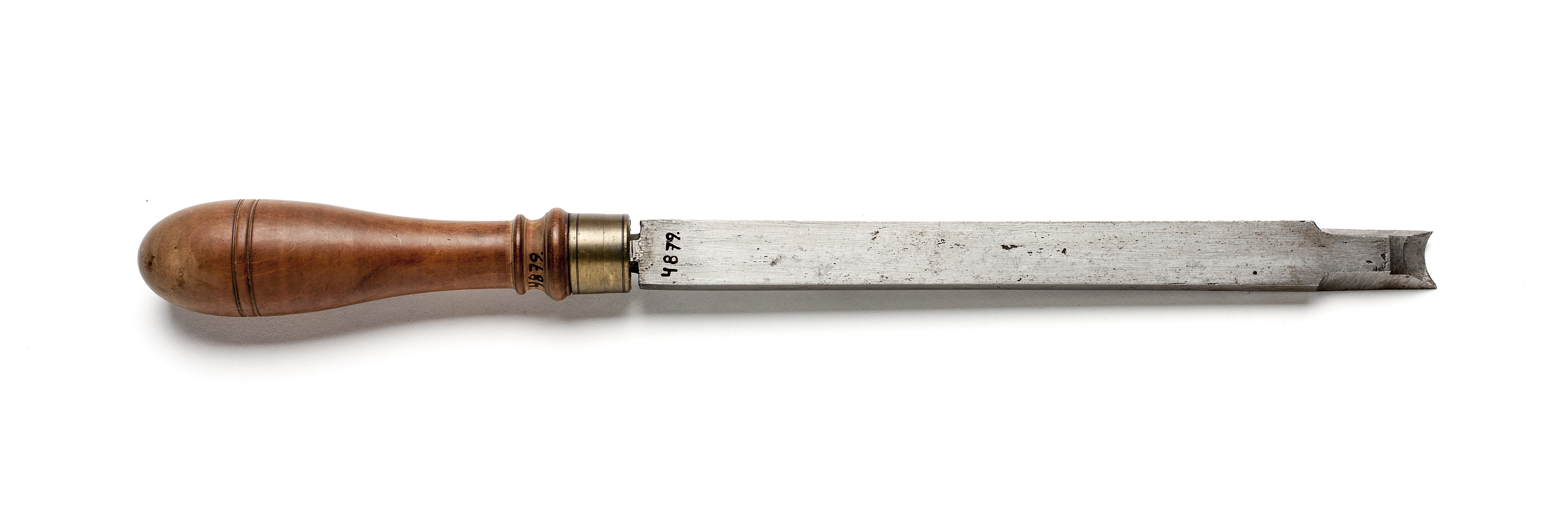 Klinga med rektangulär, i änden trapetsoidisk genomskärning. Konkav egg. Svarvat skaft av päronträ med två vulster nedtill ("skoklostertyp"). Mässingsring. Stämpel på skaftets ände vid fästet: en punkt.