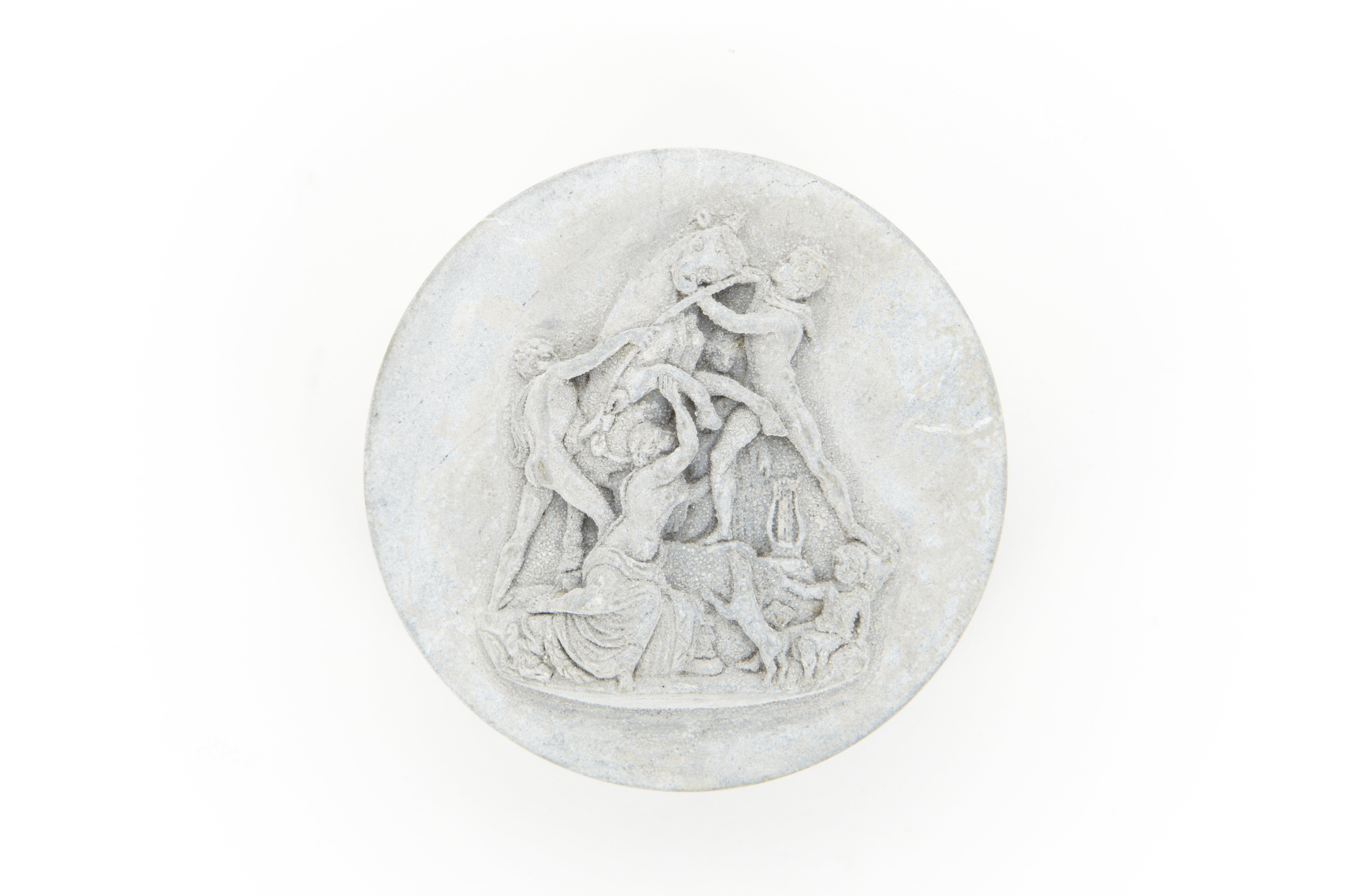 Ask med lock. Rund , platt. Lava med montering av guld. På locket farnesiska tjuren skuren i relief.