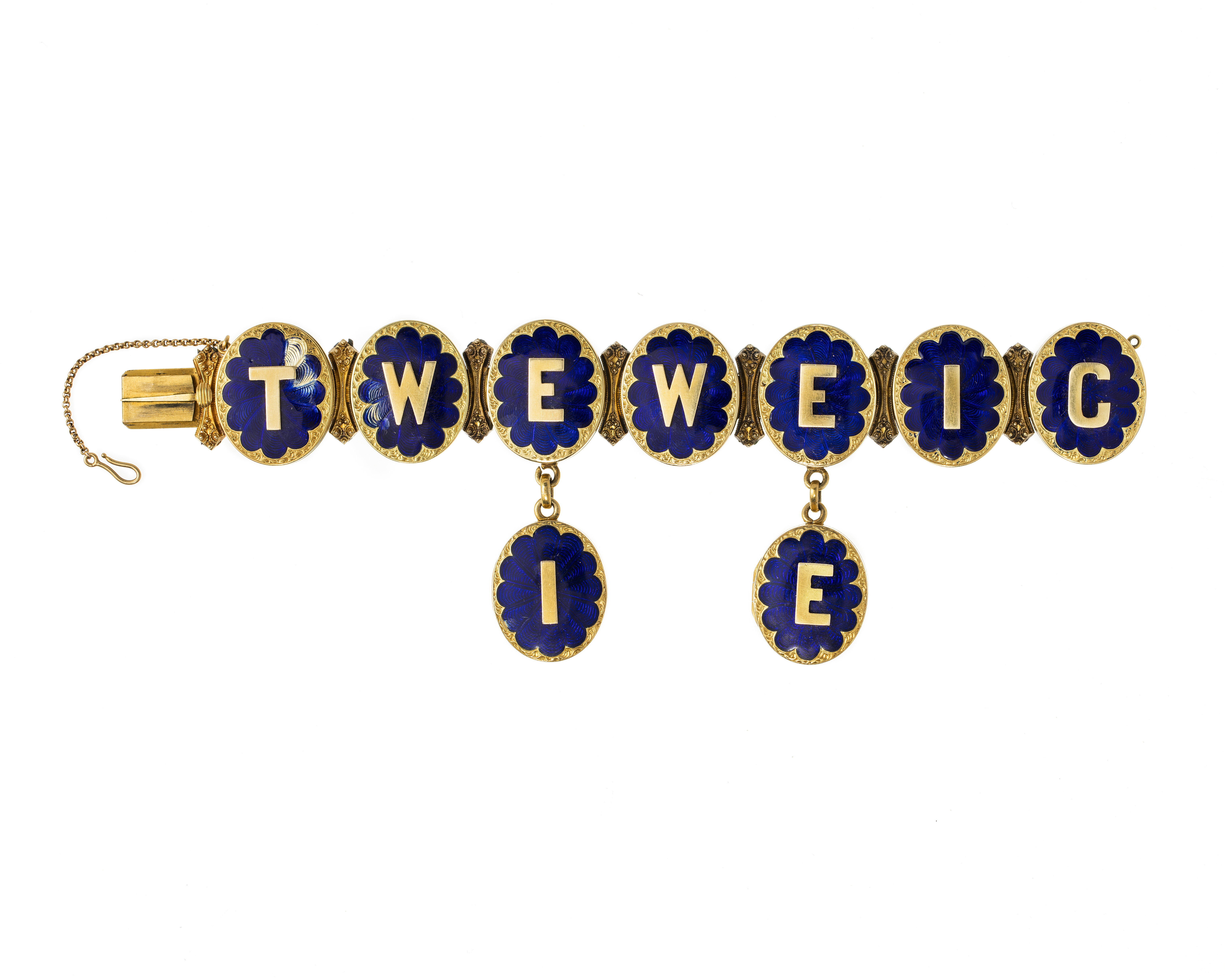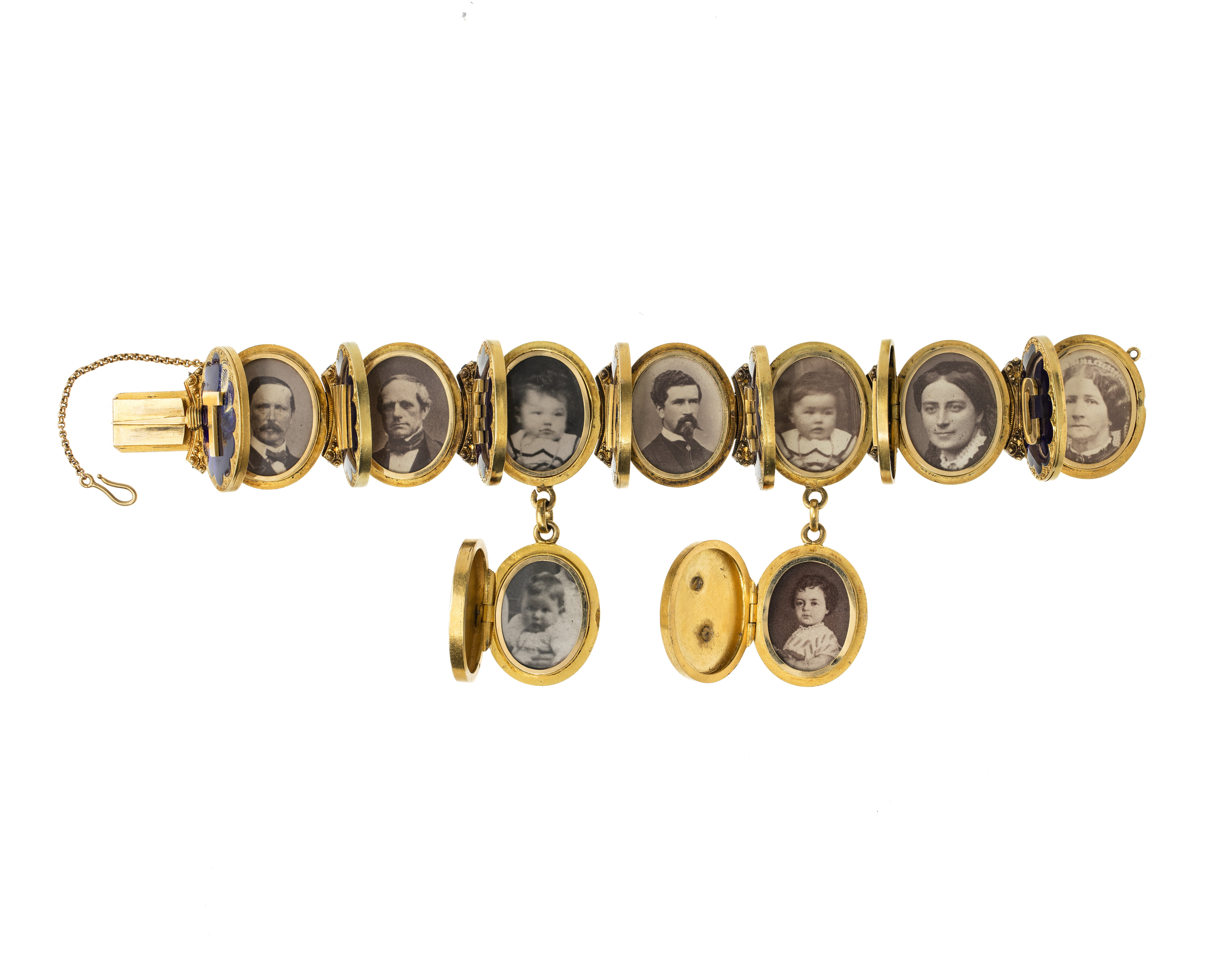 Armband av medaljonger, guld med emalj, bokstäver och fotografiporträtt. Initialerna från vänster: T = Theodor von Hallwyl (1810-1870), svärfar W = Wilhelm Kempe (1807-1883), far E = Ebba von Hallwyl (1866-1960), dotter I= Irma von Hallwyl (1873-1959), dotter W= Walther von Hallwyl (1839-1921), make E = Ellen von Hallwyl (1867-1952), dotter E= Elma von Hallwyl (1870-1871), dotter I = Johanna Kempe (1818-1909), mor C = Cecile von Hallwyl (1815-1893), svärmor Bestående av nio stående ovala medaljonger, varav sju medelst scharner sammankopplade i en rad och två löst hängande. På varje medaljong mot botten av mörkblå emalj (translucide) pålagt en bokstav av guld (förnamnsinitial på den person, vars fotografiporträtt respektive medaljong innesluter); kring ytterkanten en ciselerad bård med uddad inkant; varje medaljong med ett scharner i vänstra kanten, i den högra ett utskuret nagelfäste; baksida platt, slät. Mellan medaljongerna tvärliggande smala länkar, vari koppelscharneren är fästa; länkarna med insvängda sidokanter och spetsiga ändar samt på framsidan längs kanterna en smal repstav, på ändarna filigransrosetter. De två hängande medaljongerna kopplade i nedre änden på den tredje och femte medaljongen medelst en oval flackstavig länk, ledad i från medaljongerna utgående öglor. Mellan första och sjunde medaljongen ett lås med bred snäppare, fäst i första tvärlänken, snäpparhuset i sista medaljongen; snäpparen med styrskena och tumtrycke. Vid låset mellan första och sista medaljongen en säkerhetskedja av små runda länkar (s. k. venetiansk) med ena änden fäst i en liten ögla, i andra änden en koppelhake. Stads-, firma-, riks-, och karatstämplar samt årsbokstav. Vikt 77,9 g. L 15,6 cm. Medaljonger H 2,4 cm B 2 cm Svenskt arbete, Stockholm, från 1868, de två hängande medaljongerna från 1874; juvelerarfirman Gustaf Möllenborg. Etui (original): Av trä, avlångt, med rundade ändar, konturerad framkant och kupigt fällock samt klätt med svart pressat skinn; på locket en bred kantrand i blindtryck; foder av blå sammet och blått siden (atlas). På framsidan tryckknäppe av mässing. H 4 cm, L 22,1 cm, B 7,4 cm. Gåva till Wilhelmina von Hallwyl, armbandet julaftonen 1868, vidhängande medaljonger julaftonen 1874, från hennes make, Walther. Förfärdigat efter beställning av den sistnämnde hos juvelerarfirman Gustaf Möllenborg, Stockholm.