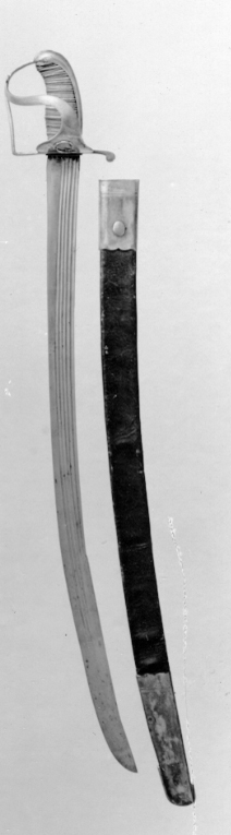 Balja av svärtat läder, munbleck och doppsko av slät, förgylld mässing med konturerade neder- respektive överkant. På munbleckets utsida koppelhake i form av rundoval, slät knapp.Släpsko av en plan mässingsten, lagd runt doppskons ytterände, högre på framkanten. Har tillhört konungens överadjutant, majoren mm Johan Georg af Sillén (1767-1795, Elgenstierna tab. 23). Gåva av kommendören vid flottan mm, Arvid F W Egerström.