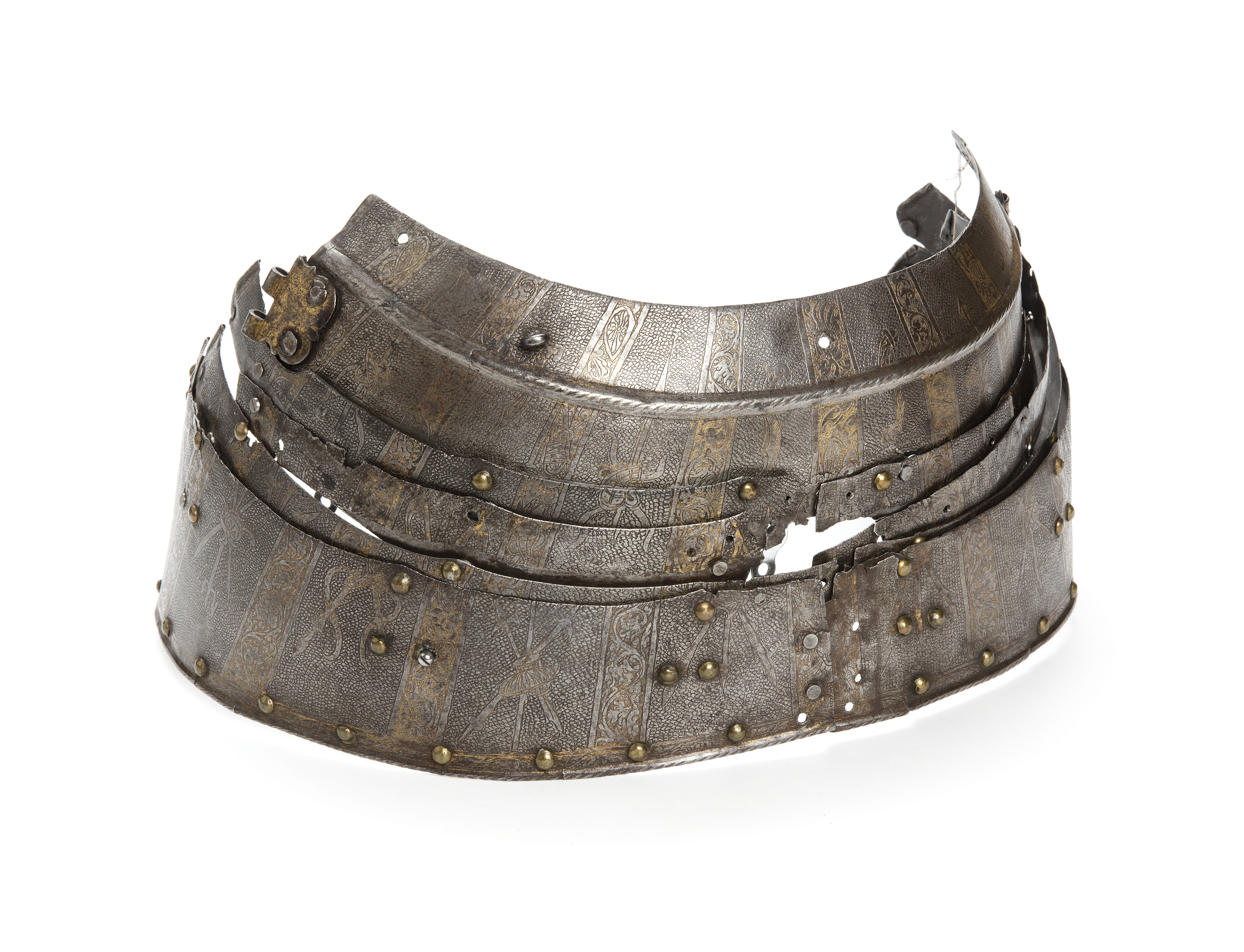 - Konung Erik XIV rustning af jern, etsad i ornementer och förgylld, består af: