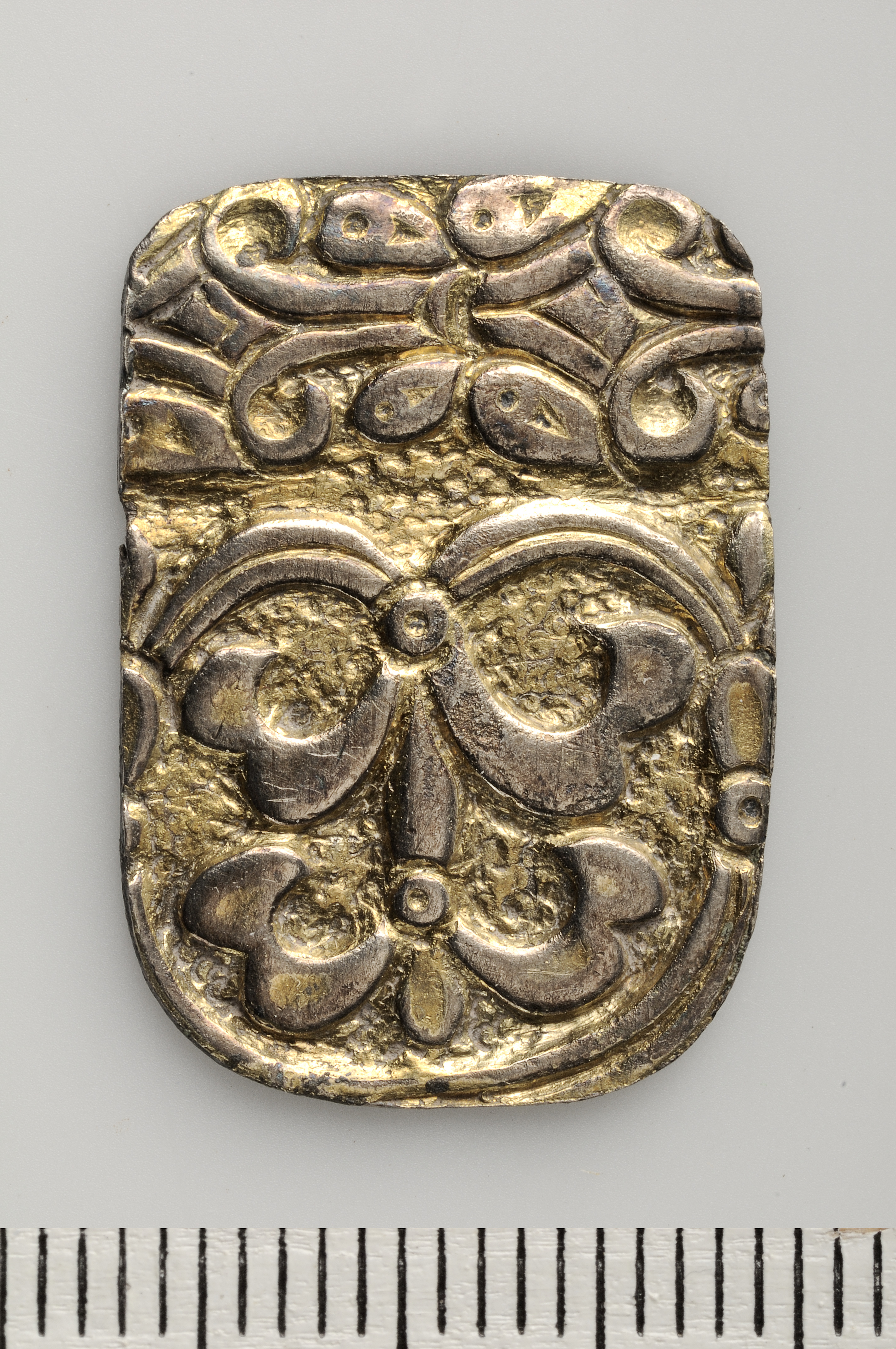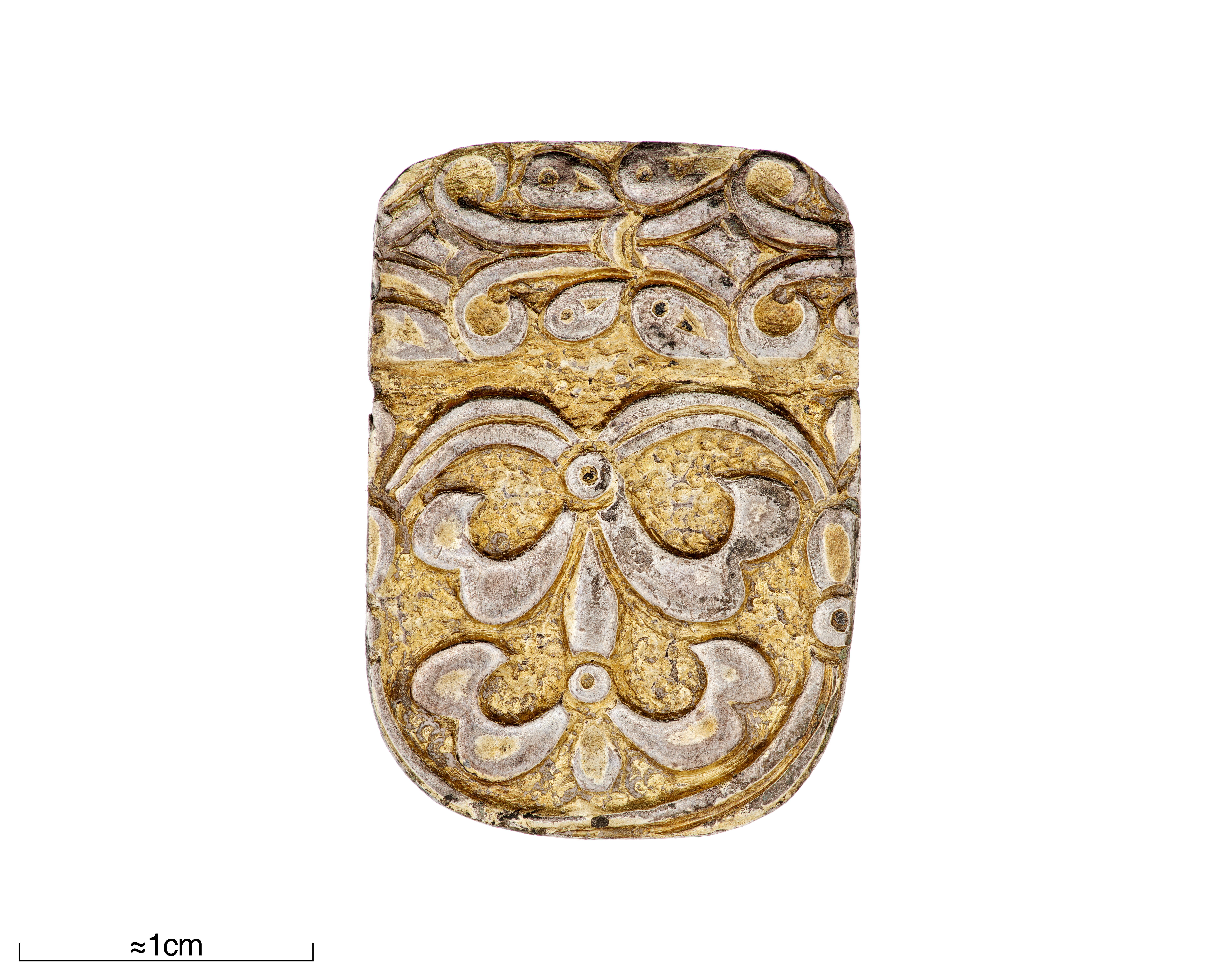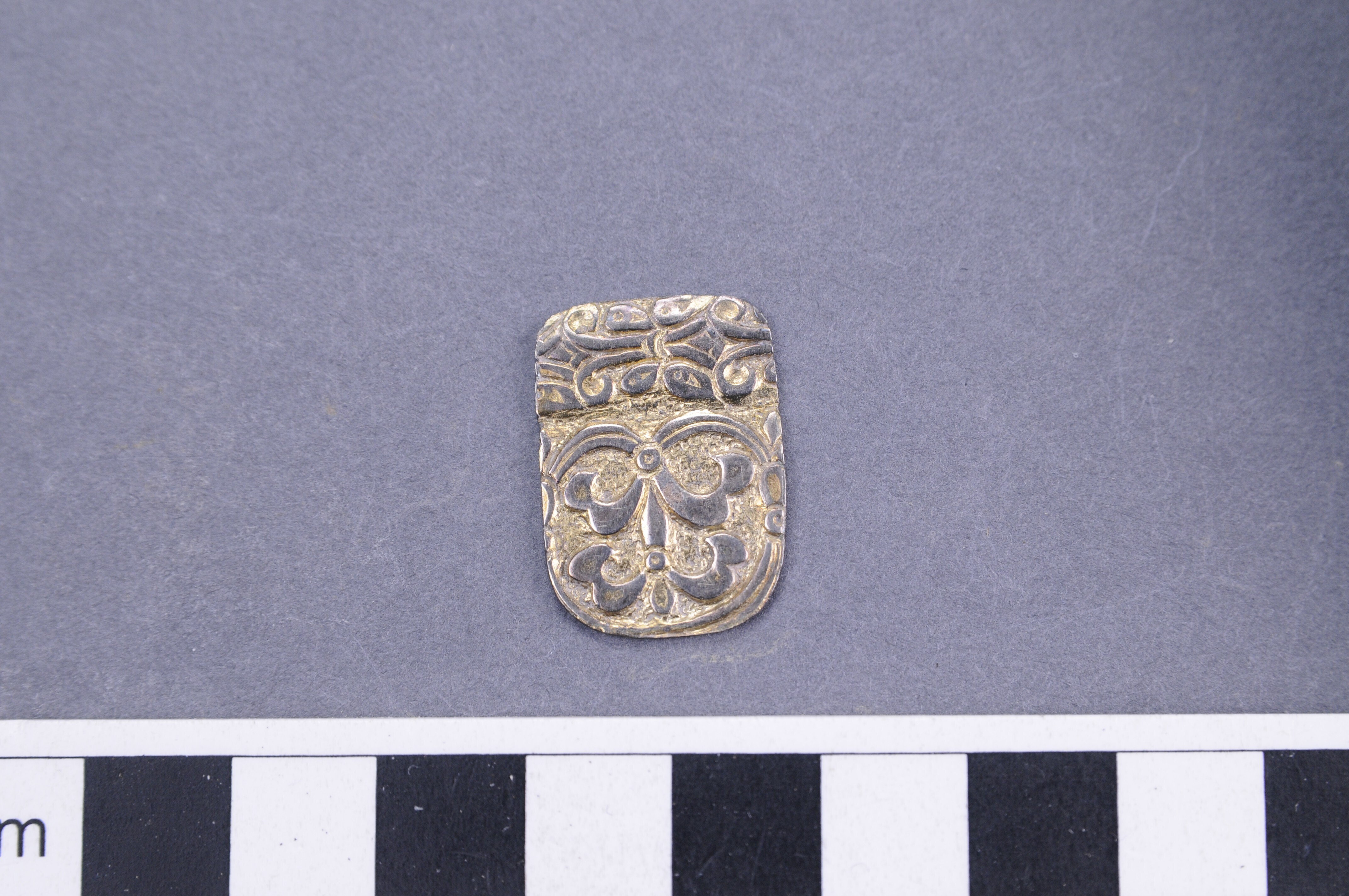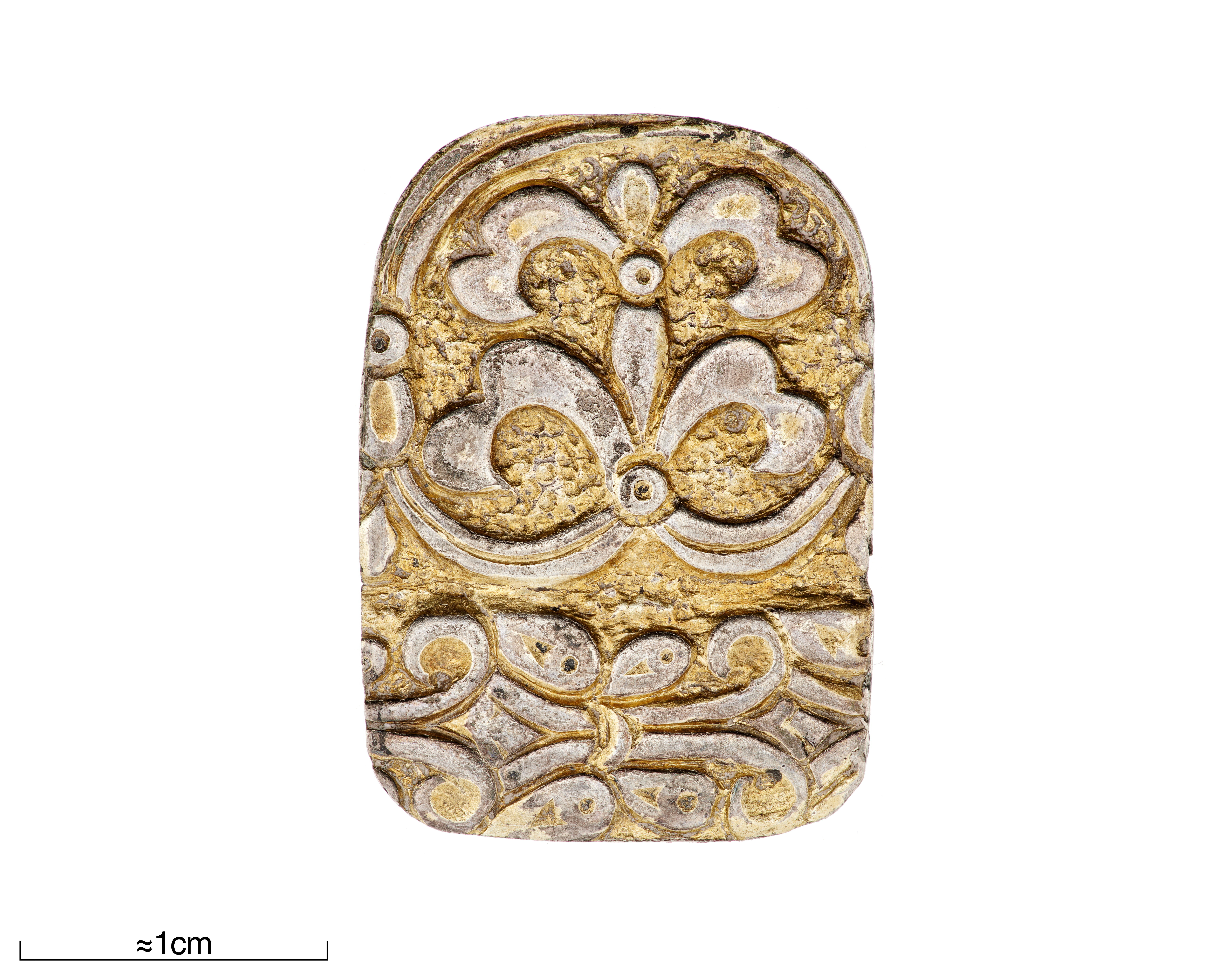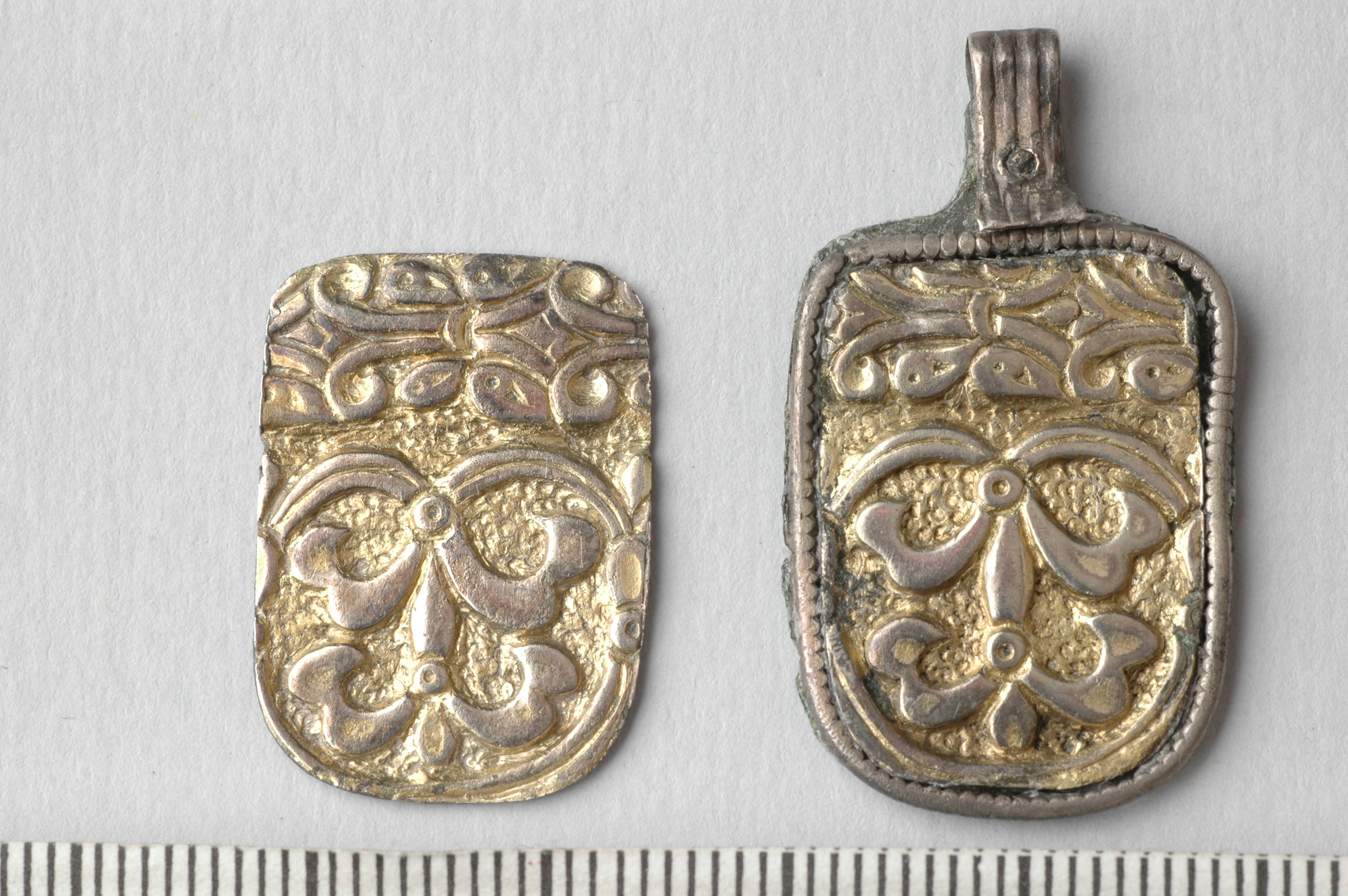 Hänge utskuret ur kanten på 1 förgylld silverskål.