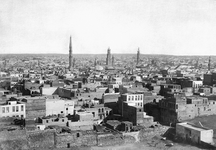 Vy över Kairo, Egypten. Fotografierna LXVI:M.01.- 201. kommer från resan till Egypten och Sudan som Wilhelmina och Walther von Hallwyl gjorde vintern 1900-1901. De lämnade Sverige den 5 november 1900 och fortsatte från Egypten till Palestina den 28 mars 1901. Med på resan var döttrarna Ellen med maken Henric de Maré och Irma med maken Wilhelm von Geijer. Wilhelminas sällskapsdam, fröken Ida Uhse reste också med. Under en del av resan anslöt sig ledamoten av Internationella domstolen i Kairo, assessorn Otto Conrad Waldemar Cedercrantz med makan Anna Elisabeth. Vid resan uppför Nilen hade Walther von Hallwyl hyrt ångfartyget Columbia med besättning. Båtresan startade i Kairo 27 december 1900, gick ända till Wadi Halfa varifrån man reste vidare med tåg till Khartum och tillbaka till Wadi Halfa. Båten vände åter i riktning mot Kairo, men det verkar som att sällskapet tog tåg sista biten, från Luxor. Henric och Ellen de Maré samt fru Cedercrantz lämnade båten redan då de passerade Luxor första gången. Resten av sällskapet återvände till Kairo den 1 mars. Fotografierna LXVI:M.01.-120. togs av resenärerna själva, de största av Ellen de Maré, de mellersta av Wilhelmina von Hallwyl och de minsta av Wilhelm von Geijer. Resten köptes av professionella fotografer i Kairo, de flesta från Studio Photogr. Artistique G. Lekegian & Cie. Alla uppgifter kommer från Ida Uhses reseanteckningar. Inköpt hos studio Photogr. Artistique G. Lekegian & Co’.