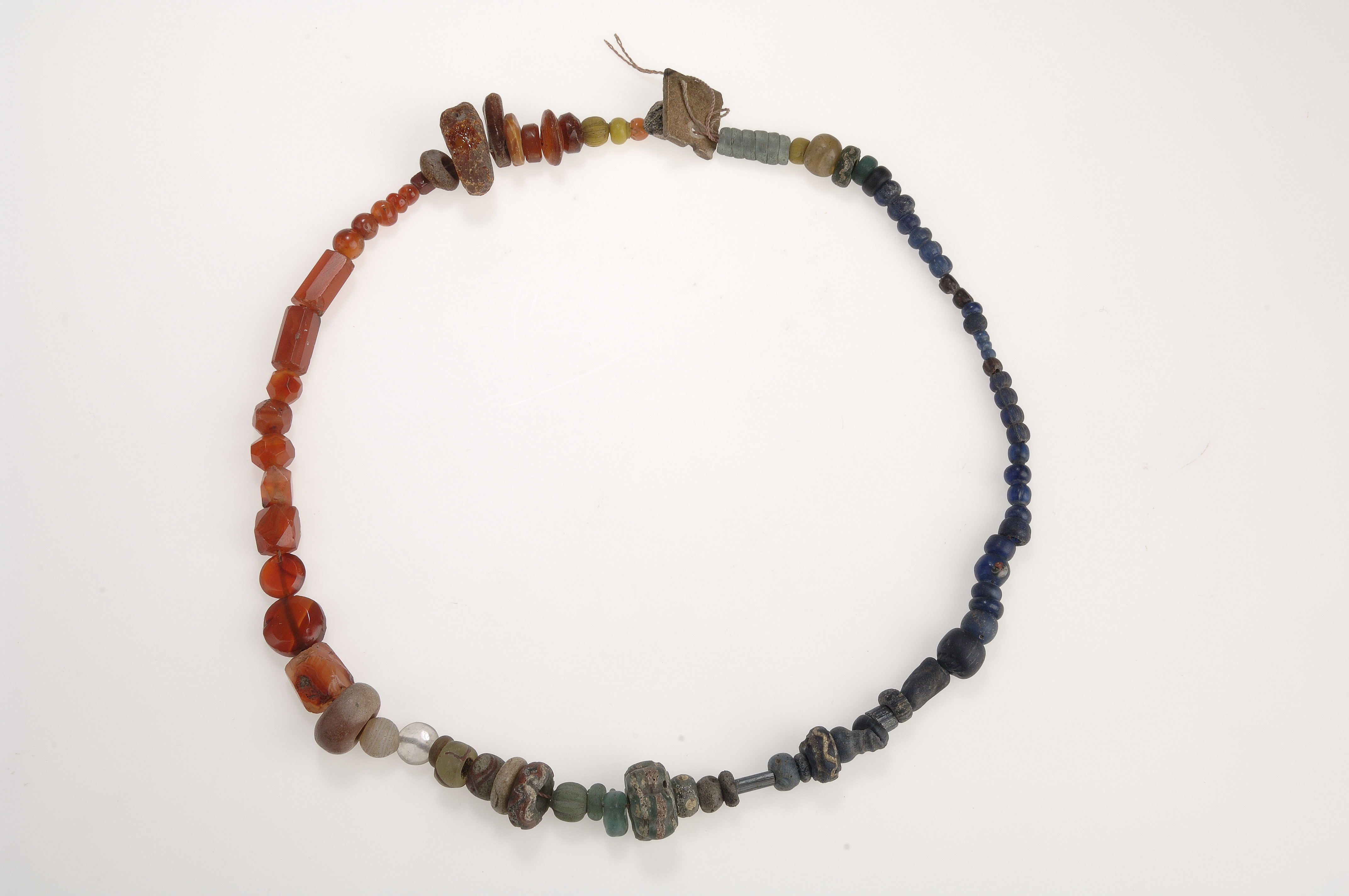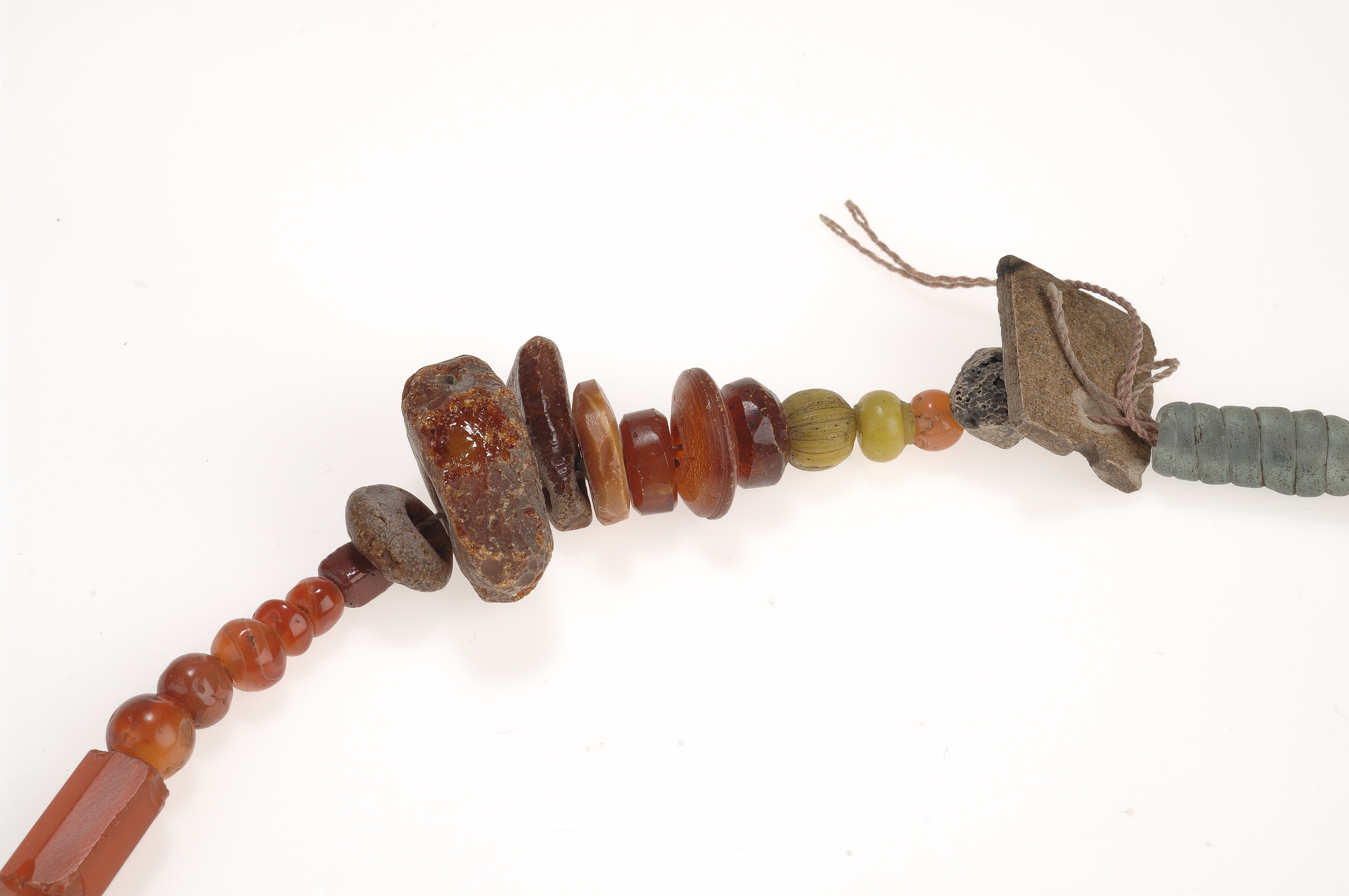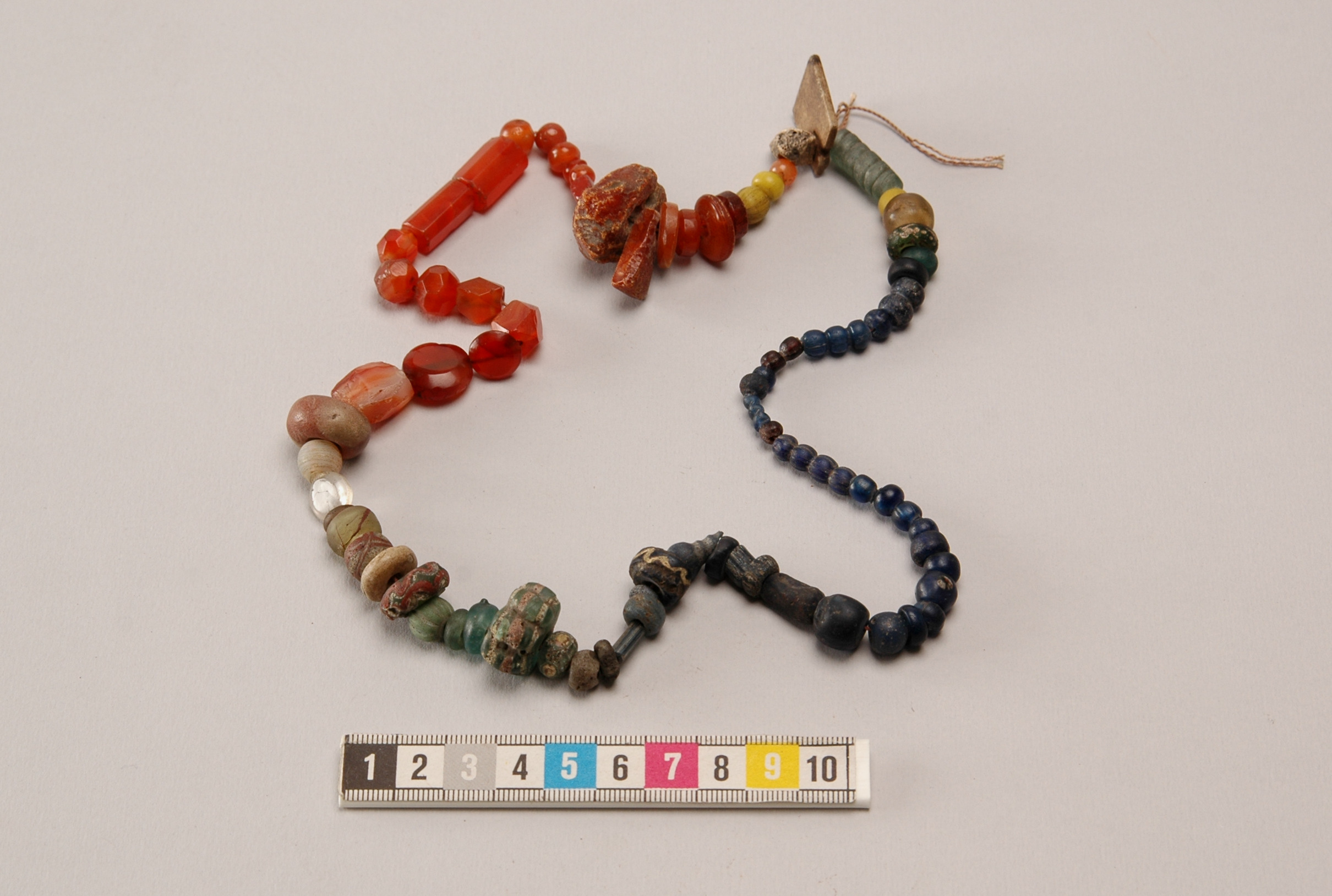 78 pärlor av karneol, bergkristall, bärnsten och glas uppträdda på snöre samman med en fragmentarisk tandplatta till enkelkam.