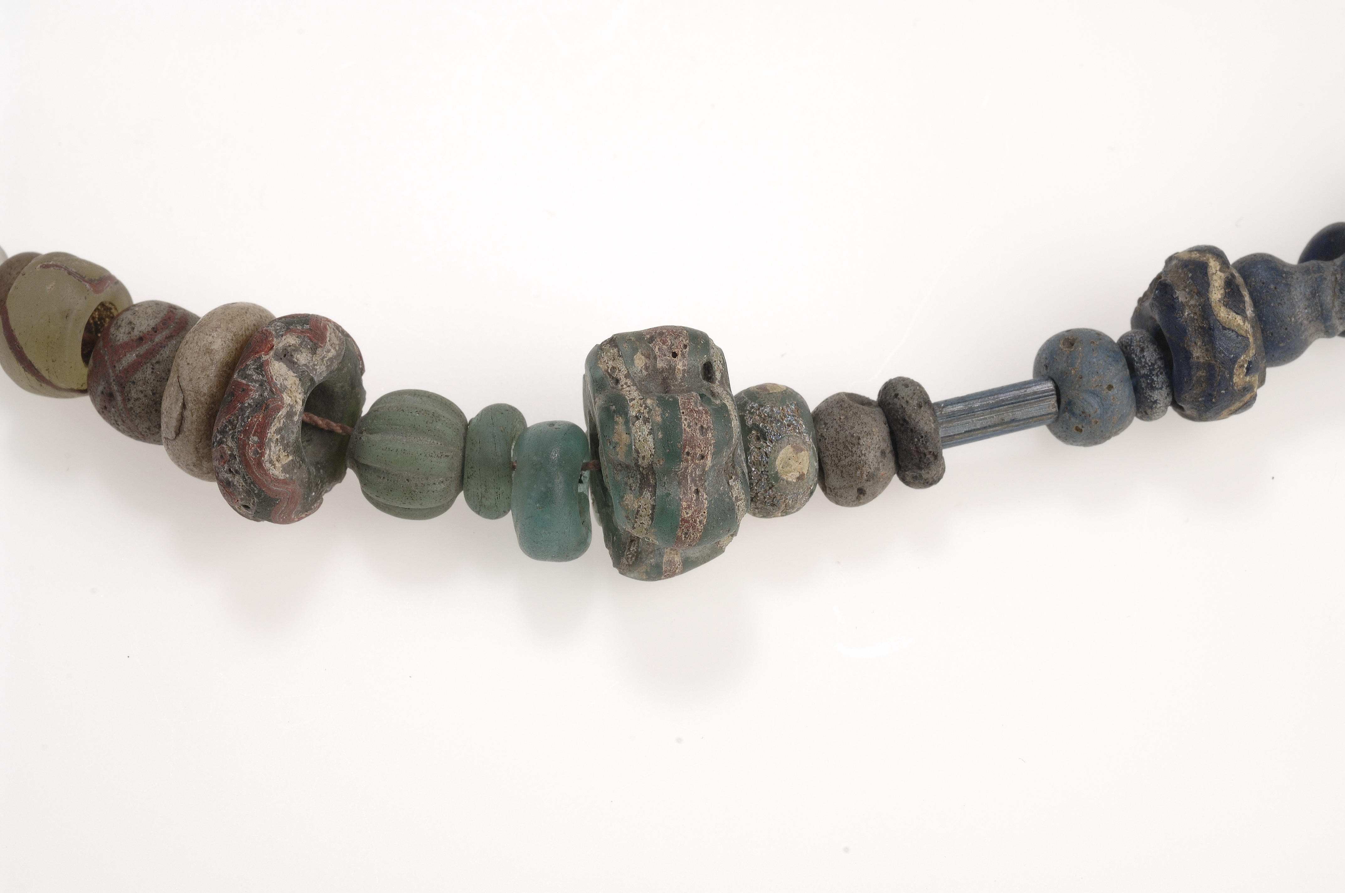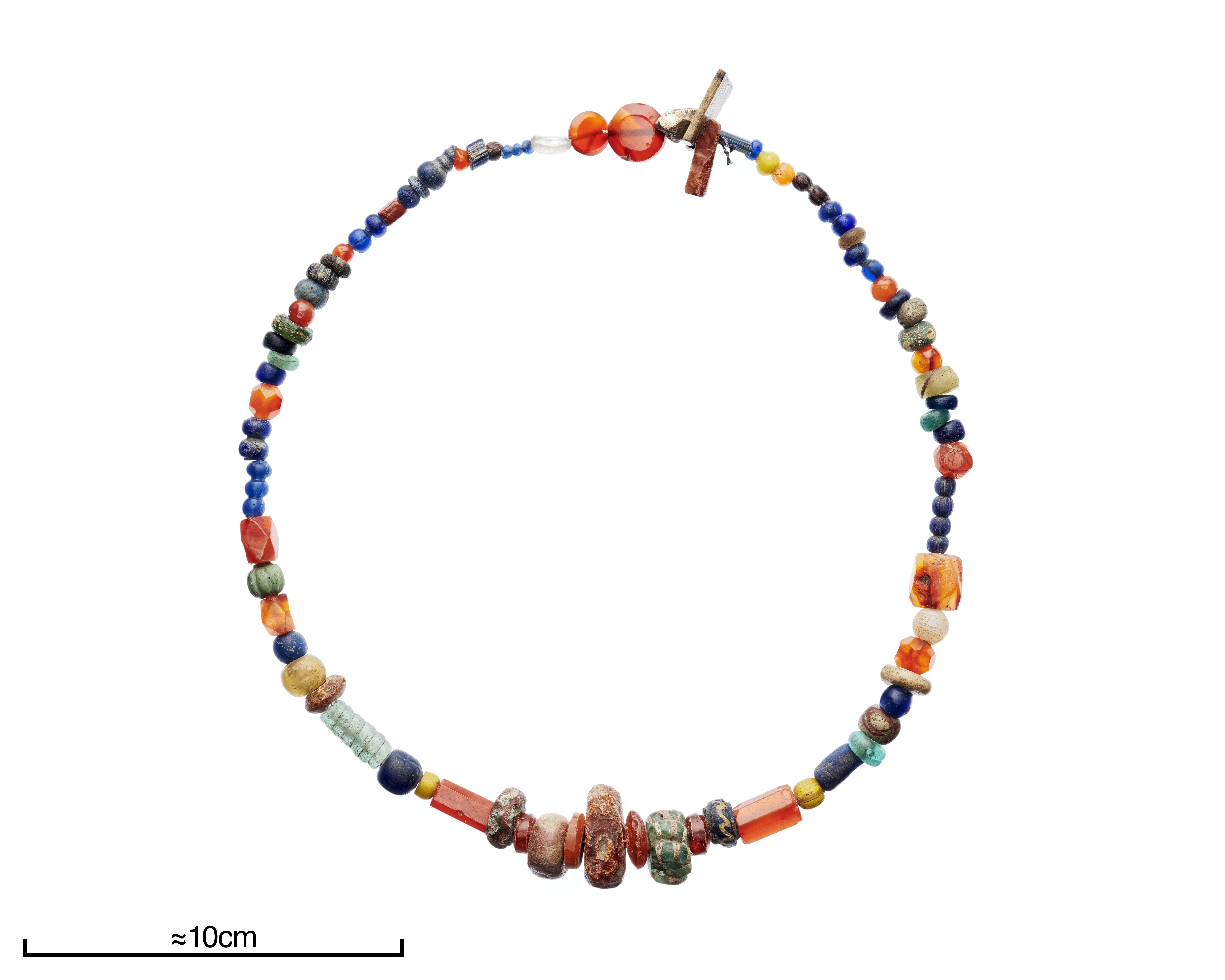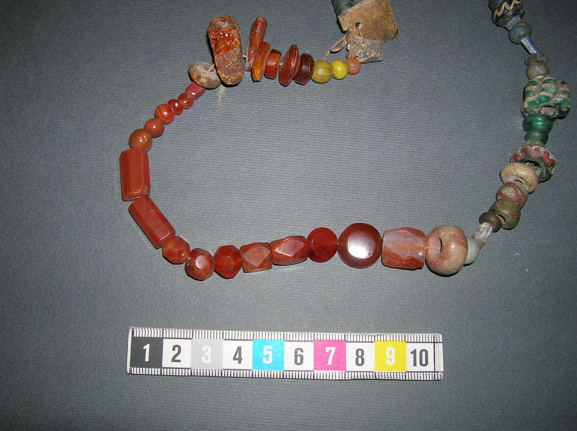 78 pärlor av karneol, bergkristall, bärnsten och glas uppträdda på snöre samman med en fragmentarisk tandplatta till enkelkam.