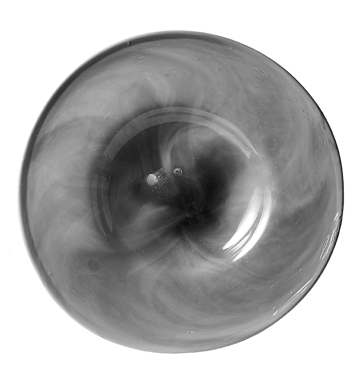 FAT (av s.k. agatglas). Tunnväggigt, genomfärgad i olikfärgade rökliknande vindlingar. Från mitten utgående diffusa slingor i blågrönt vilka blanda sig med dylika i brunröd, brunt, grått och gult. Massan halvgenomskinglig, vid genomfallande ljus övervägande brunröd. I massa ett antal blåsor, till större delen av långsmal form. Mitten rundad, nedsänkt med kullrigt uppstående botten på vars undersida en oval brottyta efter punteln. Brättet snett utstående samt med nedåt omviken ytterkant. Höjd: 3,3 - 3,5 cm, diameter: 24,5 - 25 cm. Från 1600-talet. Inköpt av WILHELMINA VON HALLWYL, f. KEMPE, 30 september 1897, hos Aktiebolaget H. BUKOWSKIS Konsthandel, Stockholm. Pris. 30 Kr.