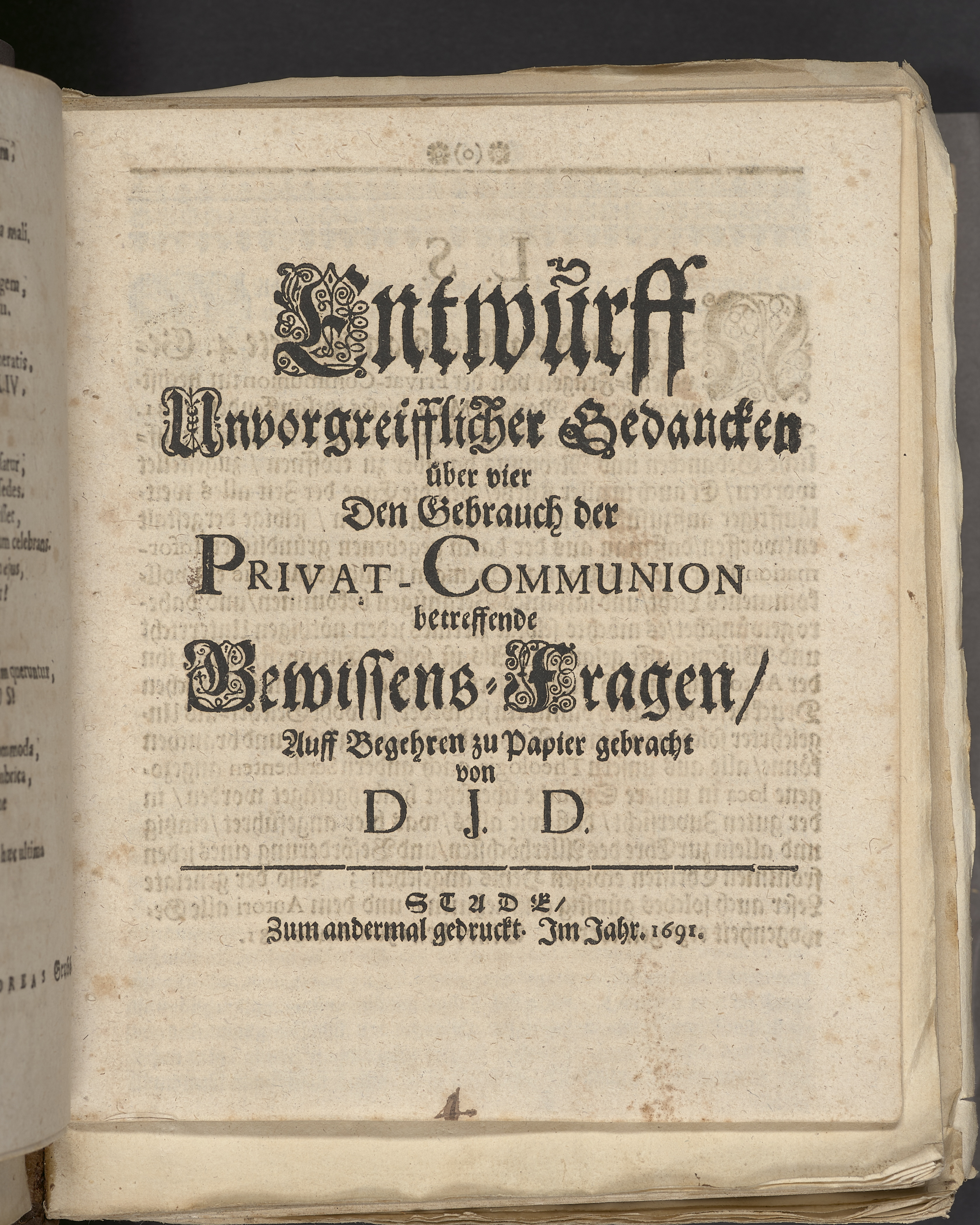 Entwurff unvorgreifflicher Gedancken über vier den Gebrauch der privat-communion betreffende Bewissens-Fragen ... von D. J. D. Stade, zum andermal gedruckt. Im Jahr 1691.