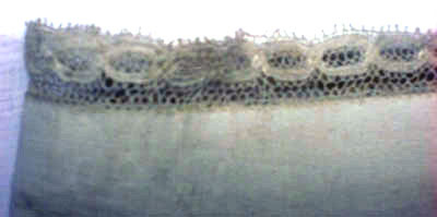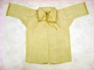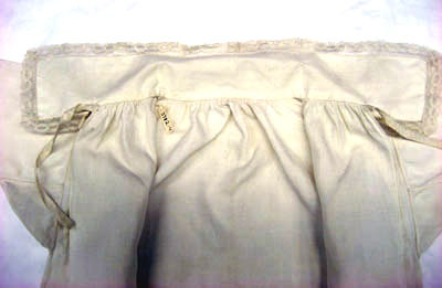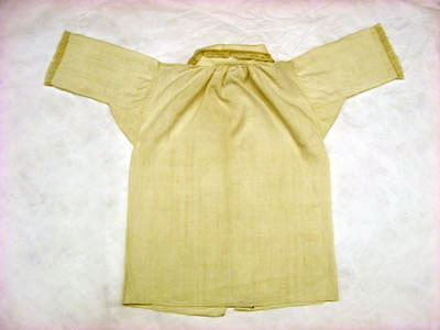 Barnskjorta i fint vävt linne. Skjortan har en rak skärning med raka ärmar sydda i ett stycke. Spetskant runt kragen samt som avslutning på varje ärm. Kragen knyts framtill med två stycken band , 15 mm långa och sju mm breda. På ryggen samt på framsidan är det rynkat vid kragen. Halsen har ingen rundning.