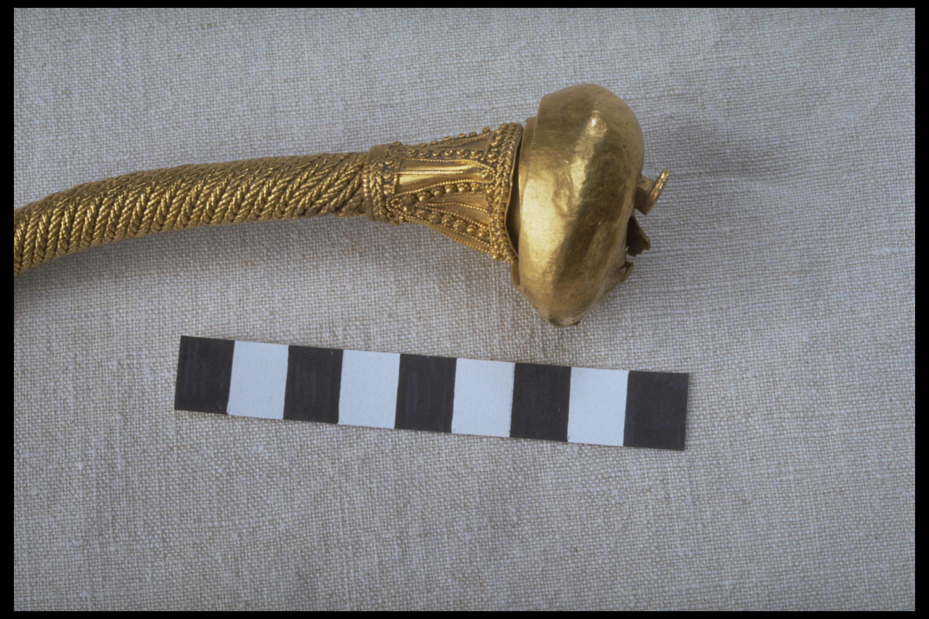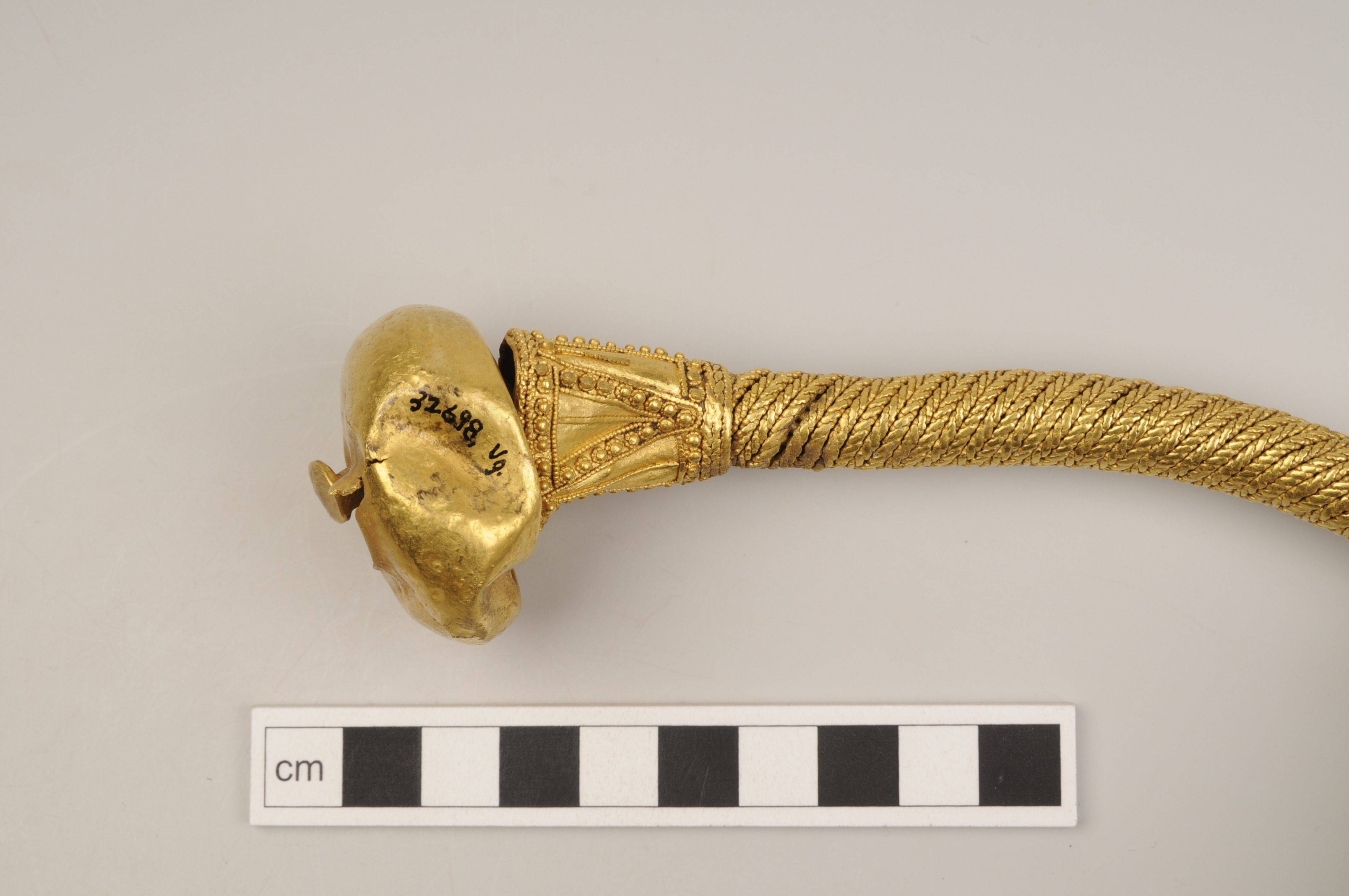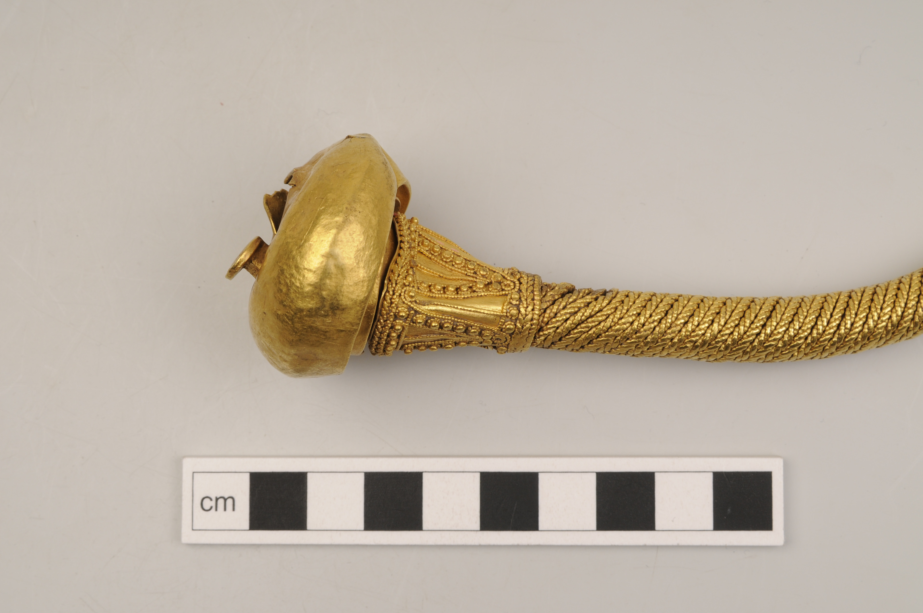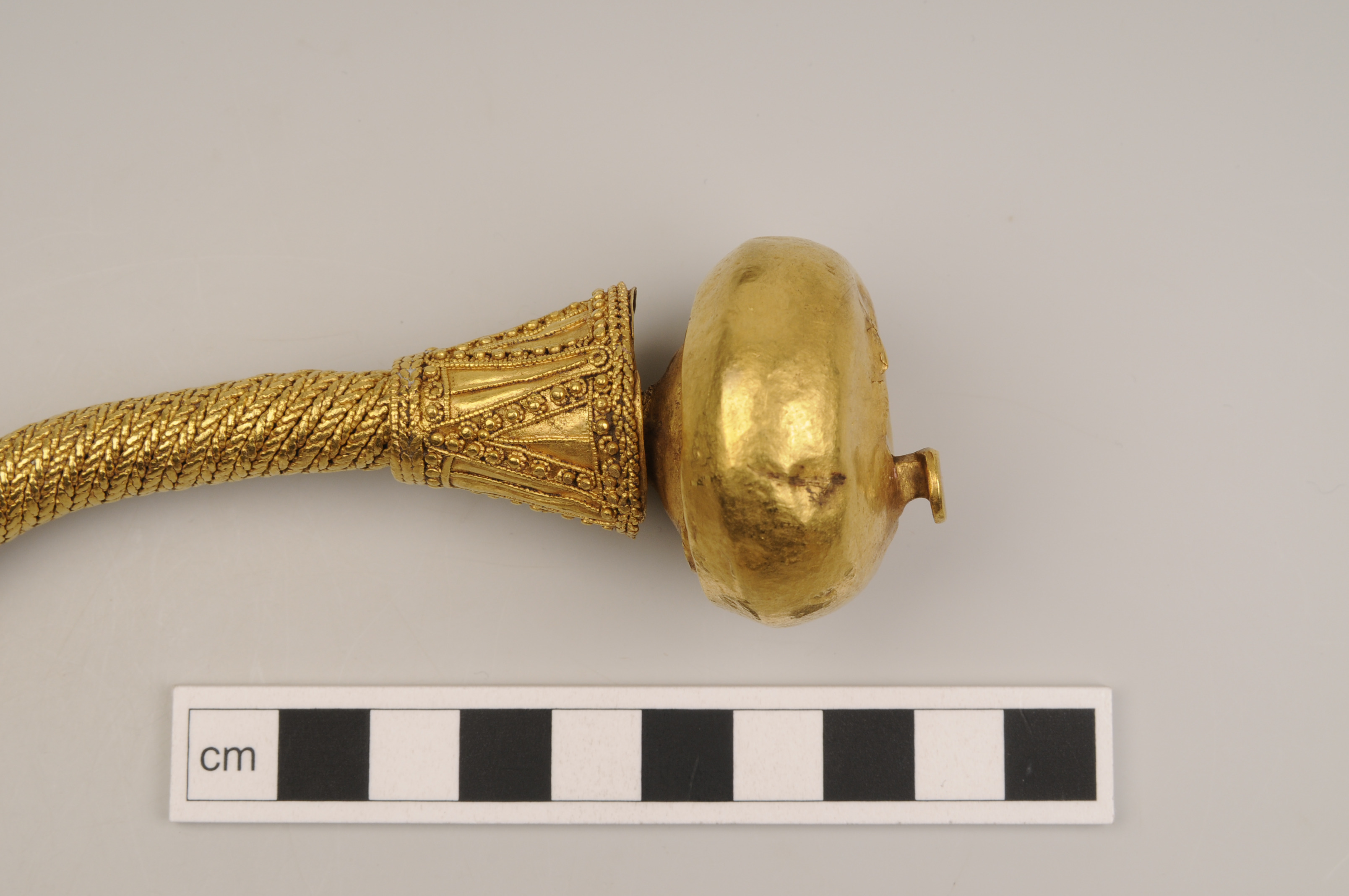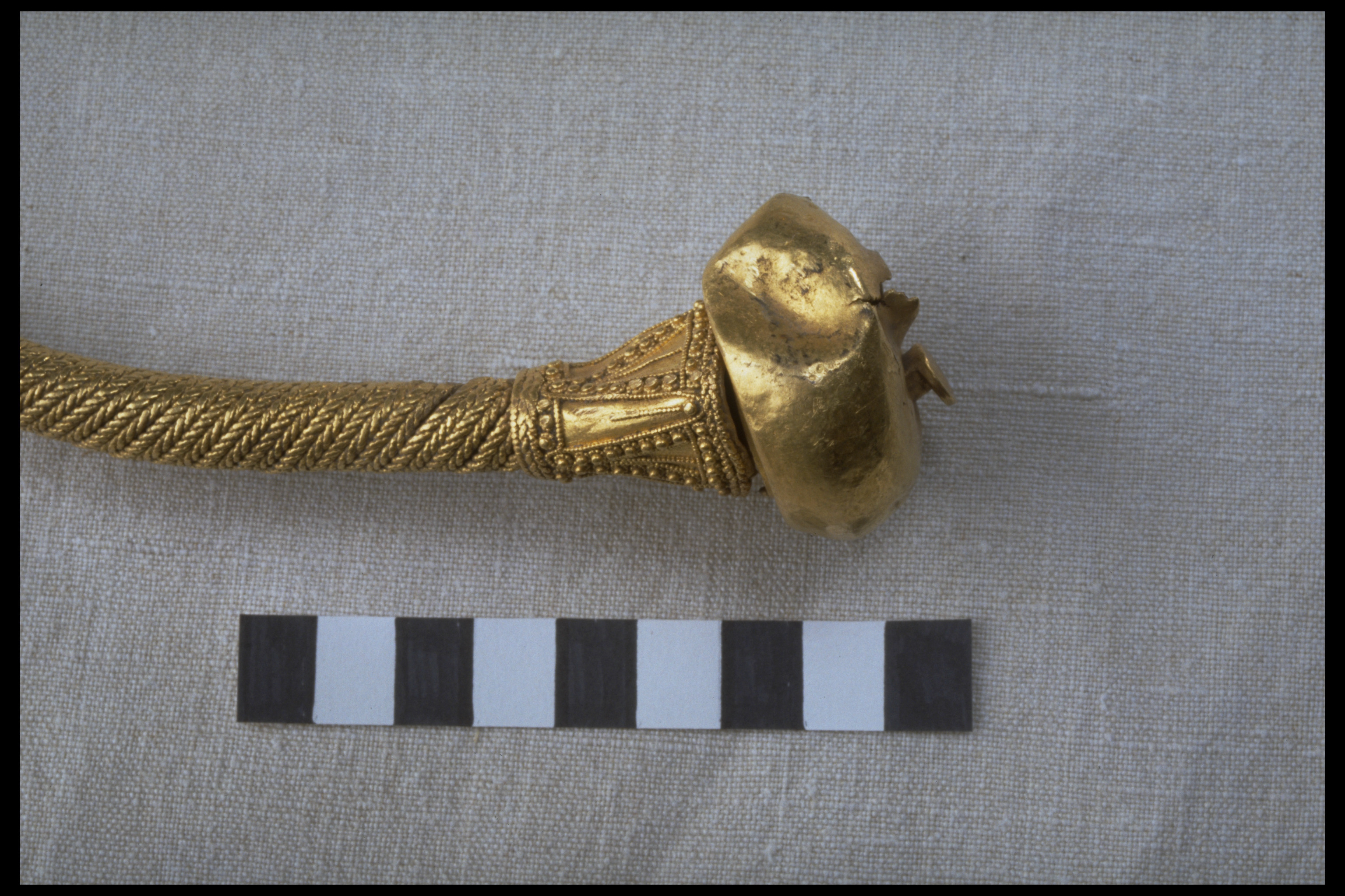 Stora, släta ändknoppar med låsanordning och de koniska manschetterna, som är dekorerade med små pålödda guldkorn (granulation) och tunna guldtrådar (filigran) i en växelverkan med släta ytor. Själva ringen är uppbyggd av ett knippe släta guldtenar som är täckta med pärlad och hinnad guldtråd i ett fiskbensmönster. Metallegering: 94% guld, 5% silver och 1% koppar (23 karat).