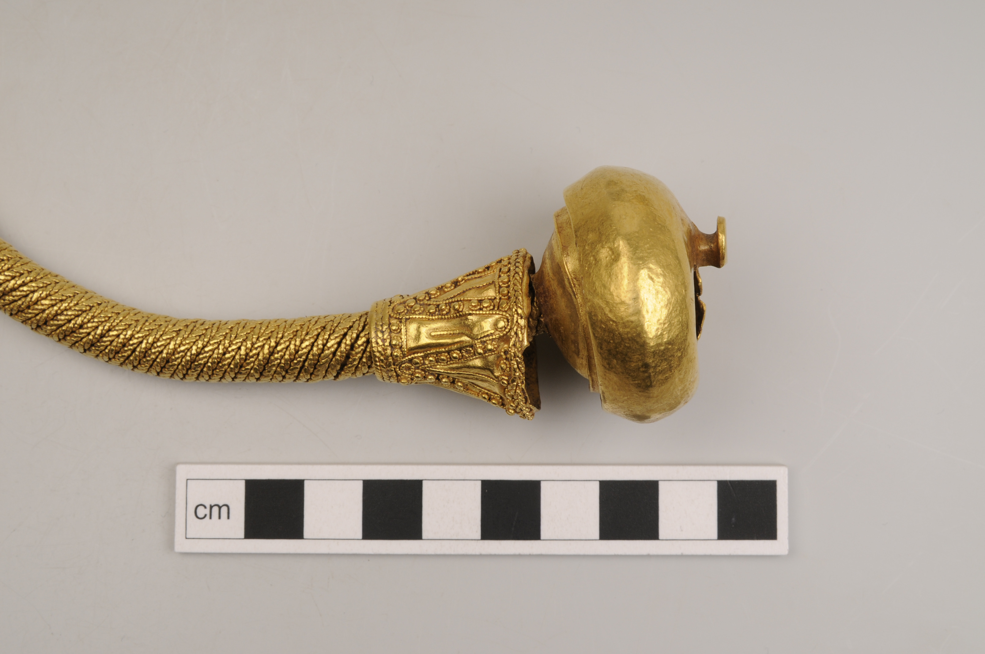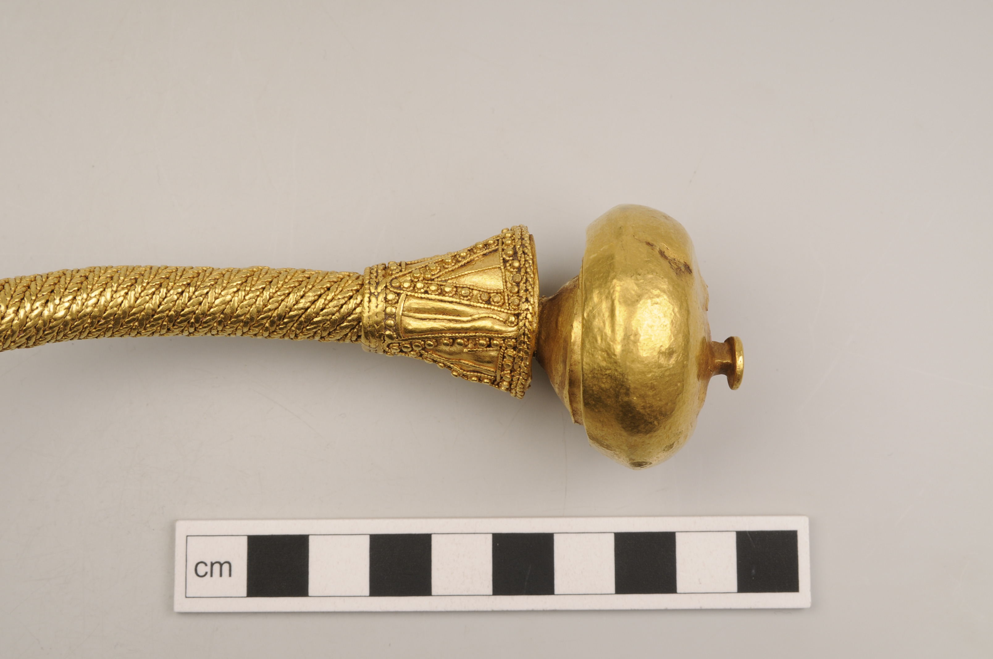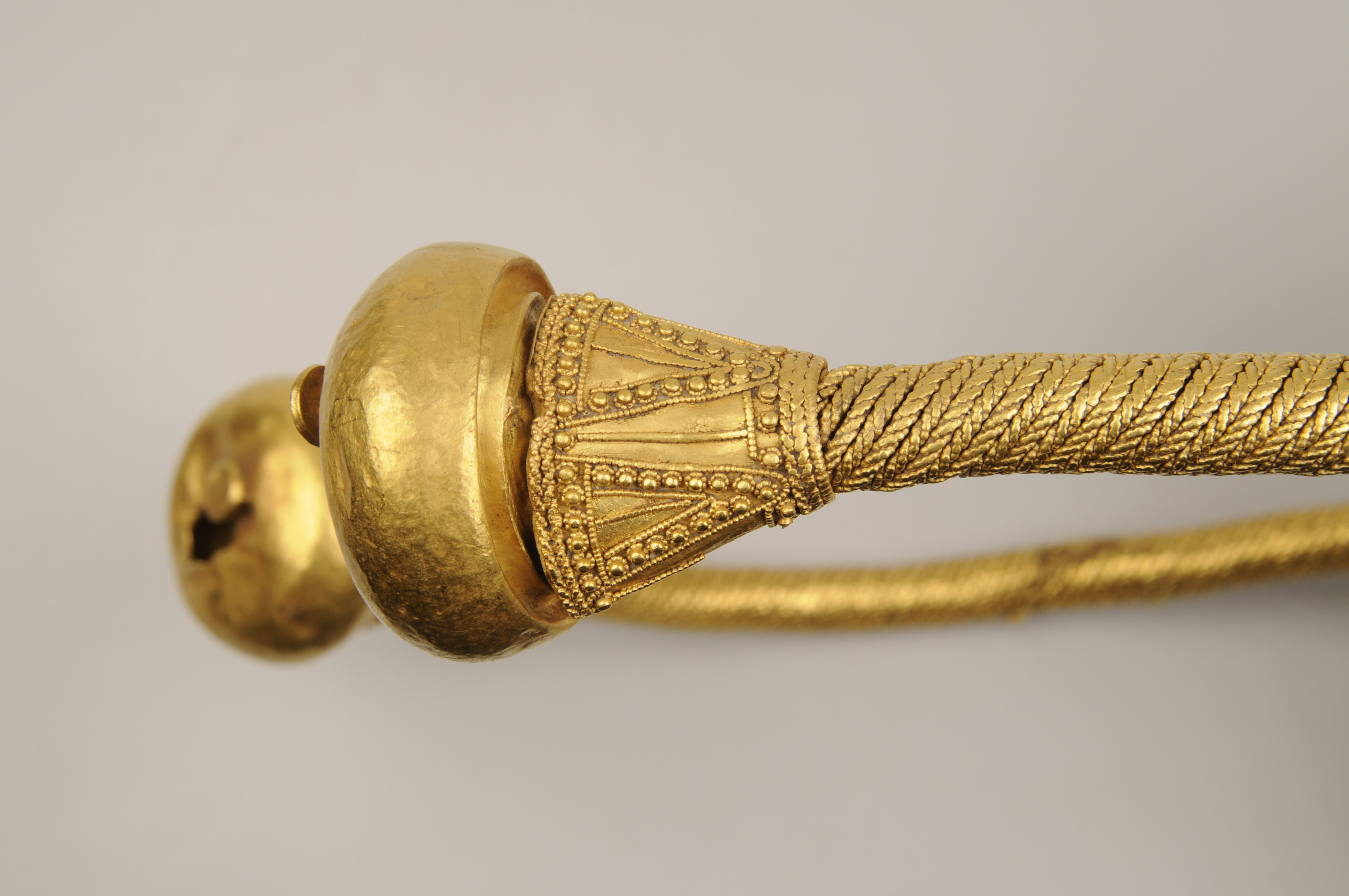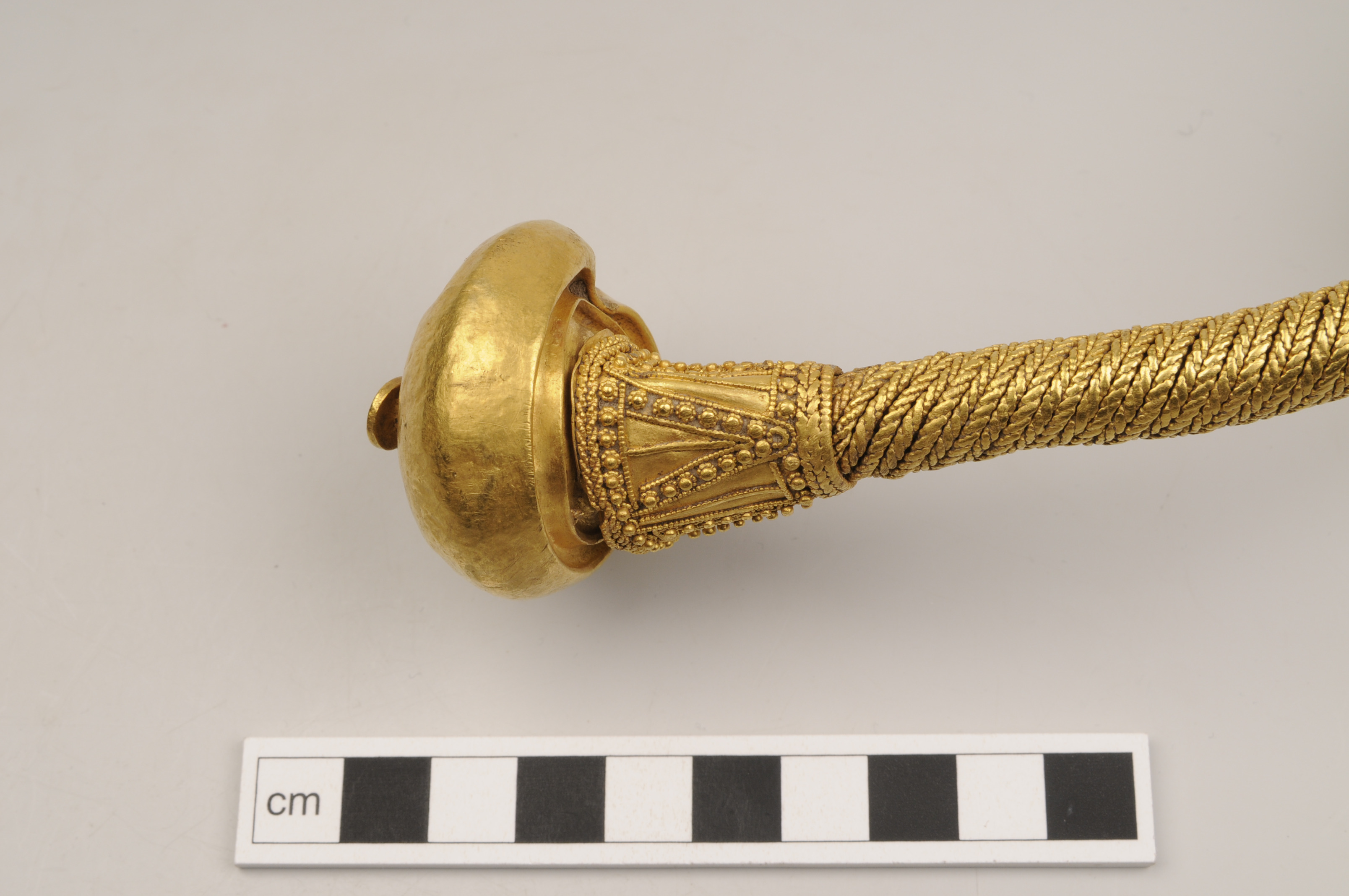 Stora, släta ändknoppar med låsanordning och de koniska manschetterna, som är dekorerade med små pålödda guldkorn (granulation) och tunna guldtrådar (filigran) i en växelverkan med släta ytor. Själva ringen är uppbyggd av ett knippe släta guldtenar som är täckta med pärlad och hinnad guldtråd i ett fiskbensmönster. Metallegering: 94% guld, 5% silver och 1% koppar (23 karat).
