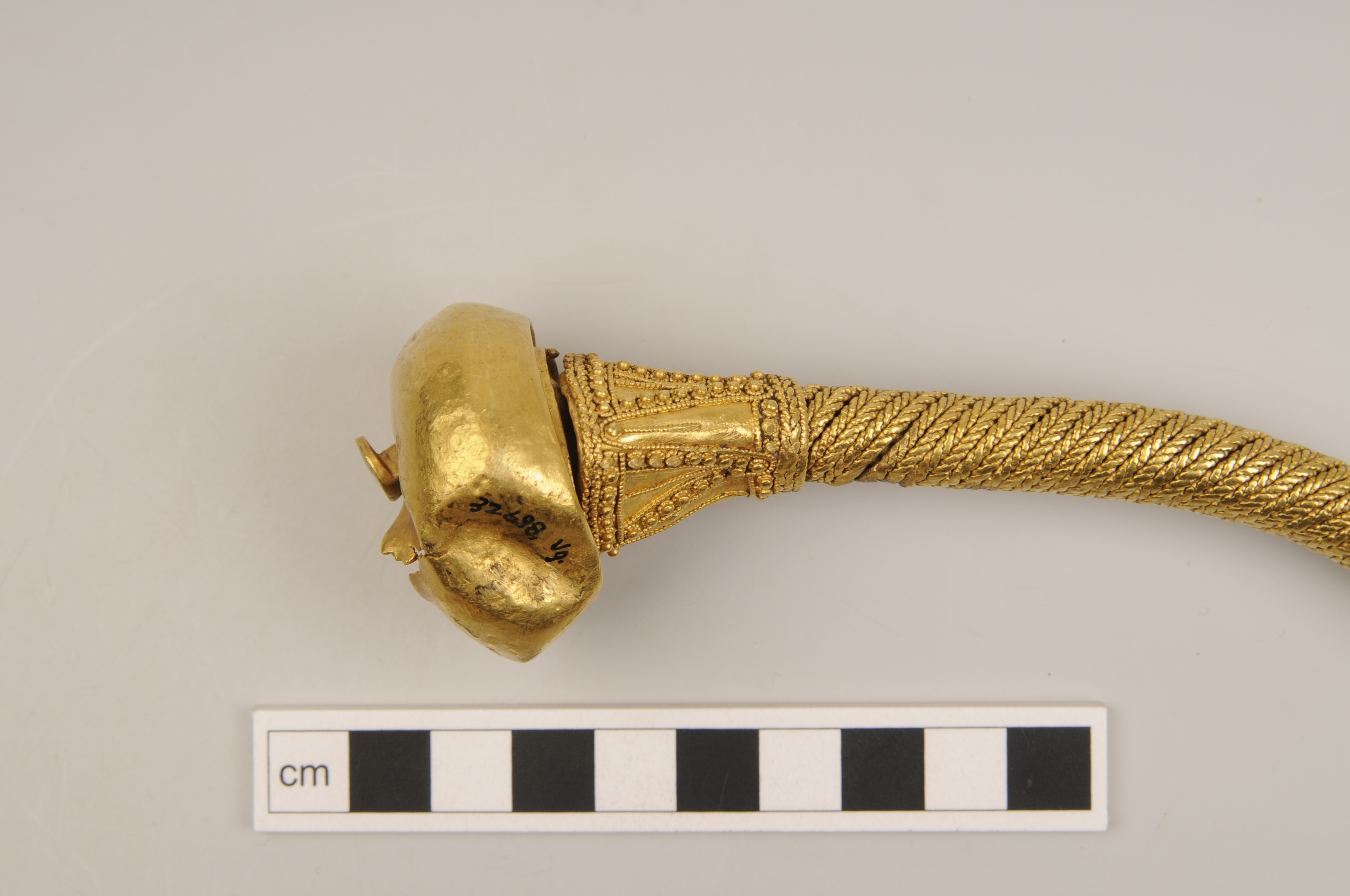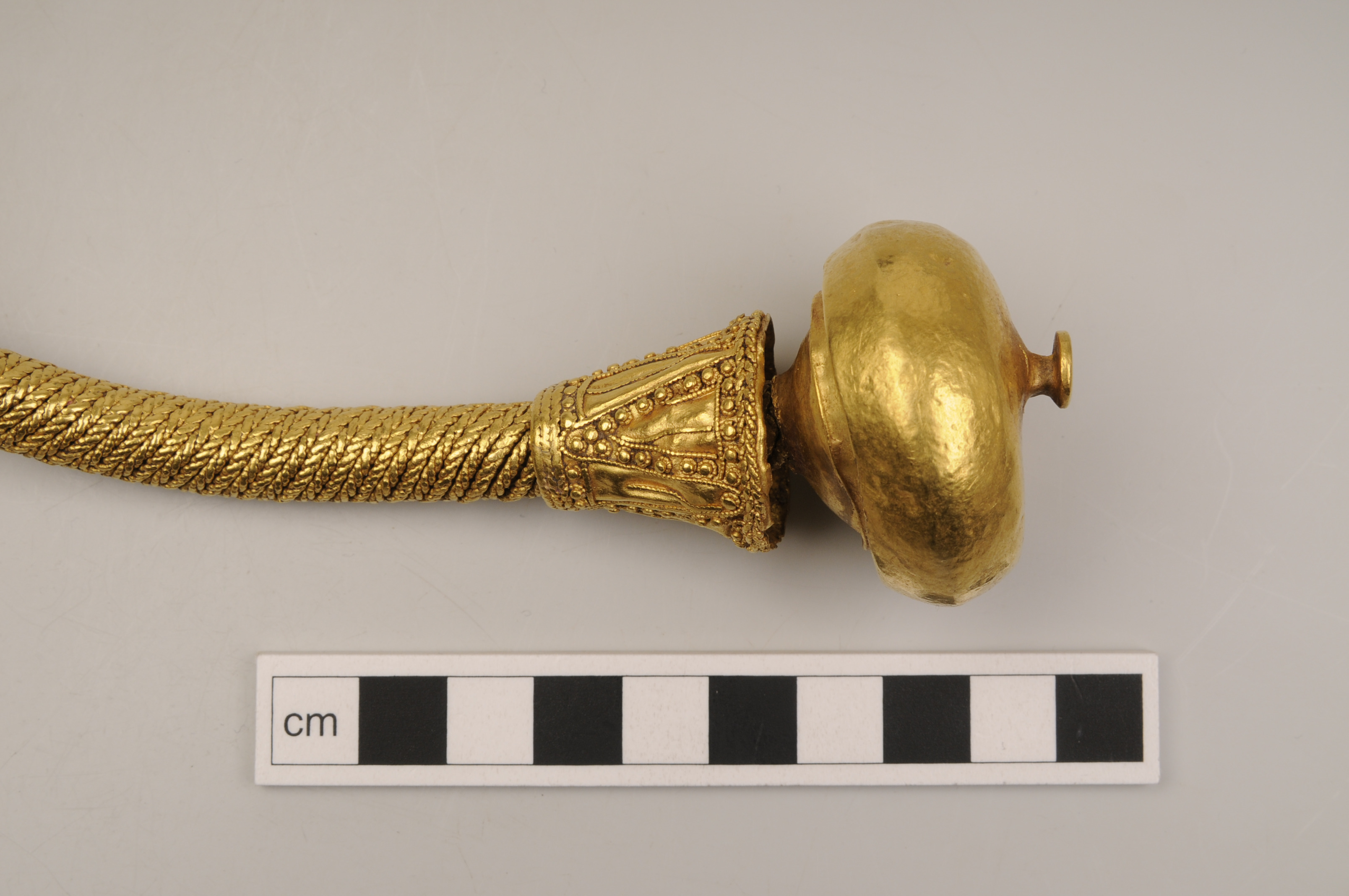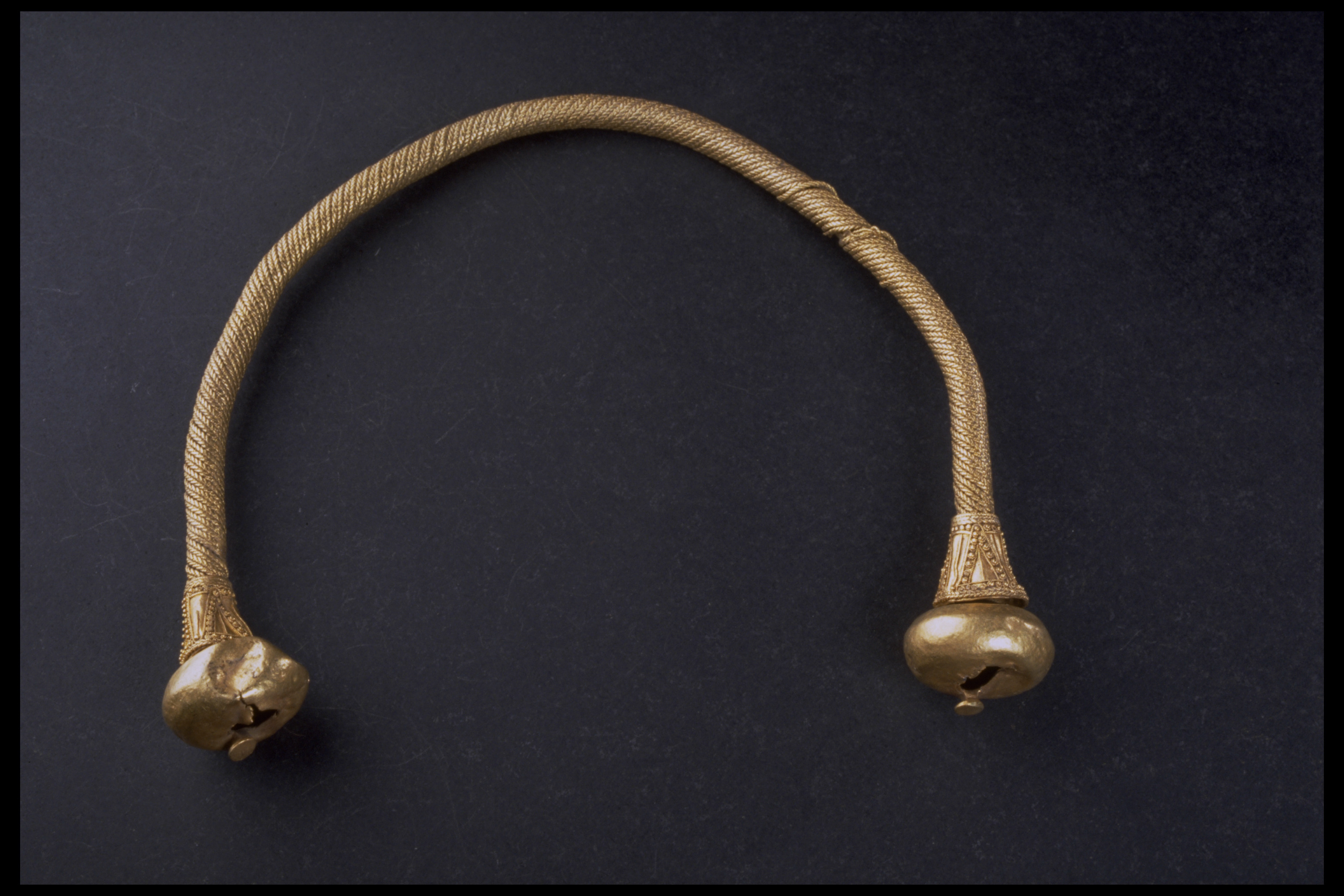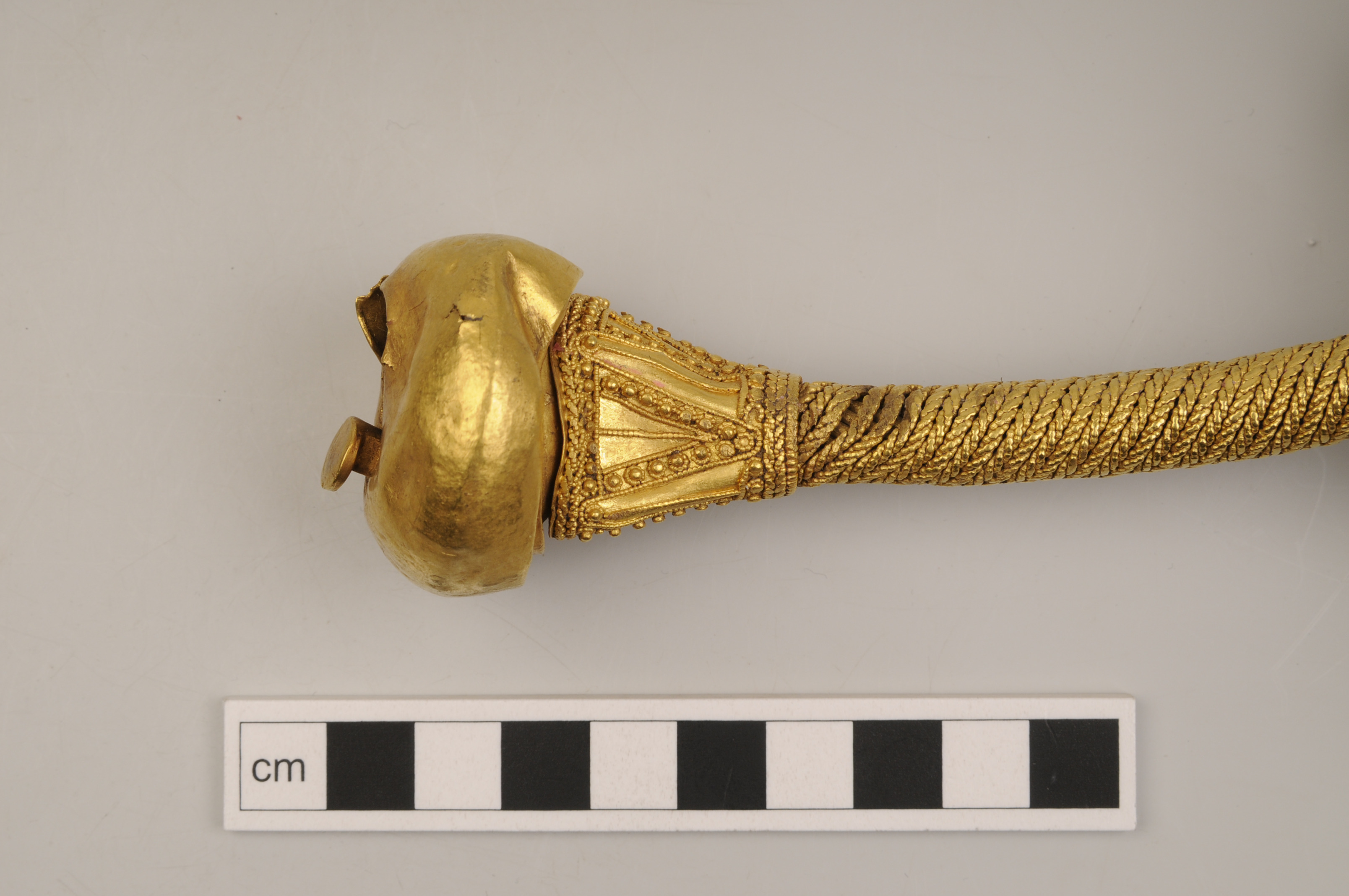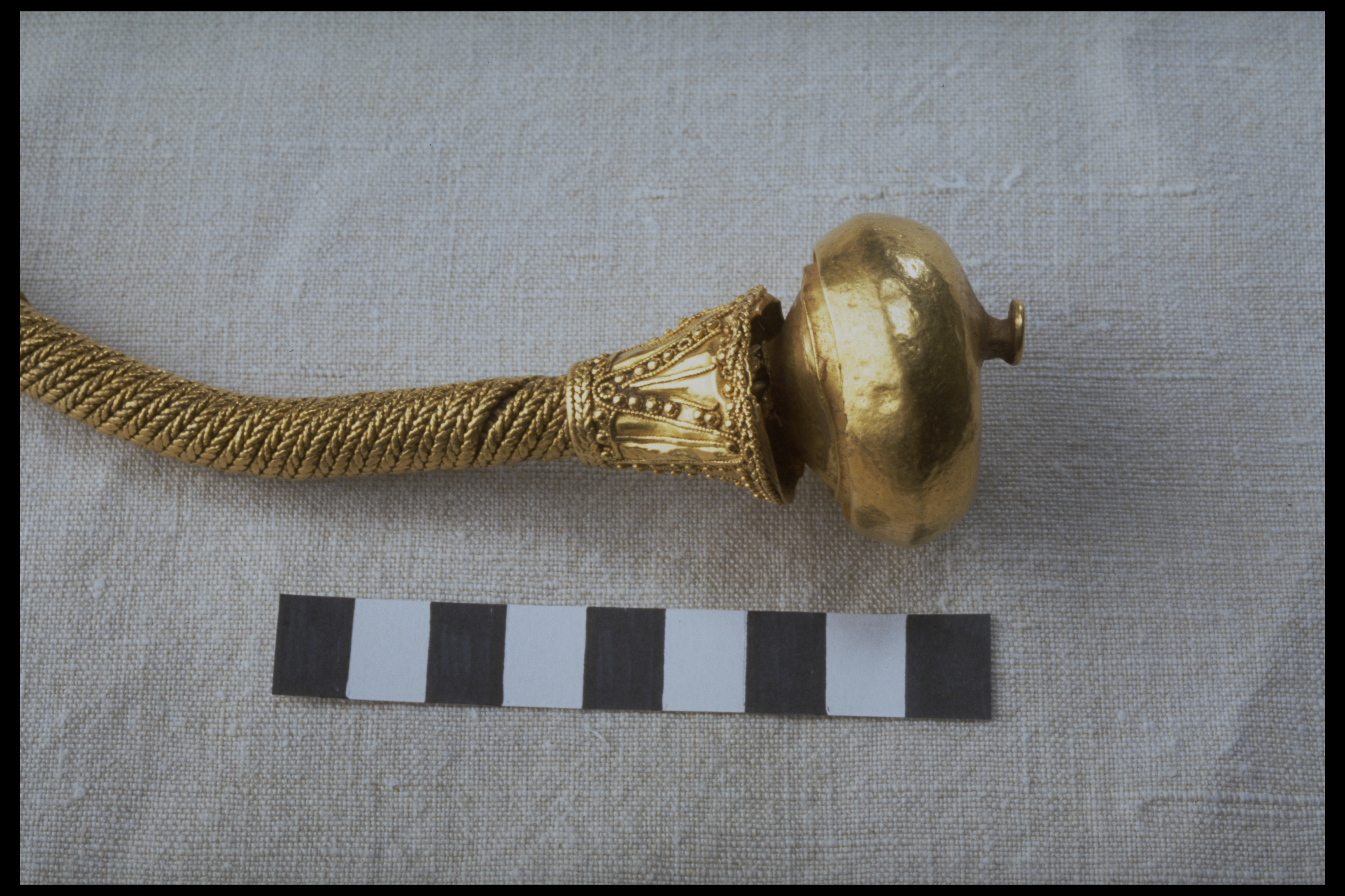Stora, släta ändknoppar med låsanordning och de koniska manschetterna, som är dekorerade med små pålödda guldkorn (granulation) och tunna guldtrådar (filigran) i en växelverkan med släta ytor. Själva ringen är uppbyggd av ett knippe släta guldtenar som är täckta med pärlad och hinnad guldtråd i ett fiskbensmönster. Metallegering: 94% guld, 5% silver och 1% koppar (23 karat).