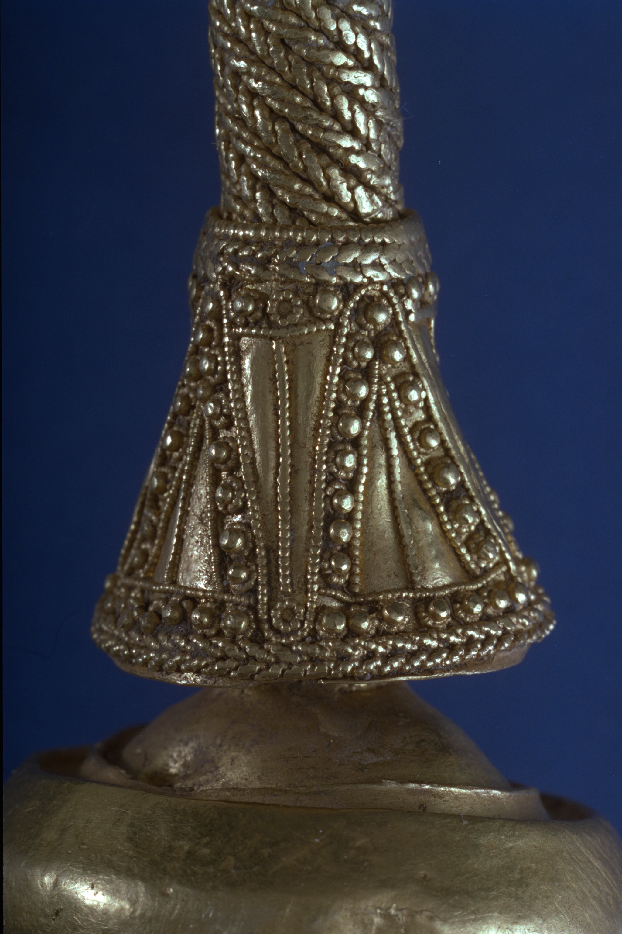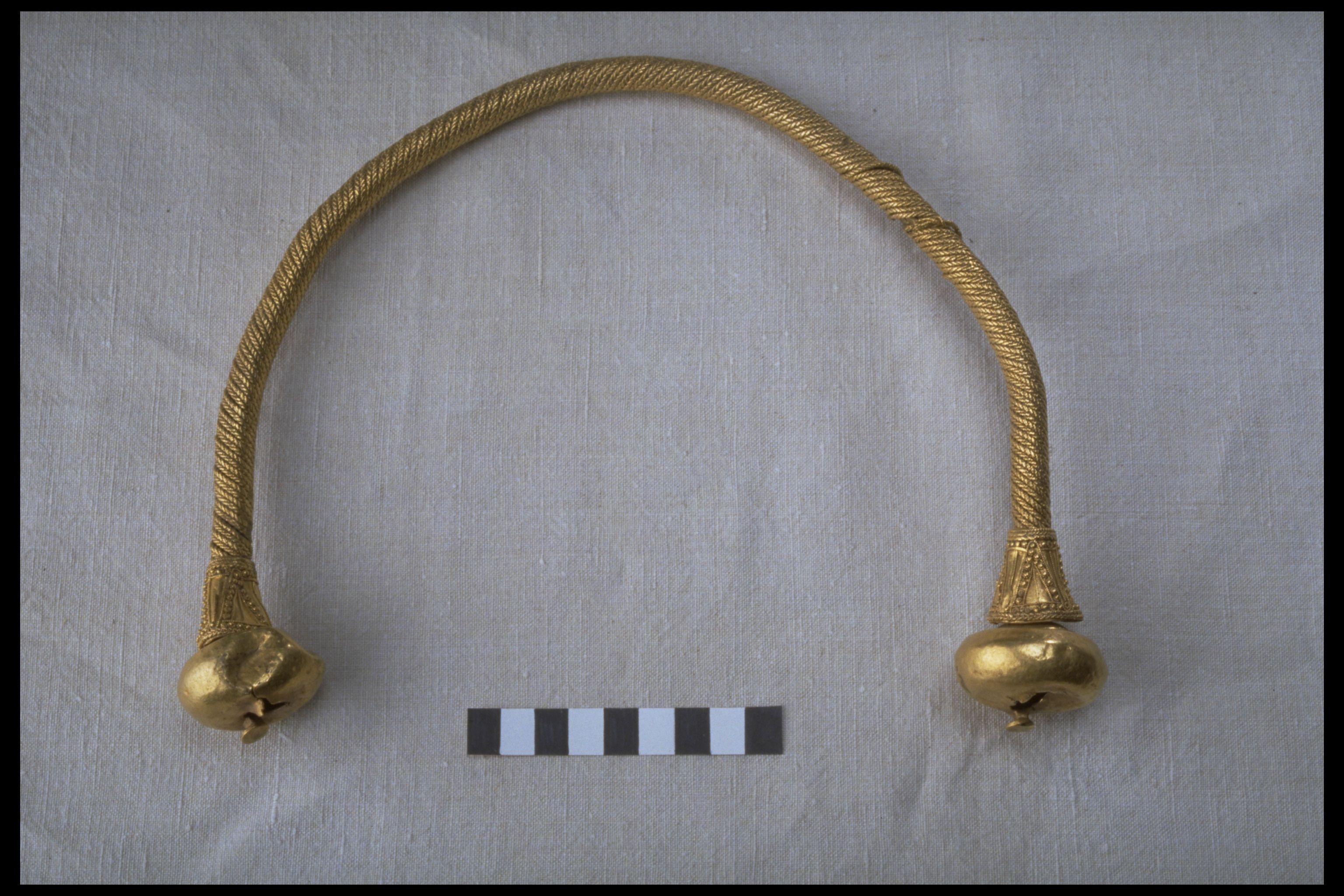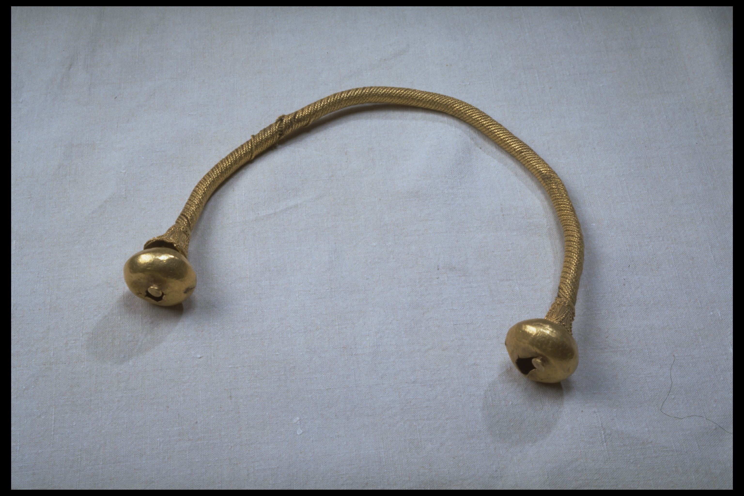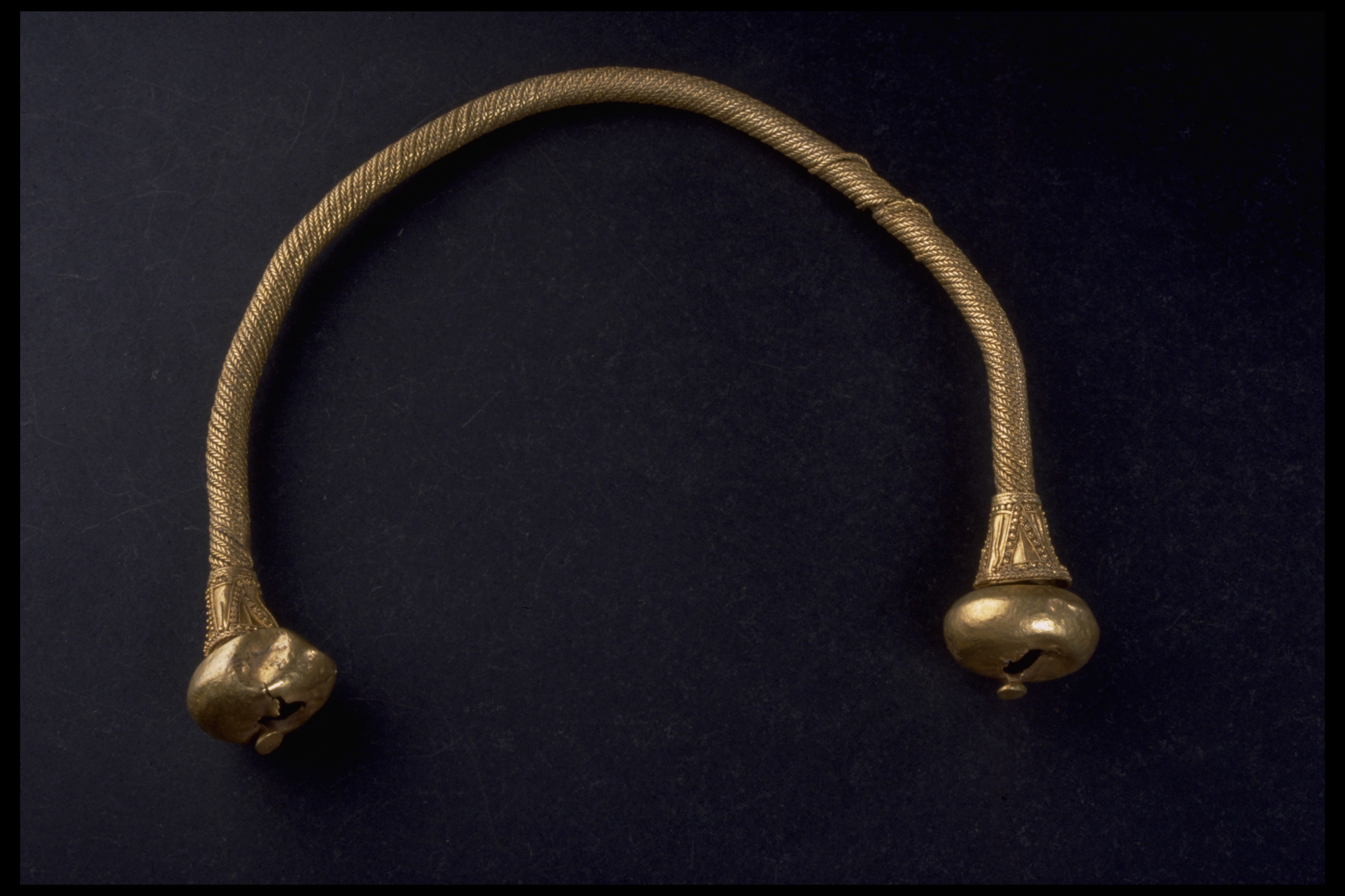 Stora, släta ändknoppar med låsanordning och de koniska manschetterna, som är dekorerade med små pålödda guldkorn (granulation) och tunna guldtrådar (filigran) i en växelverkan med släta ytor. Själva ringen är uppbyggd av ett knippe släta guldtenar som är täckta med pärlad och hinnad guldtråd i ett fiskbensmönster. Metallegering: 94% guld, 5% silver och 1% koppar (23 karat).