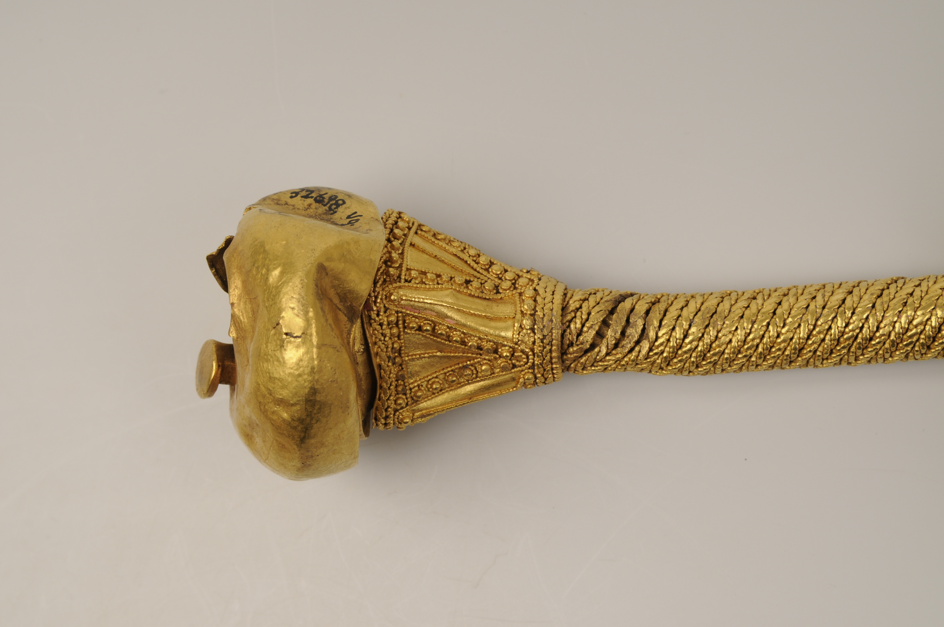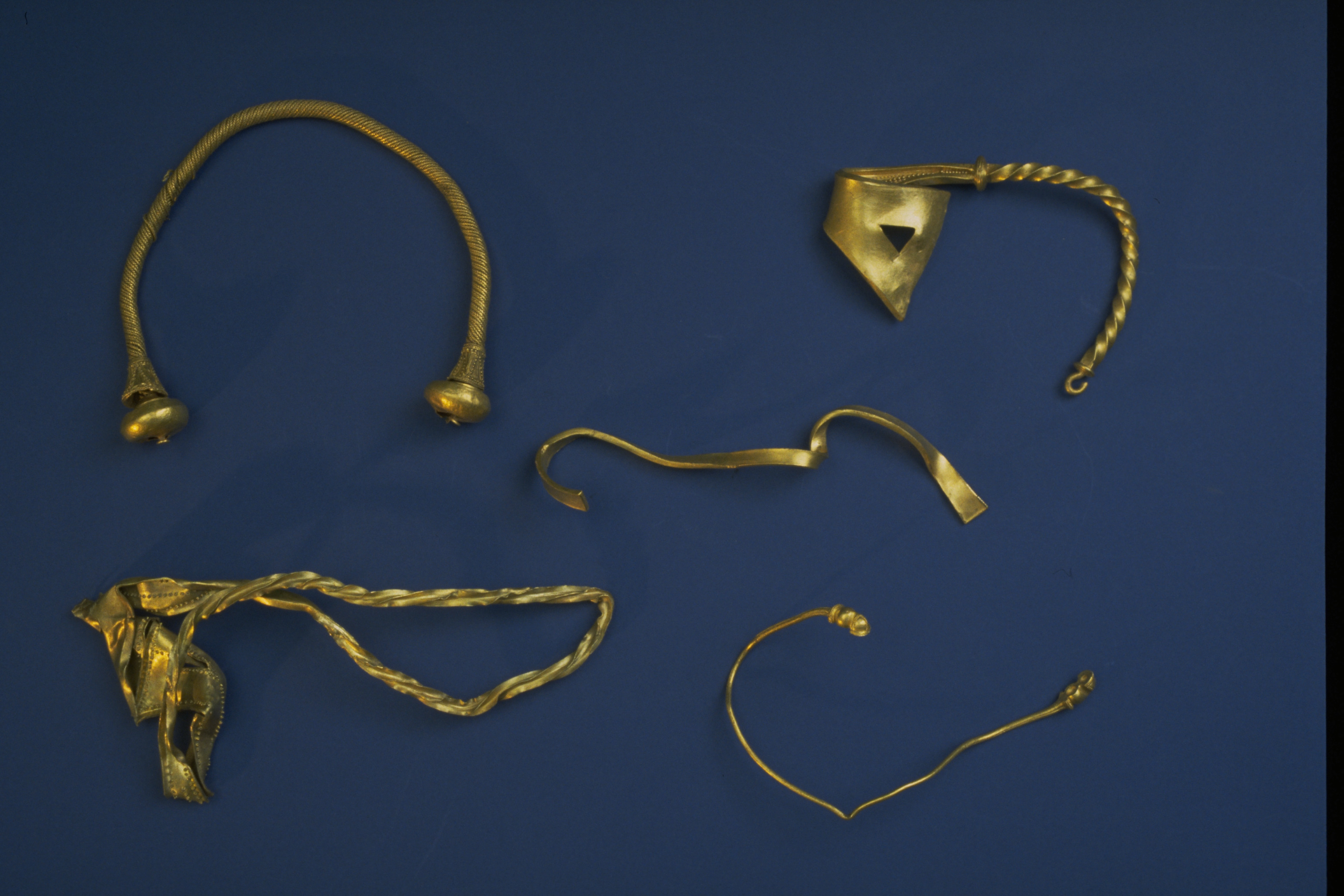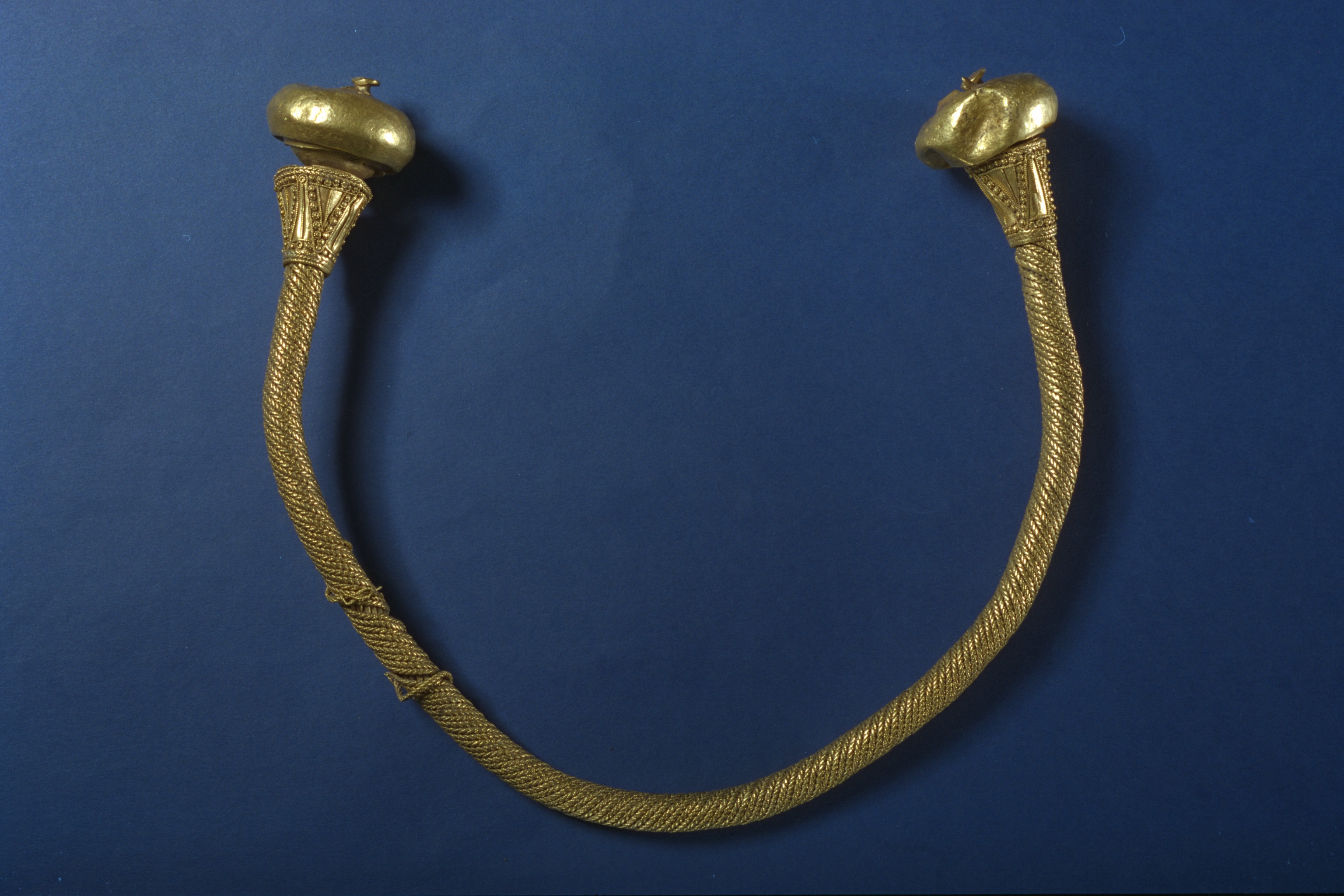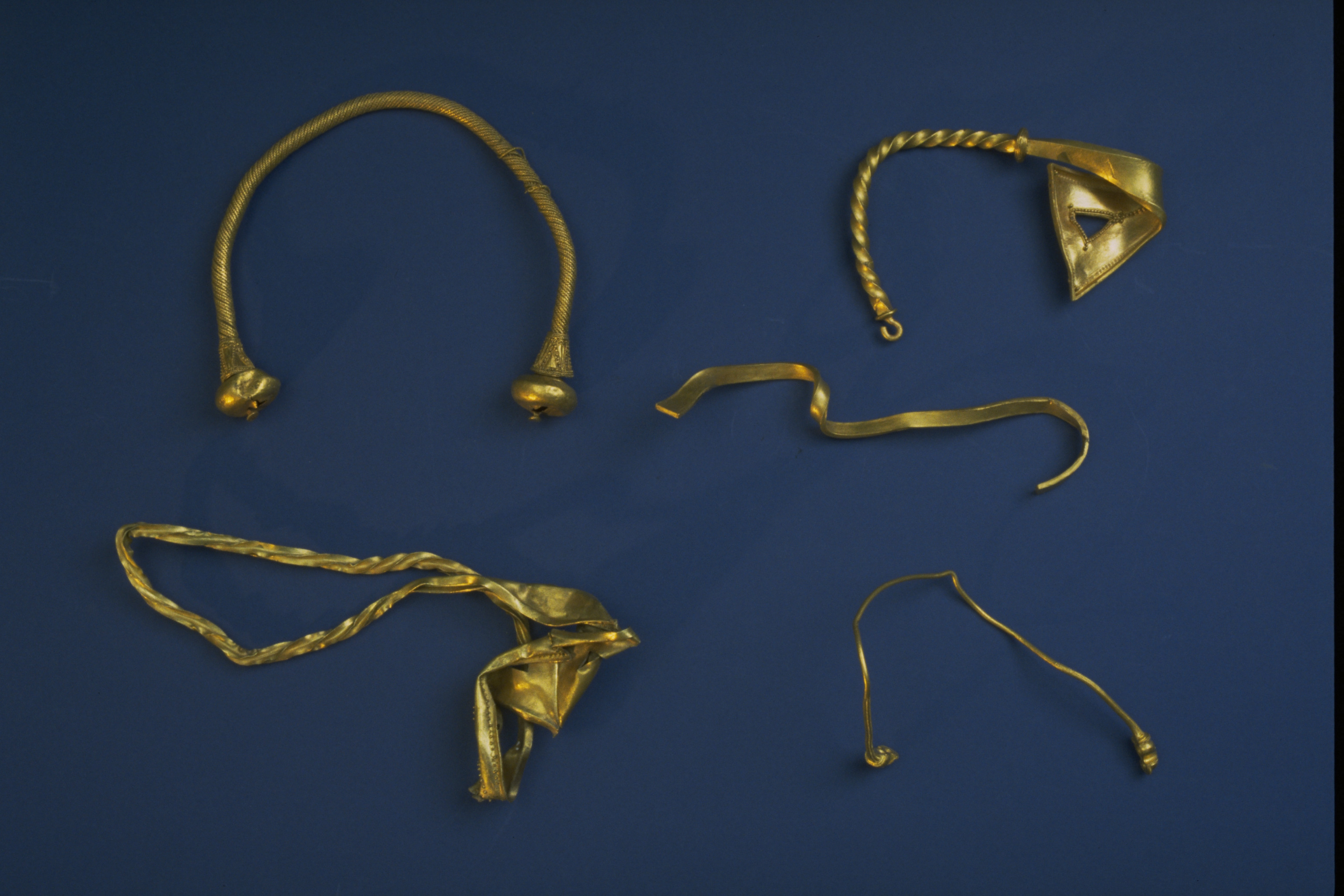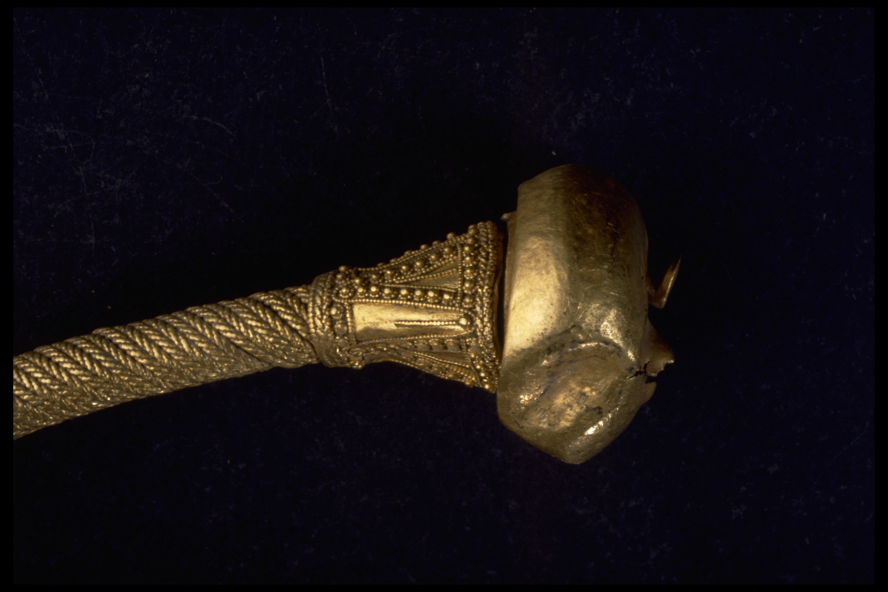 Stora, släta ändknoppar med låsanordning och de koniska manschetterna, som är dekorerade med små pålödda guldkorn (granulation) och tunna guldtrådar (filigran) i en växelverkan med släta ytor. Själva ringen är uppbyggd av ett knippe släta guldtenar som är täckta med pärlad och hinnad guldtråd i ett fiskbensmönster. Metallegering: 94% guld, 5% silver och 1% koppar (23 karat).