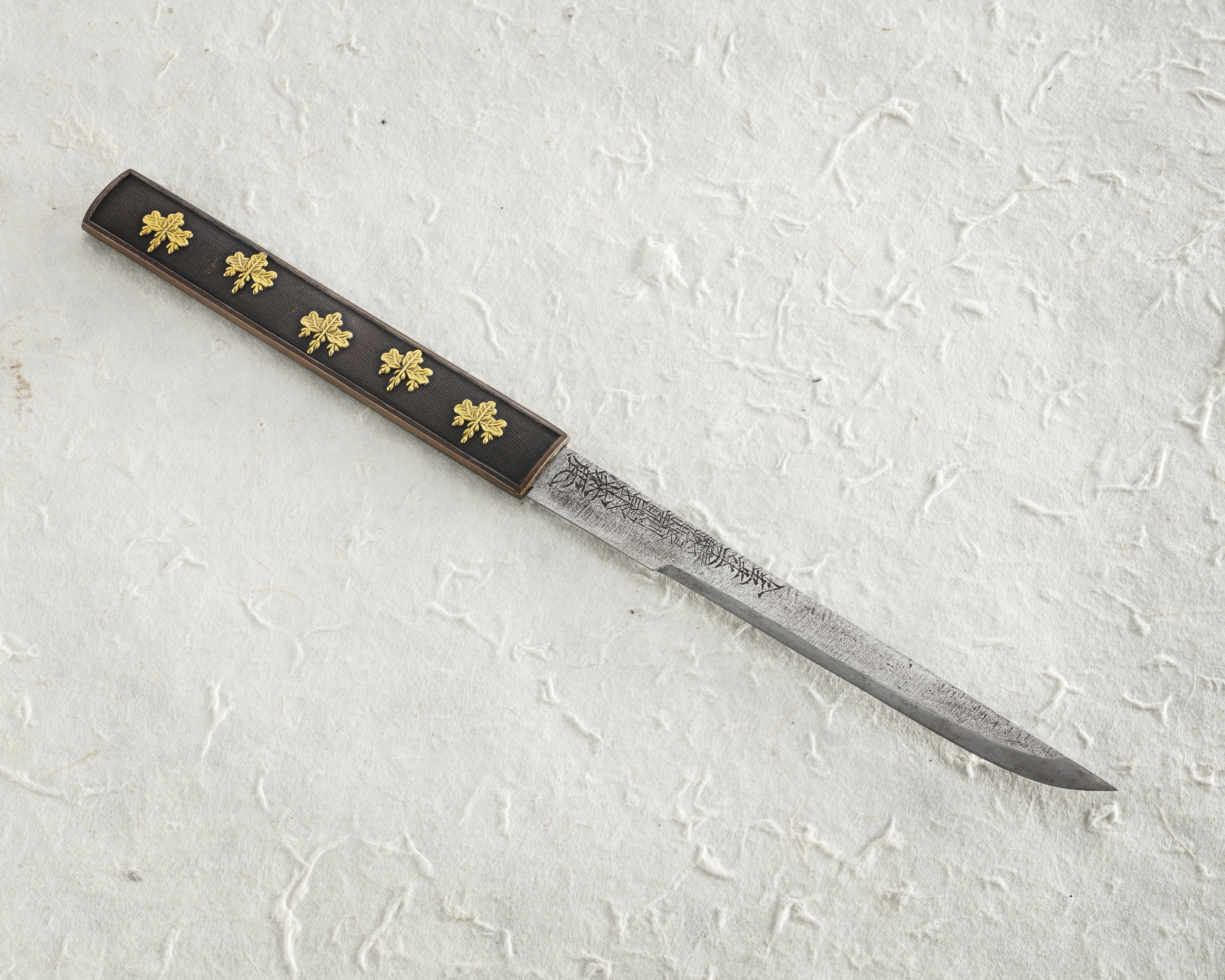 Kniv (KOZUKA). Japan, 1690-tal. Skaft med plant, rektangulärt tvärsnitt av mörkanlöpt koppar. På ena sidan punsat fält med fem förgyllda blomornament. Rakt, eneggat blad, eggen slipad intill 26 mm från basen. Utmed ryggen på utsidan japanska skrifttecken. Deponerad på Etnografiska museet. EM 1889.04.1490.