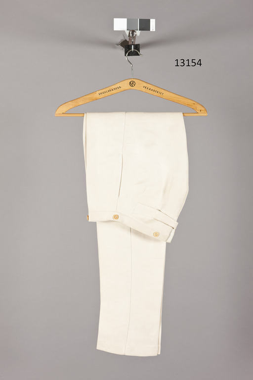 Byxor av naturfärgat linne vävt i panamateknik. Gylf med tre benvita knappar, diam: 14 mm, samt enslejf med två knappar mellan linnig och gylf. I linningen en större knapp, diam: 17 mm, med texten:"Steinnuss )) Hosenknupf". I övrigt sex knappar ilinningen. Bak i livet sprund vilket kan hopdragasmed spänntampar och rektangulär sölja av gulmetall med ordet: "PARIS". Sidosömsfickor. Raka ben utanslag. Fickor samt foder i linningen av vit bomull. Gustav V blev rysk amiral 1908. Skänkt av Gustav V:s arvingar, genom Hovmarskalksämbetet.