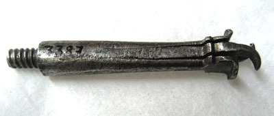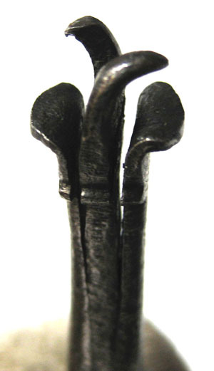 Helt i mörkt smitt stål. Koniska slät hals, nertill smalare med gängning, l 8 mm. Upptill kluven i två bredare blad med övre kanten vinklad utåt. Mellan dessa ett insmitt stål, upptill format till två utåt svängda spetsar.
