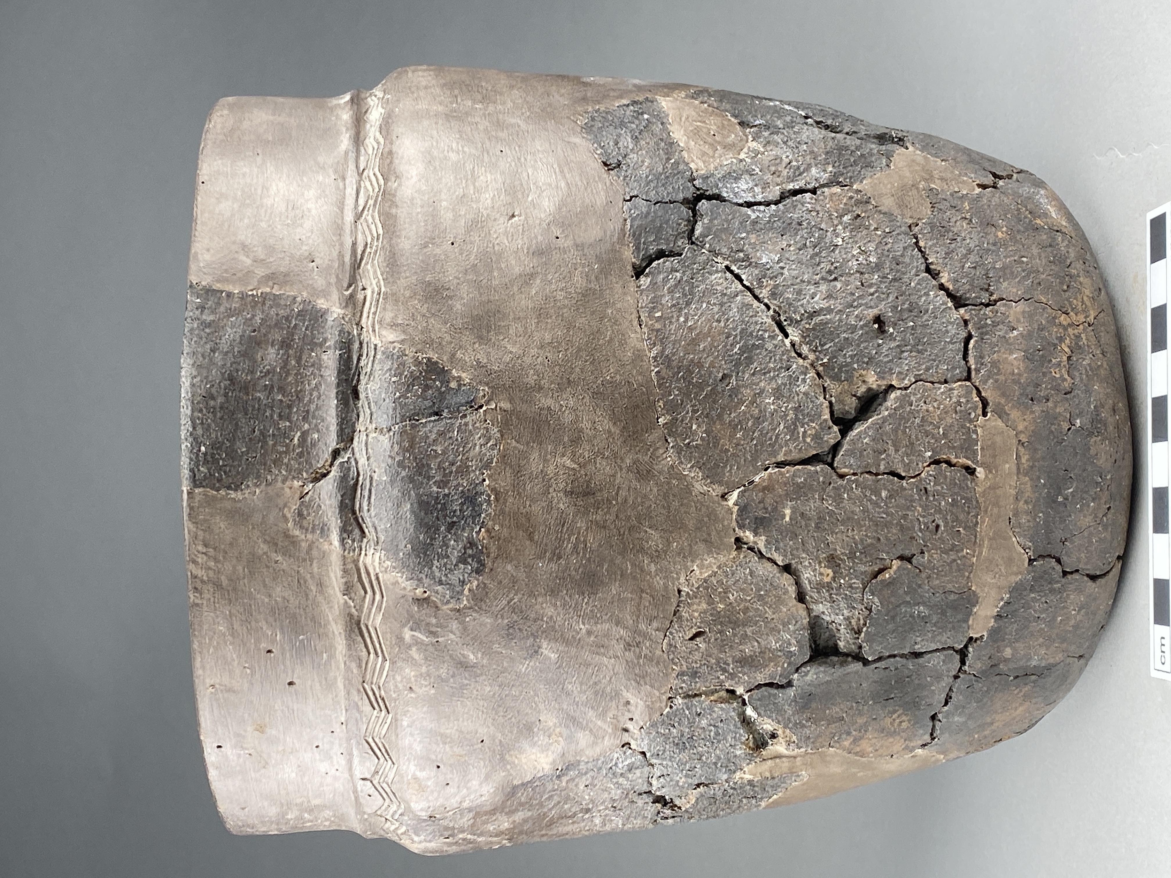 Delvis rekonstruerat kärl med rak mynning. Dekorerad med sicksacklinjer och en vulst nedanför mynningen. AIII-keramik