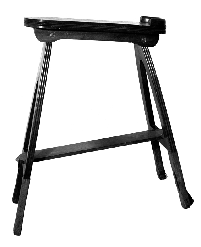 SKOSNÖRNINGSPALL (toilettrummet). Av björk. Avlång, med fyra ben, sidostycken och skiva. Benen snett utstående och utskurna två och två i ett fotstycke, detta med något konturerade ytterkanter varpå tre längsgående stavar, ena fotstycket något kortare så att skivan blir lutande. Skivan avlång, plan med något insvängda sidokanter och rundade ändar. Benen nertill skodda med rödfärgat skinn. Förvärvat av Wilhelmina von Hallwyl före år 1900 på obekant sätt.
