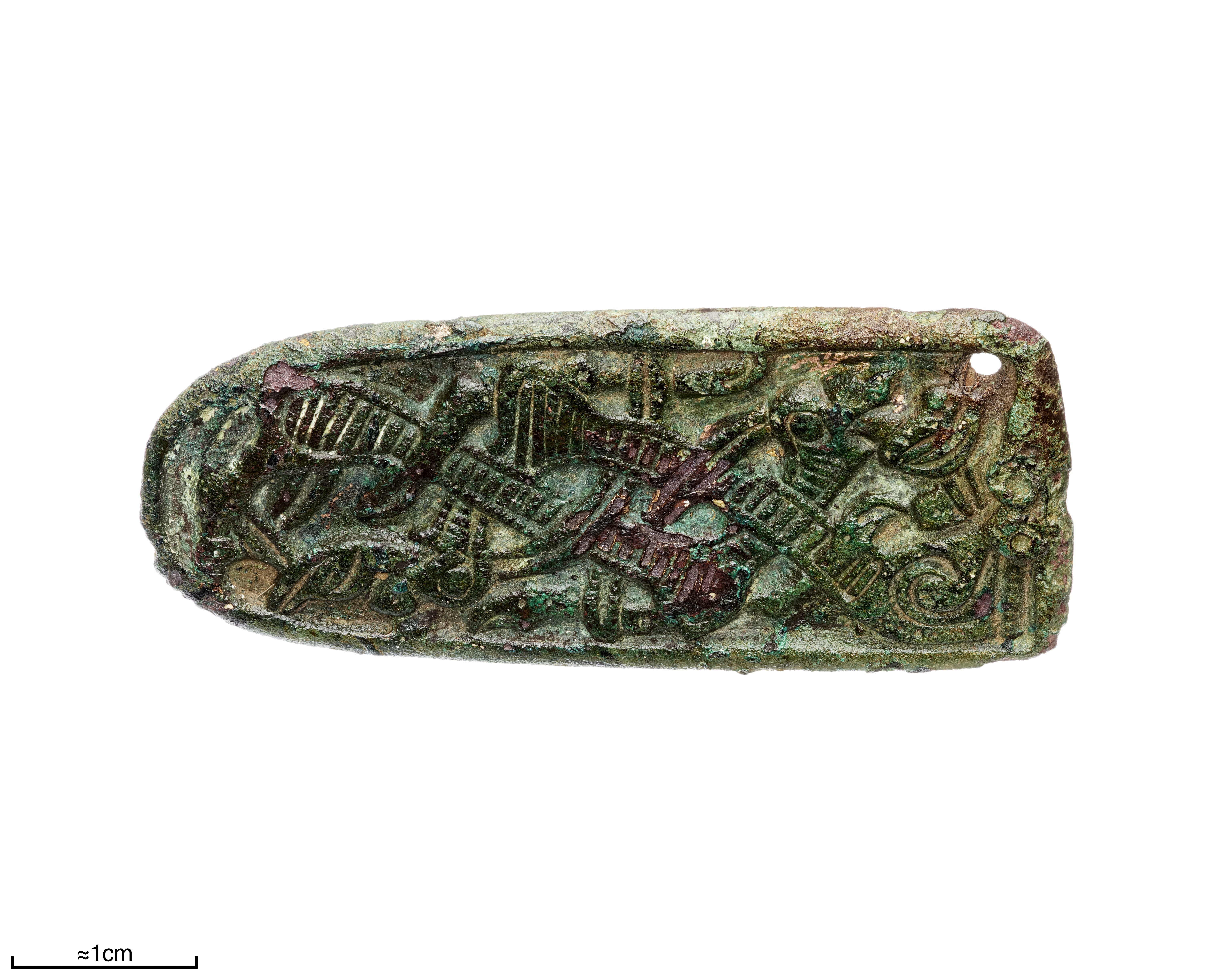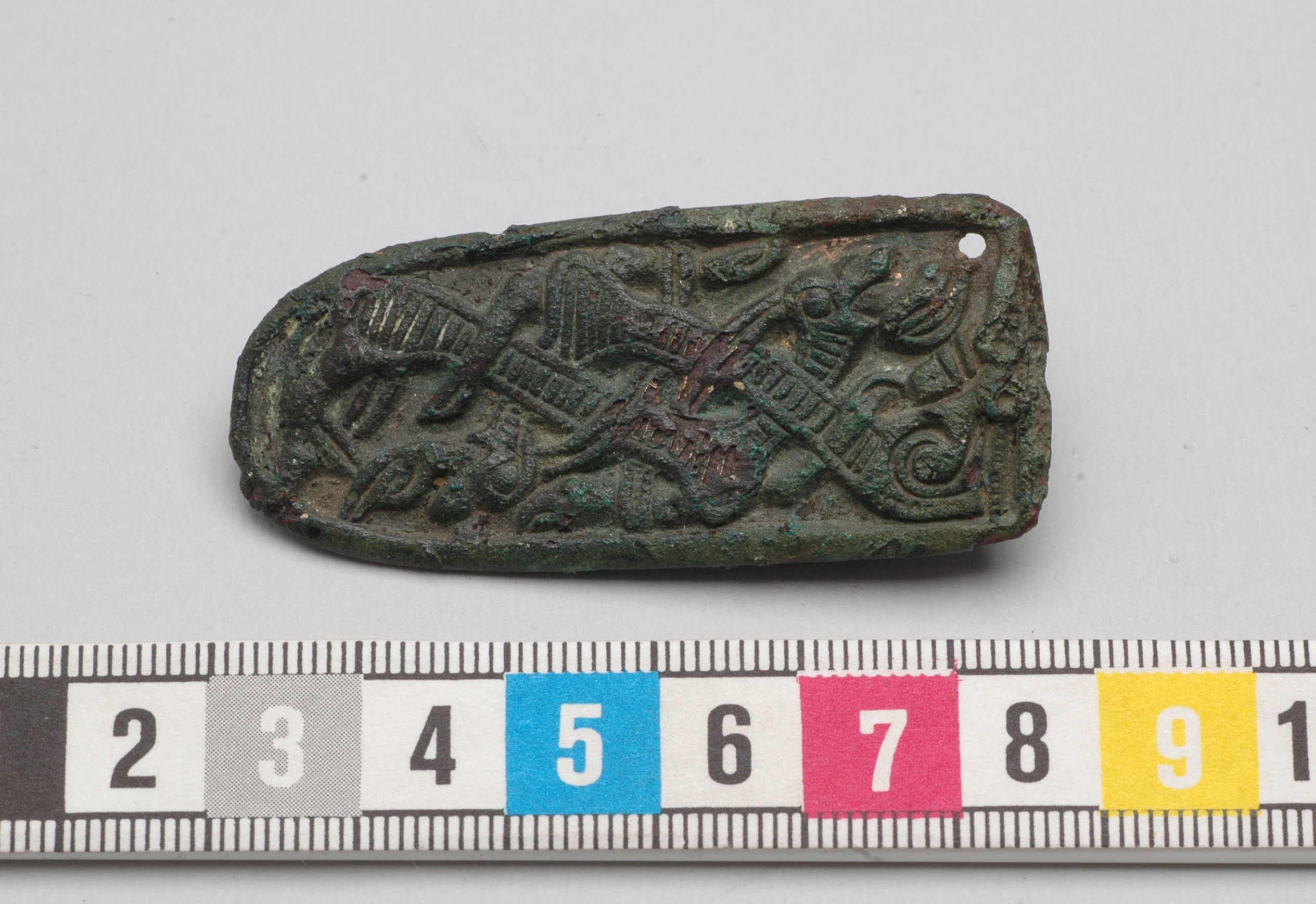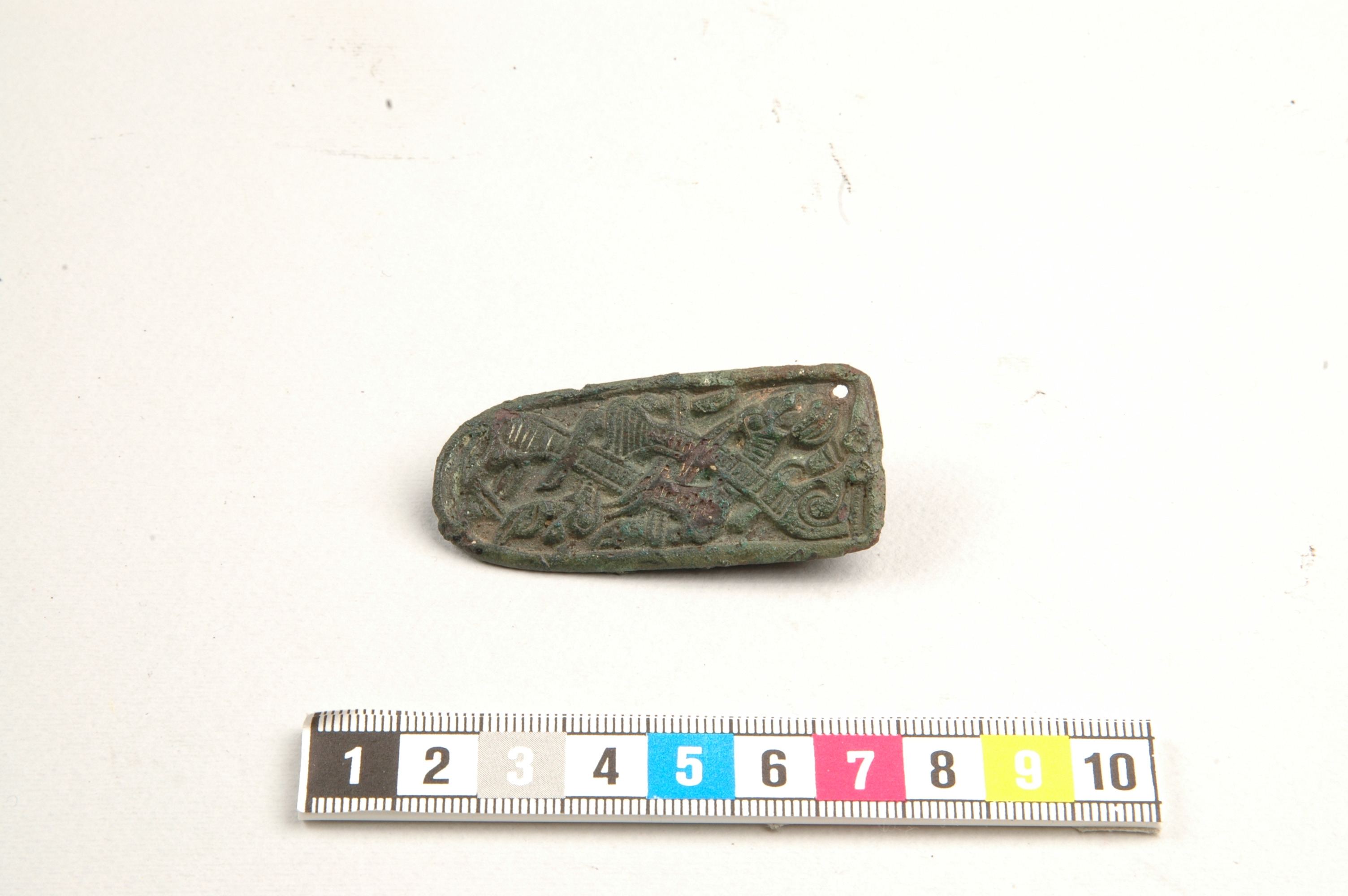 Bronsspänne tungformig, ornerad i Jellinge stil; förrostad järnnit på baksida .
