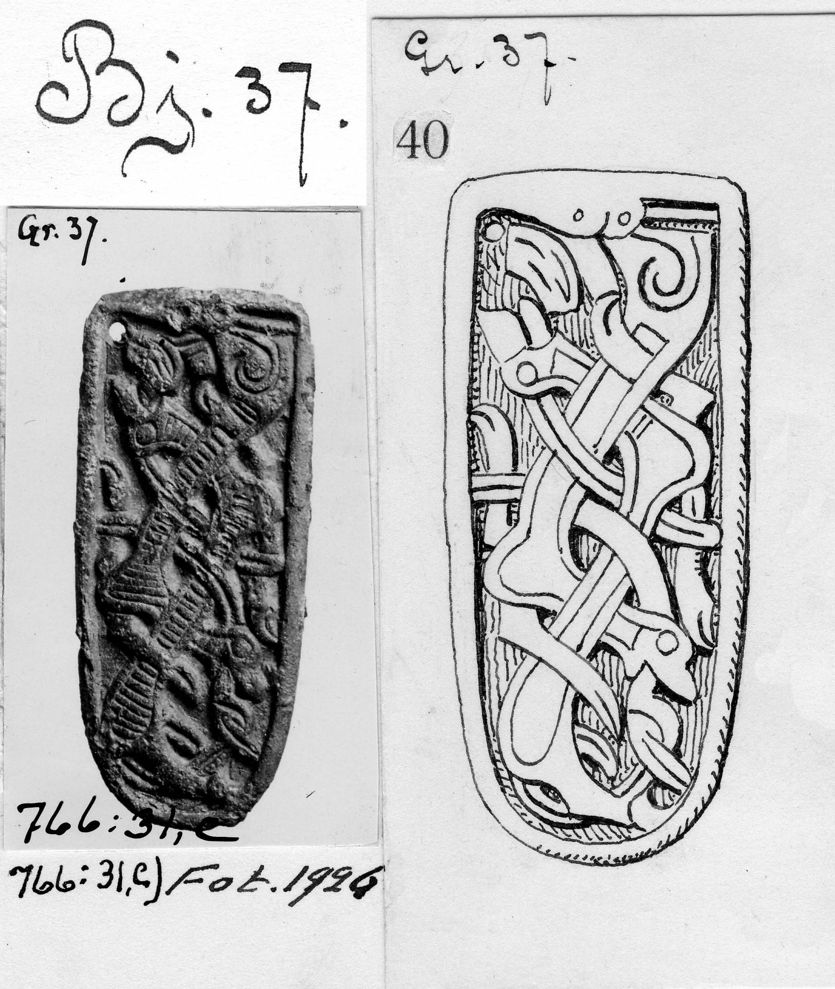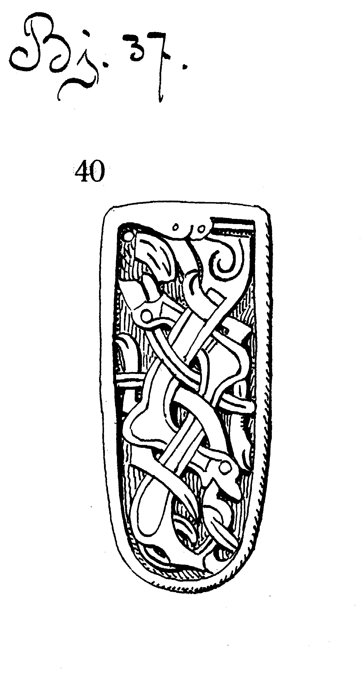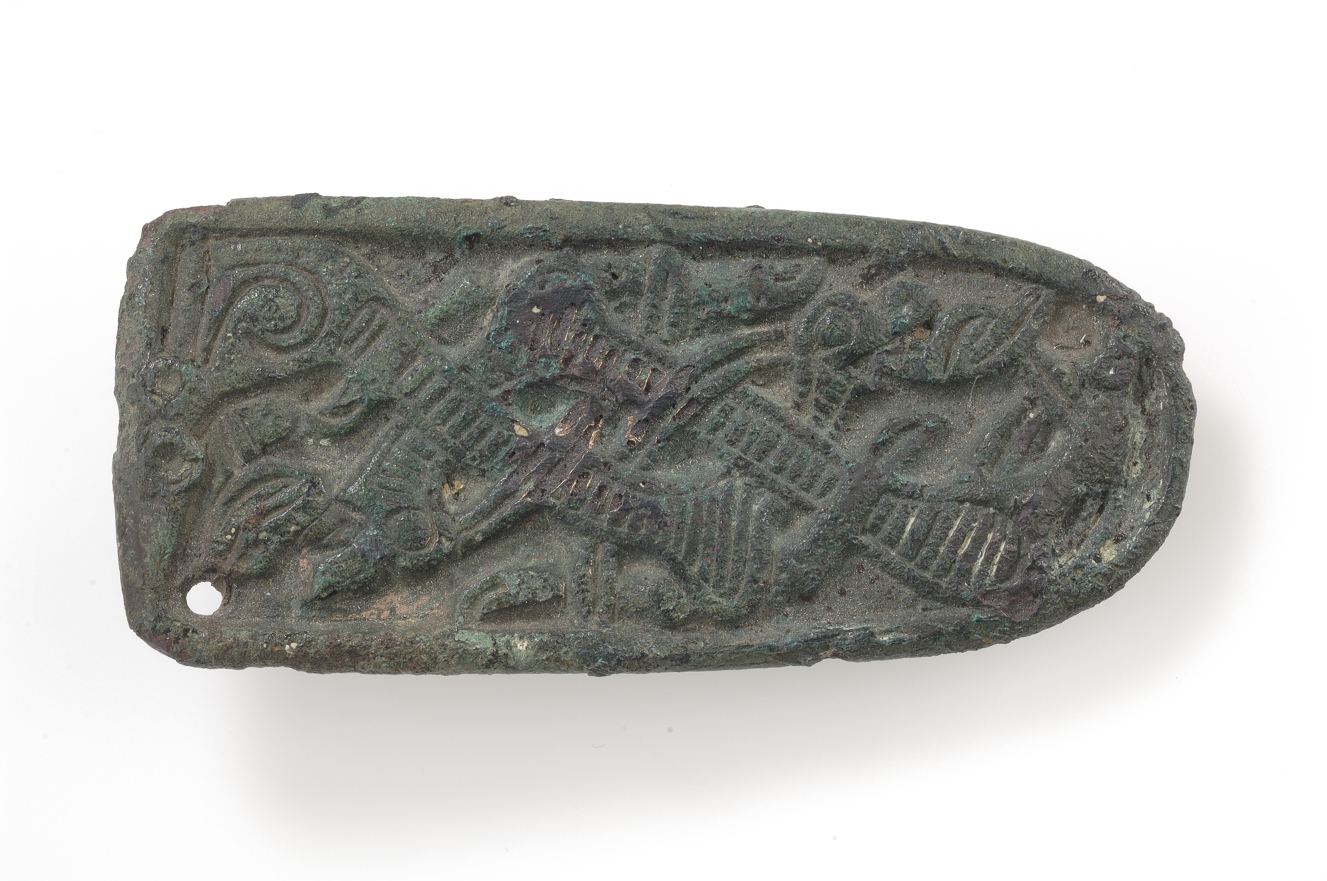 Bronsspänne tungformig, ornerad i Jellinge stil; förrostad järnnit på baksida .