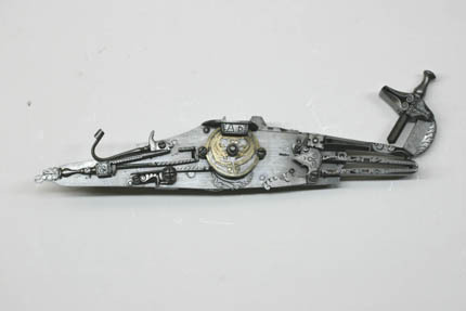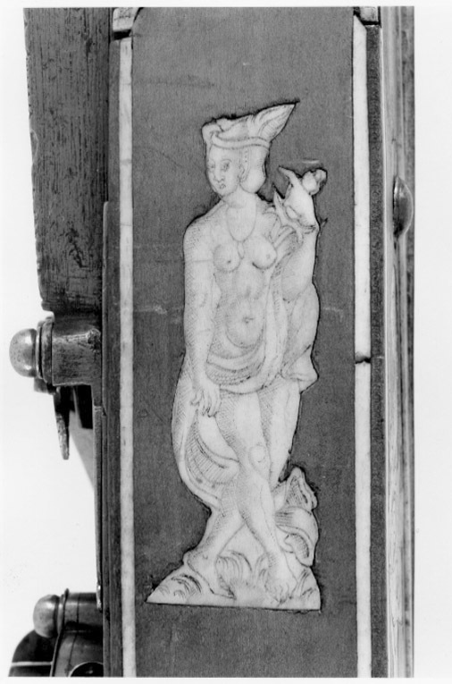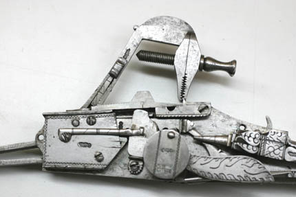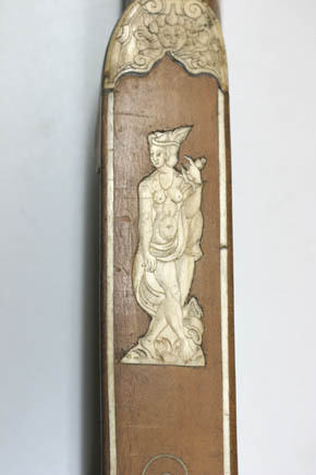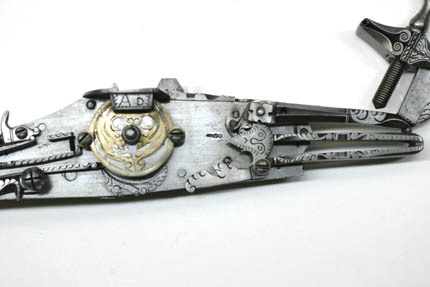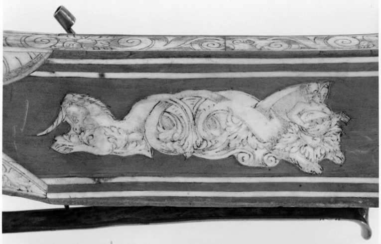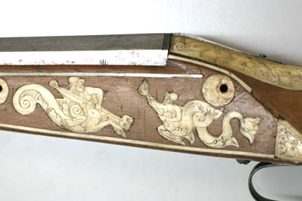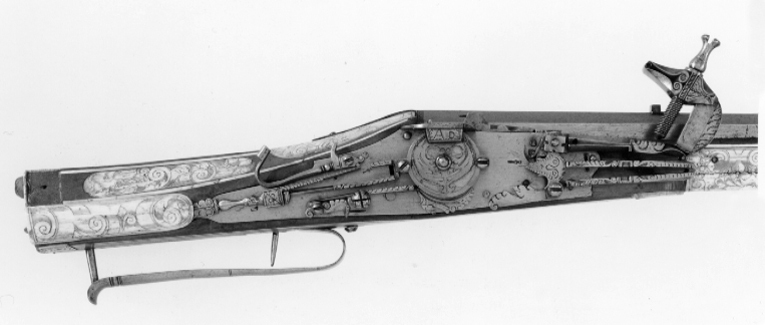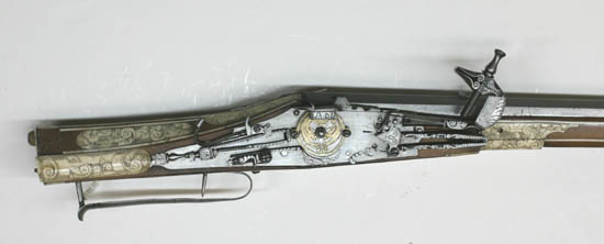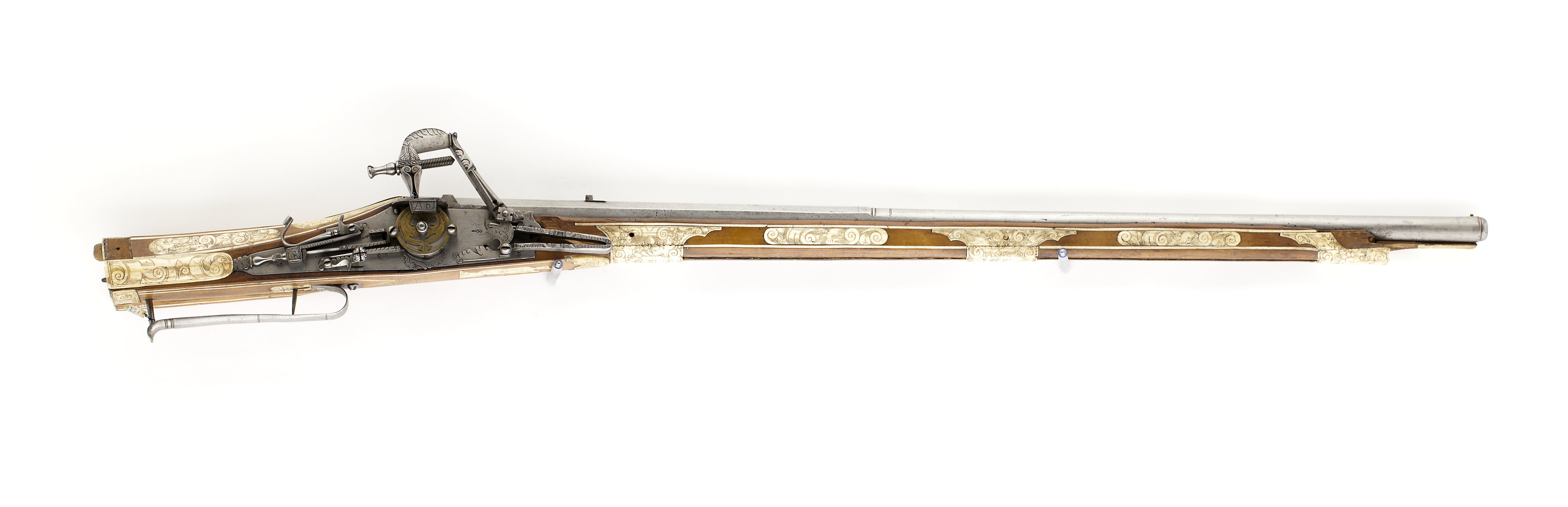 Rund, på kammaren åttsidig pipa, svagt vidgad vid mynningen, mynning i form av halvklot. Vid övergången rund-kantig del en svarvad ring, vid pipbasen på båda sidor om ringen samt vid mynningen sicksackbårder, mellan bakre bården och ringen inslagna, runda ringar på kammarens översidor. Rektangulärt, i vinkel böjt svansskruvblad. På övre v. sidofasen en otydlig stämpel, liknande stämplar på låset (slingrande, krönt orm, LRK vägl. 1921:193). Riktmedel: Ifrån svansskruvbladets böjning till siktet en framåt avsmalnande siktskåra. Fast ståndsikte, knoppkorn av mässing. Fästning: Tre häften. Pipan fäst med krysskruv underifrån (varbygelskruven) samt tre pipstift, två av ben och ett av trä (ersatt). Kombinerat hjullås med hanspännare och luntlås. Plant låsbleck, utvändigt hjul täckt av plan kapsel, på kapselns utsida en genombruten mässingsplatta med graverad dekor i form av bladverk, skruvar kl. 3 och 9, tre runda hål på kanten nertill. Mellan hane och hjul ormstämpeln liksom på hjulhusets kant och undersidan av virvelsäkringens fjäder. Kantig fängpanna, på utsidan graverat A D (D mindre än A). Fängpannelock med rörlig arm, streckdekor, kantigt grepp, hjärtformig, genombruten spets framtill på armen. Hane med rak kropp, fasade kanter och framåt avsmalnande v-formig skåra, främre delen med bladdekor, hals med svängd framkant, streckdekor. Underkäken lös, på käkarnas h. sida dekor i form av två stora voluter vid s kruven, därbakom fasad sidor och vid bakänden en liten cylinder, delad på de två halvorna. Hög, balusterformig käkskruv. På hankroppens insida en skjutsäkring ? Hanfjäder med delvis fasade kanter, bladformig dekor, platt, flikigt fjäderlöv. Hanstudel i form av en tunn platta med bakåtriktad spets och dekor i form av ett ansikte, på hanaxeln en kvadratisk mutter i form av ett fyrblad. Säkring: Bakom hjulet en virvelsäkring med streckdekor, säkringens grepp i form av en kula med djup, korsformig skåra och två tvärgående hål. Säkringens spets låser avtryckarstången nedanför svamplåsfjädern, förbunden med avtryckaren. Stången framtill u-formigt böjd , räta vinklar. Svamplåshane (ej ursprunglig) med åsad arm, på kroppen en nedåtriktad tand, som när hanen fällts framåt vilar på stångens u-formiga del. Vid avtryck skjuts stången framåt, varvid hanen faller ner i fängpannan. Svamplåsfjäder med streckdekor, fyrsidigt fäste och balusterformigt, välvt löv med streckdekor. Låsets insida: på hanaxeln finns en stålarm, som när hanen förs framåt skjuter en kuggstång med sex kuggar bakåt, varvid hjulaxen med fyra kuggar vrids runt. Kuggstångens andra ände påverkar en v-formig stav. Staven fäst i vinkeln, andra änden går ner under slagfjädern och spänner, när kuggstången och stavens överände förs bakåt. Avtryckarstångens hak hakar i stavens överdel i spänt läge. Hjul-slagfjäderstudel i ett stycke, över hjulet en rund skiva med lodräta sicksackbårder, på slagfjäderdelen streckdekor. Slagfjäder med bladdekor. Över främre delen (hanaxel och kuggstångens främre del) en skyddsplatta med sicksackkantbård. Fängpannelockets arm belastad av fjäder, fastskruvad på skyddsplattans utsida. På låsets samtliga delar stämpel i form av krönt lindorm (1921:193) Fästning: Två låsskruvar. Rak avtryckare. Hjärtformigt avtryckarbleck av ben. Helstock av päronträ(?), kolv av tysk typ med mycket kort vinge och kolvlåda, stödkula av horn. Kantlister av ben, inläggningar och beslag av ben med graverad dekor. Kolvlådelock och ovala plattor på stockens sidor med rullverksdekor, i bakre delen av plattan på kolvens övre h. sida ett vildsvinshuvud. Vid svansskruvbladet ett manshuvud, på övriga djurhuvuden med spiralformigt upprullade överkäkar. På anslagets platta en lutspelare och en enhörning. Två runda låsskruvbrickor med korsdekor, därnedanför två konturerade plattor i form av havsväsen, den ena med fackla, den andra med treudd. På kolvens undersida en platta med dekor i form av en naken kvinna, som sticker en dolk i bröstet (Lucretia). Ursprungligen helt sluten laddstocksränna, täckt av benplattor (saknas), endast de tre rörkplattorna återstår, dekor av lejonmasker. Främre rörkplattan samt framstockens h.sida saknas likaså. Lång varbygel av stål, framtill bandformig, baktill skålad, framstolpen c-formig, rektangulär platta, bakstolpen stavformig och inskruvad i kolven, bygeln något nedsvängd vid bakre stolpen.