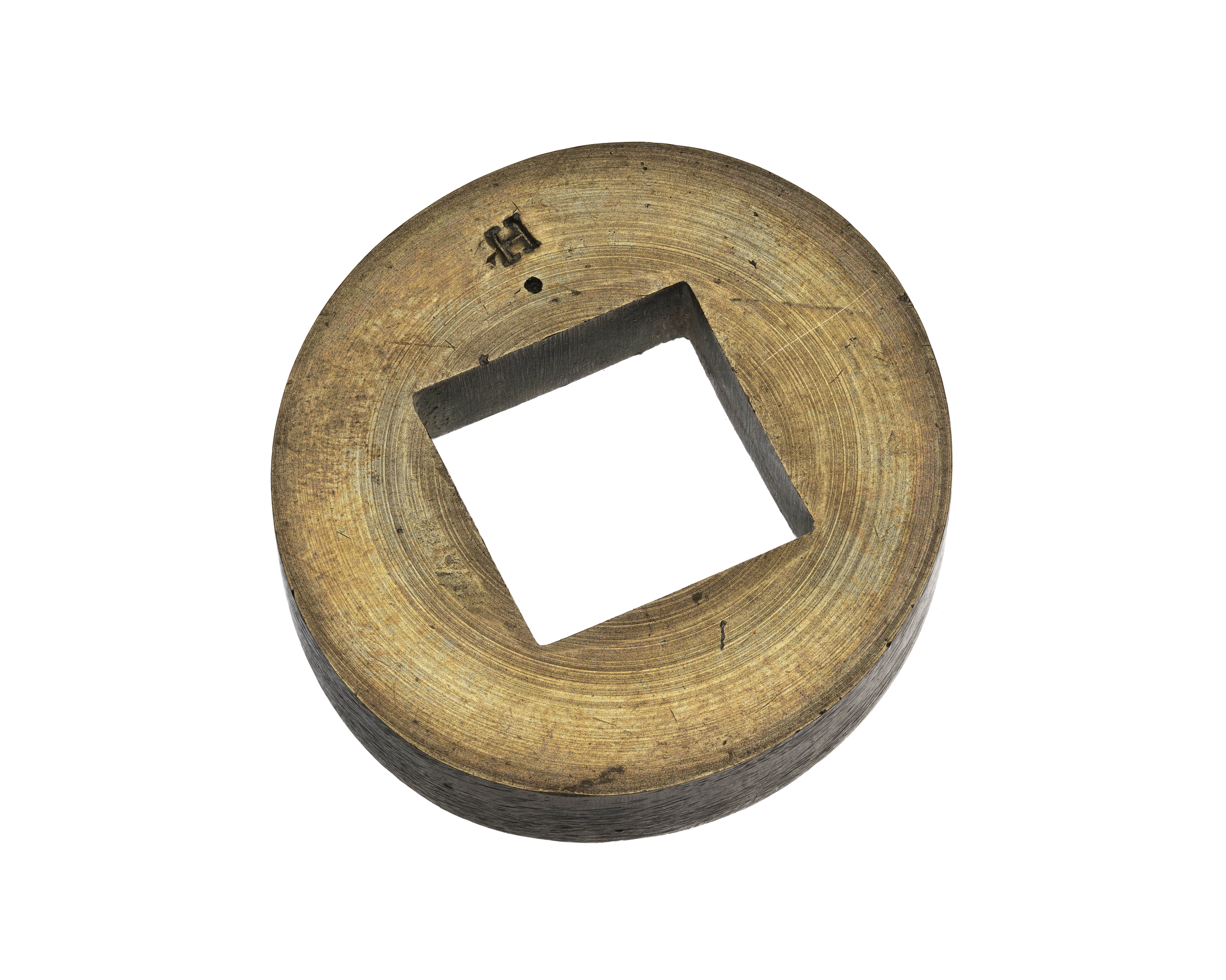 Kvadratiskt hål med 21,7 mm sida. Stämplad på ena sidan med en punkt och "H", på andra sidan med tre punkter.