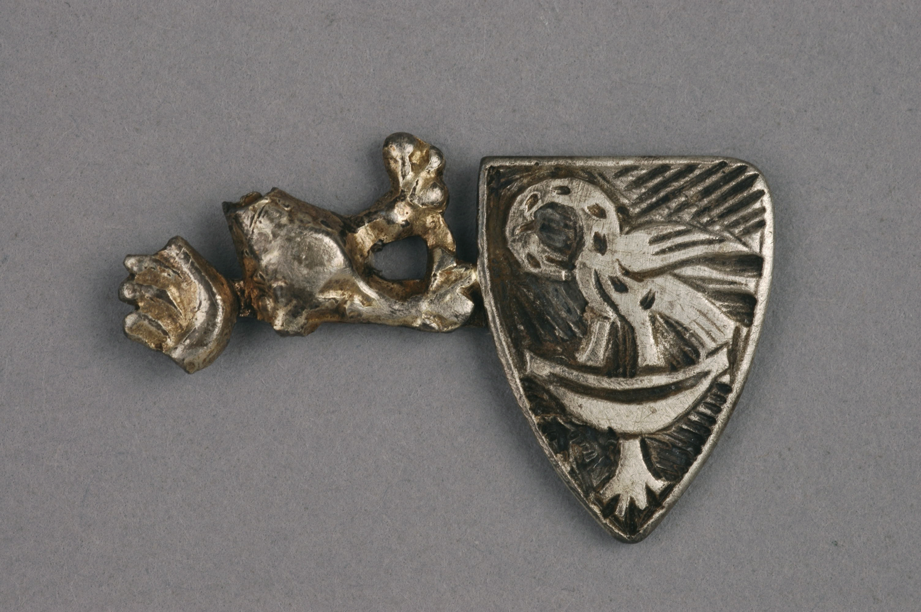 Häkta i form av en spetsig sköld. Gjord i silver, ursprungligen emaljerad. På skölden avbildas en pelikan stående i sitt bo som hugger sig själv i bröstet. Enligt fabeln återuppväcker pelikanen sina döda ungar genom att bestänka dem med sitt eget blod vilket gjort att att den använts som symbol för Kristi död och uppståndelse.