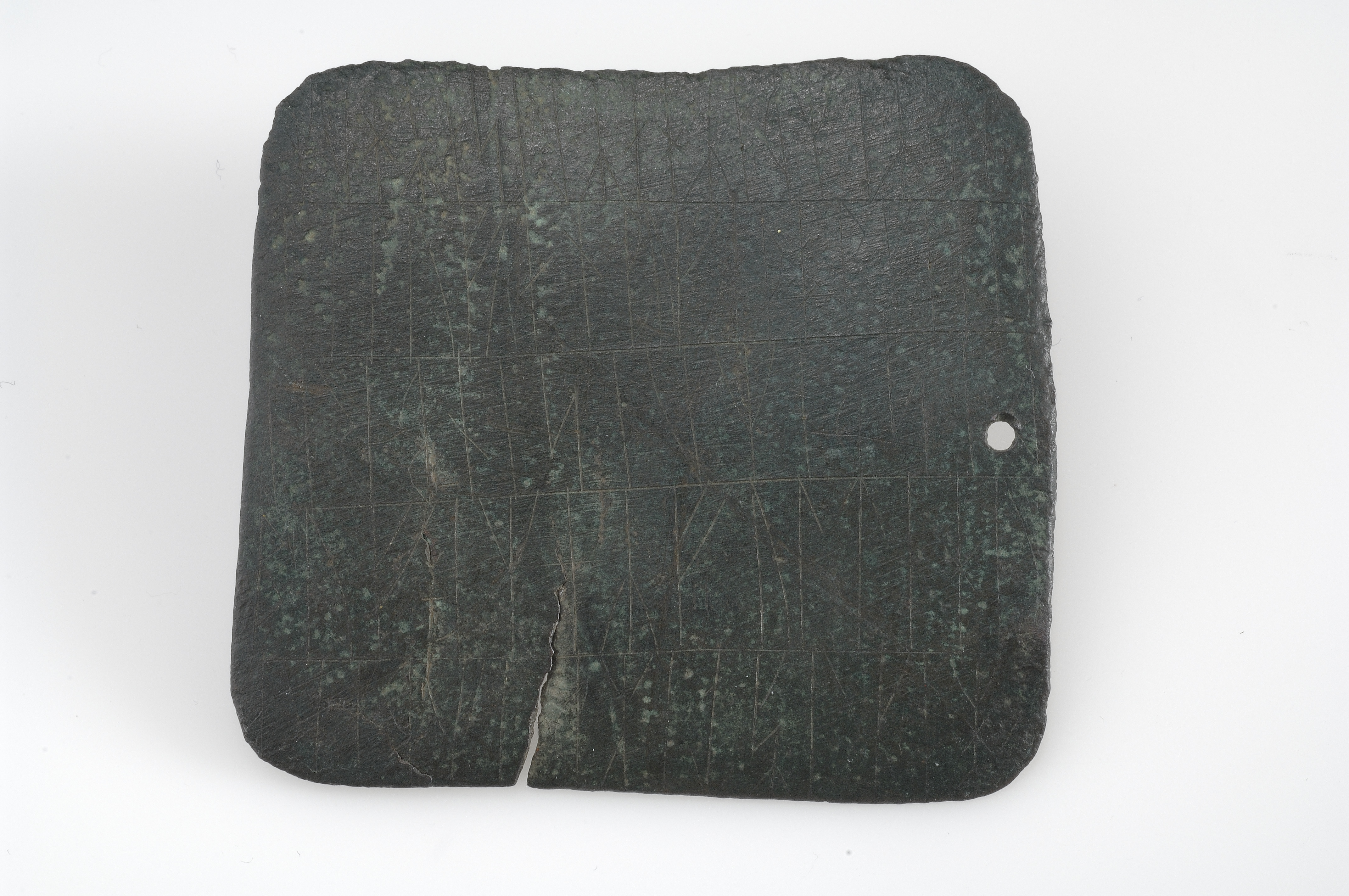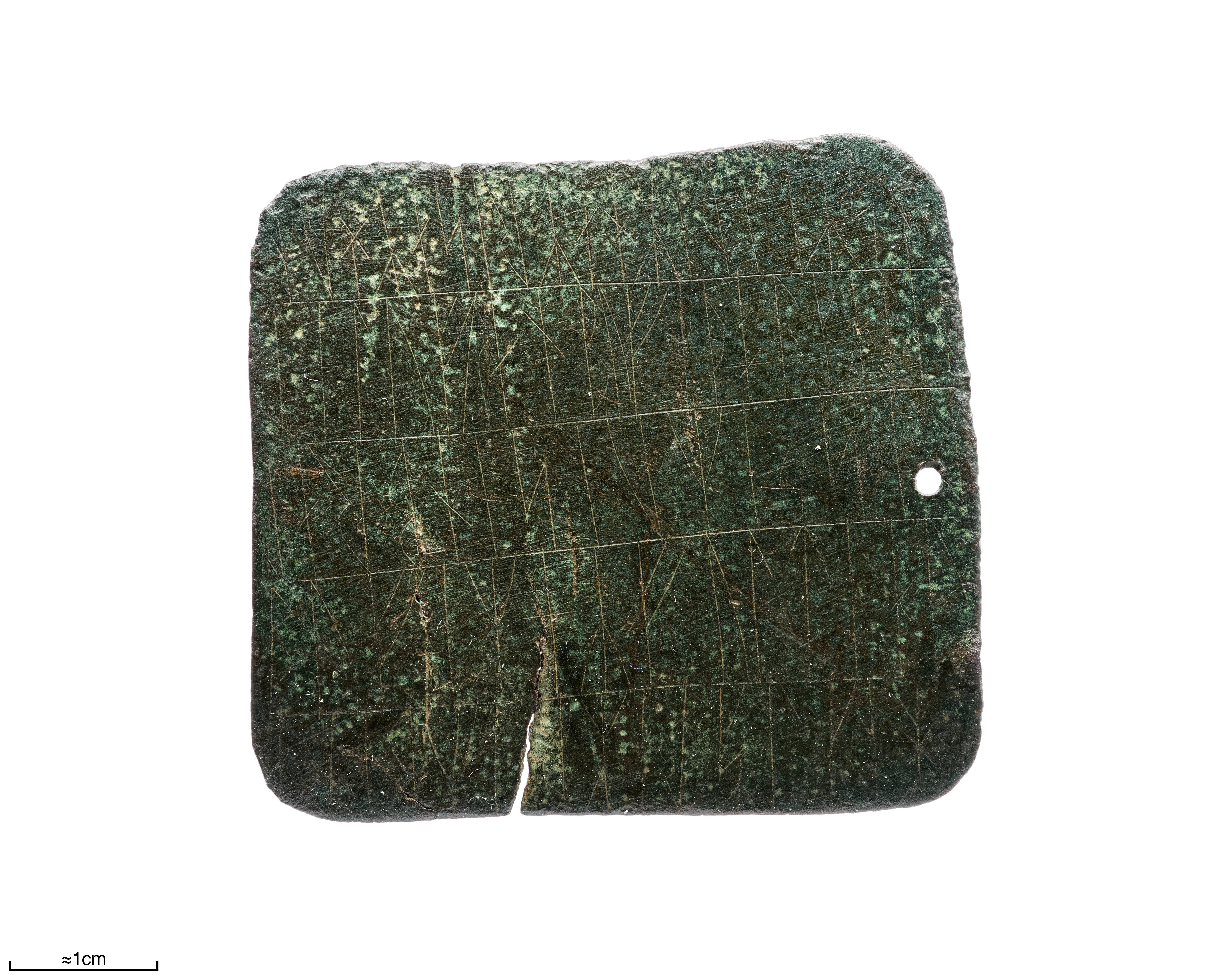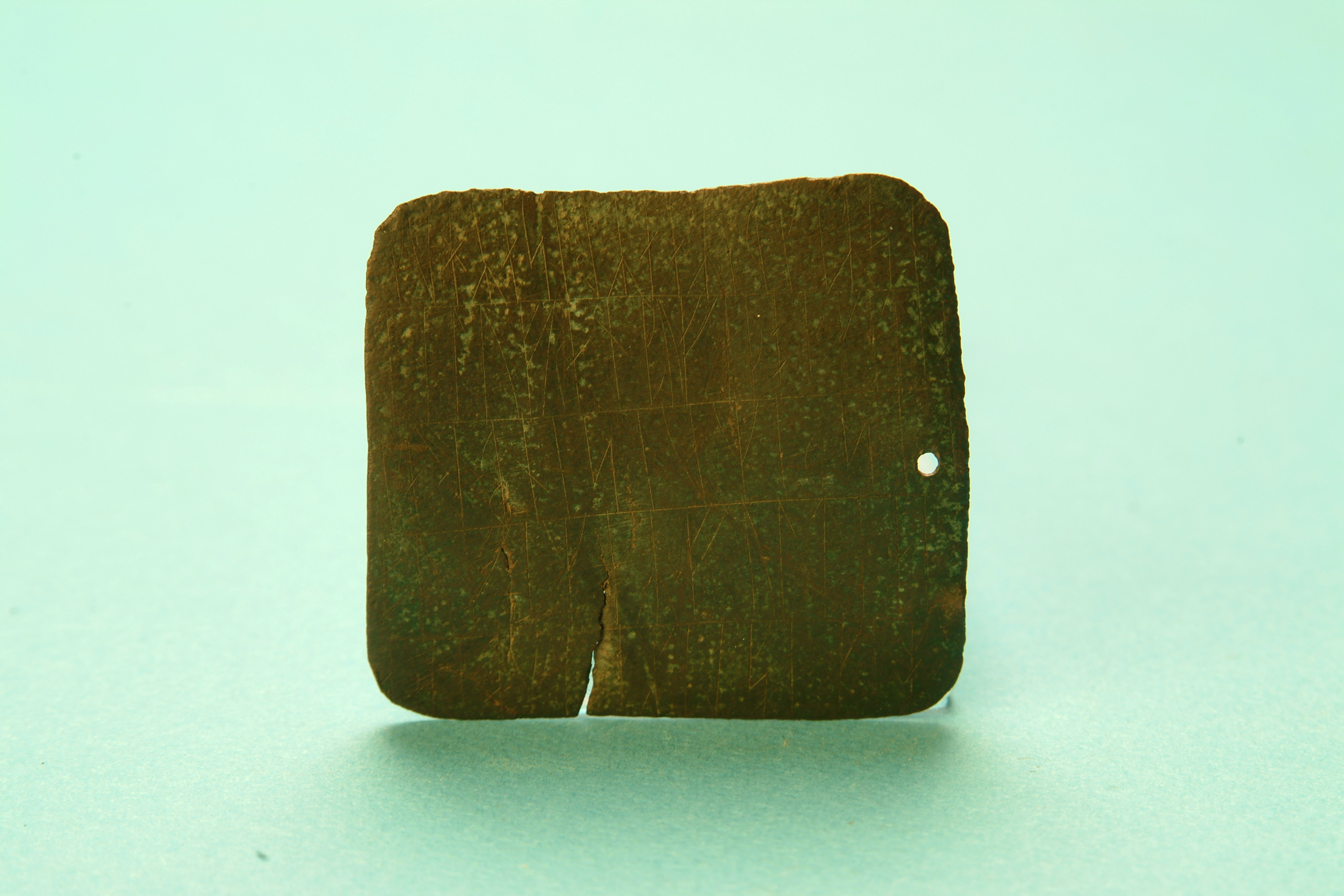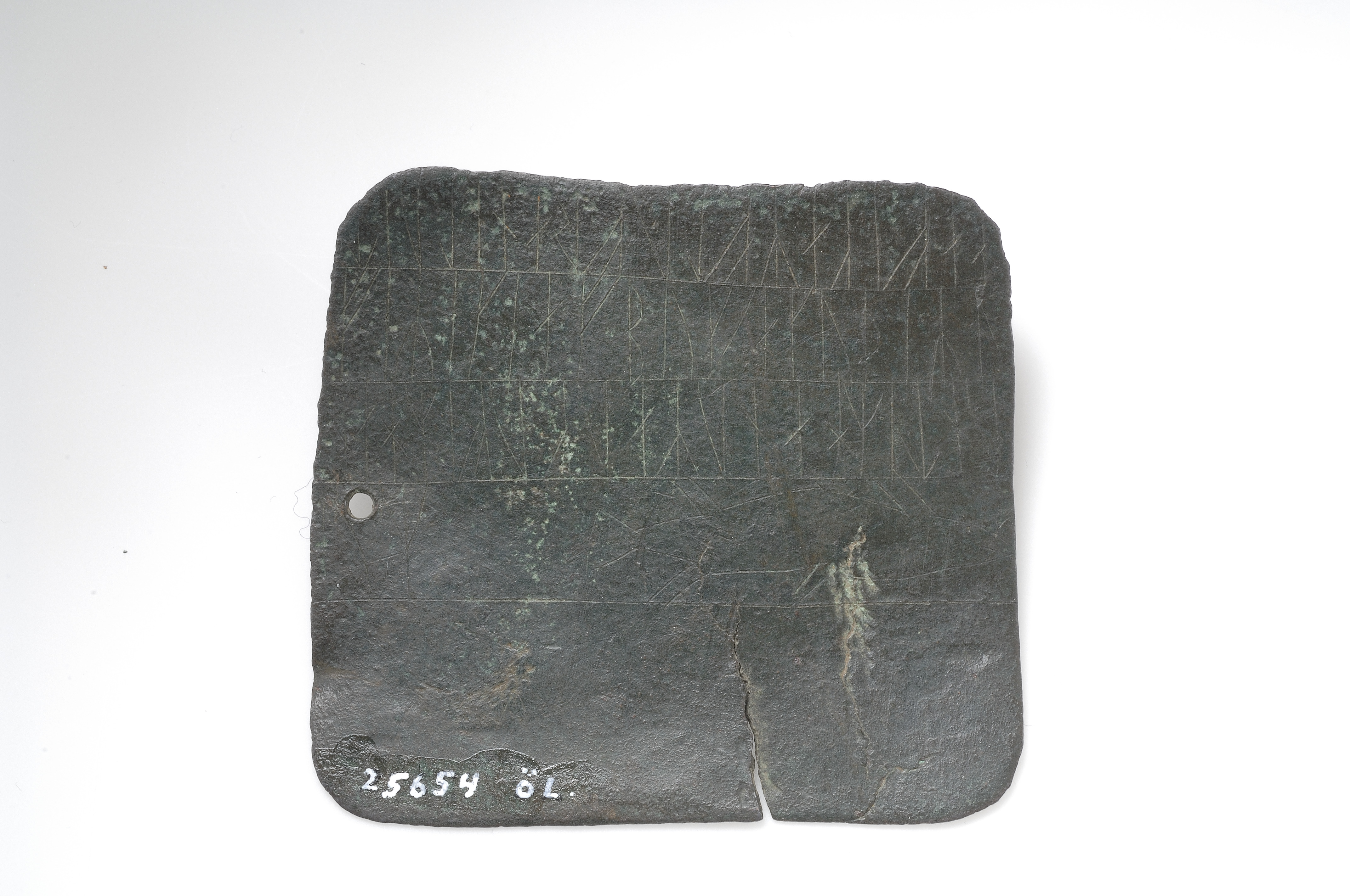Rektangulärt runbleck av koppar. Runorna är placerade i fem rader på bleckets framsida och i fyrarader på baksidan. Efter den sista runan har en fisk tecknats.