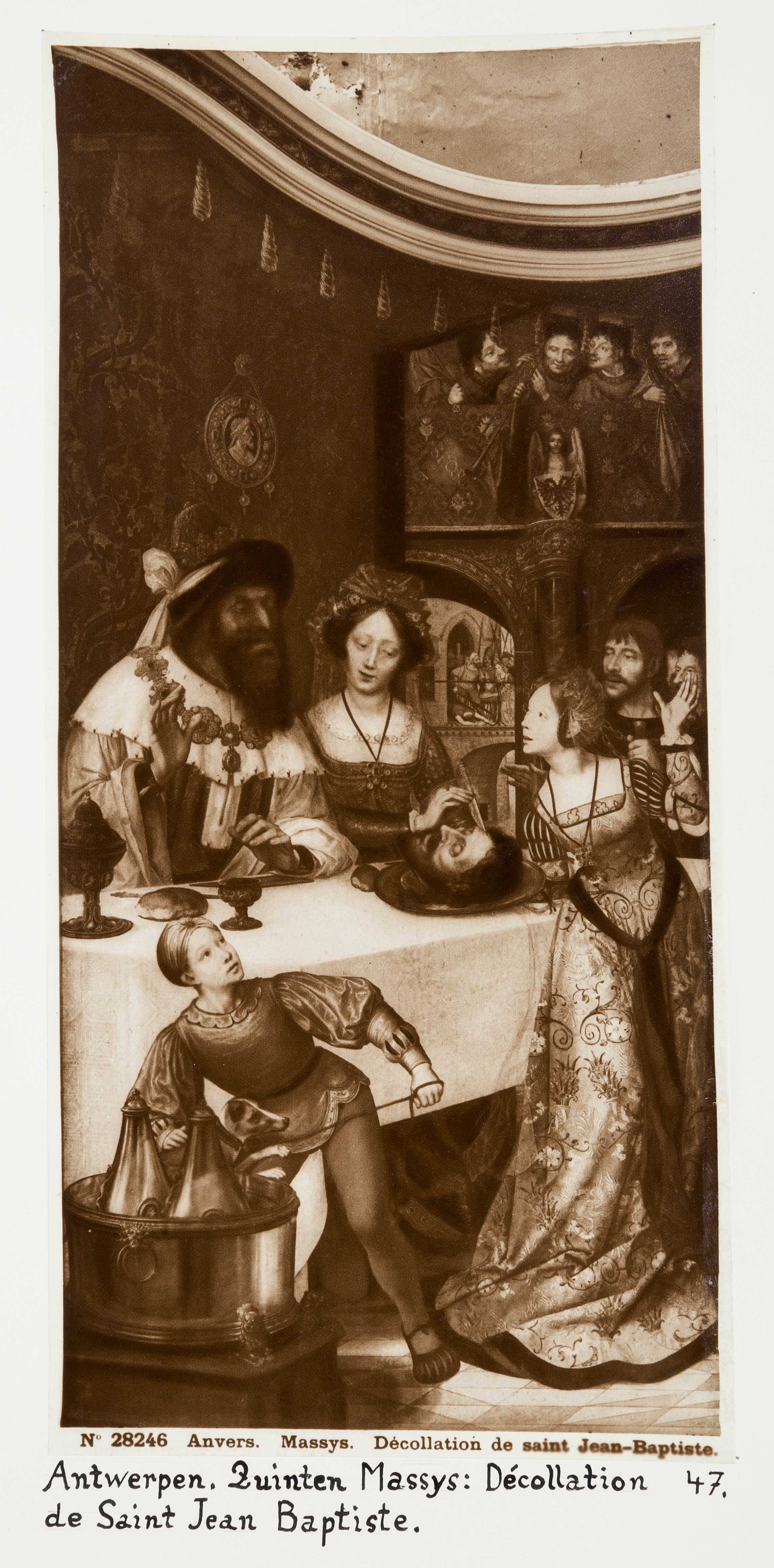 Fotografi. Johannes Döparens halshuggning, av Quinten Matsys. Finns på Koninklijk Museum voor Schone Kunsten i Antwerpen. Text på originalet: "Quinten Massys: Décollation de Saint Jean Baptiste." Fotografierna LXVI:Q.01.-55. kommer från en resa genom Schweiz, Belgien och Holland, som Wilhelmina von Hallwyl gjorde den 4 juni - 1 augusti 1927. Med på resan var fröken Sonja Gelotte, professor Nils Lithberg, herr Karl Andersson och kammartjänaren John Petterson. Nils Lithberg lämnade sällskapet efter vistelsen i Schweiz. Fotografierna är inköpta av Wilhelmina i Basel, Zürich, Bryssel, Antwerpen, Haag och Amsterdam. Uppgifterna kommer från Sonja Gelottes reseanteckningar.