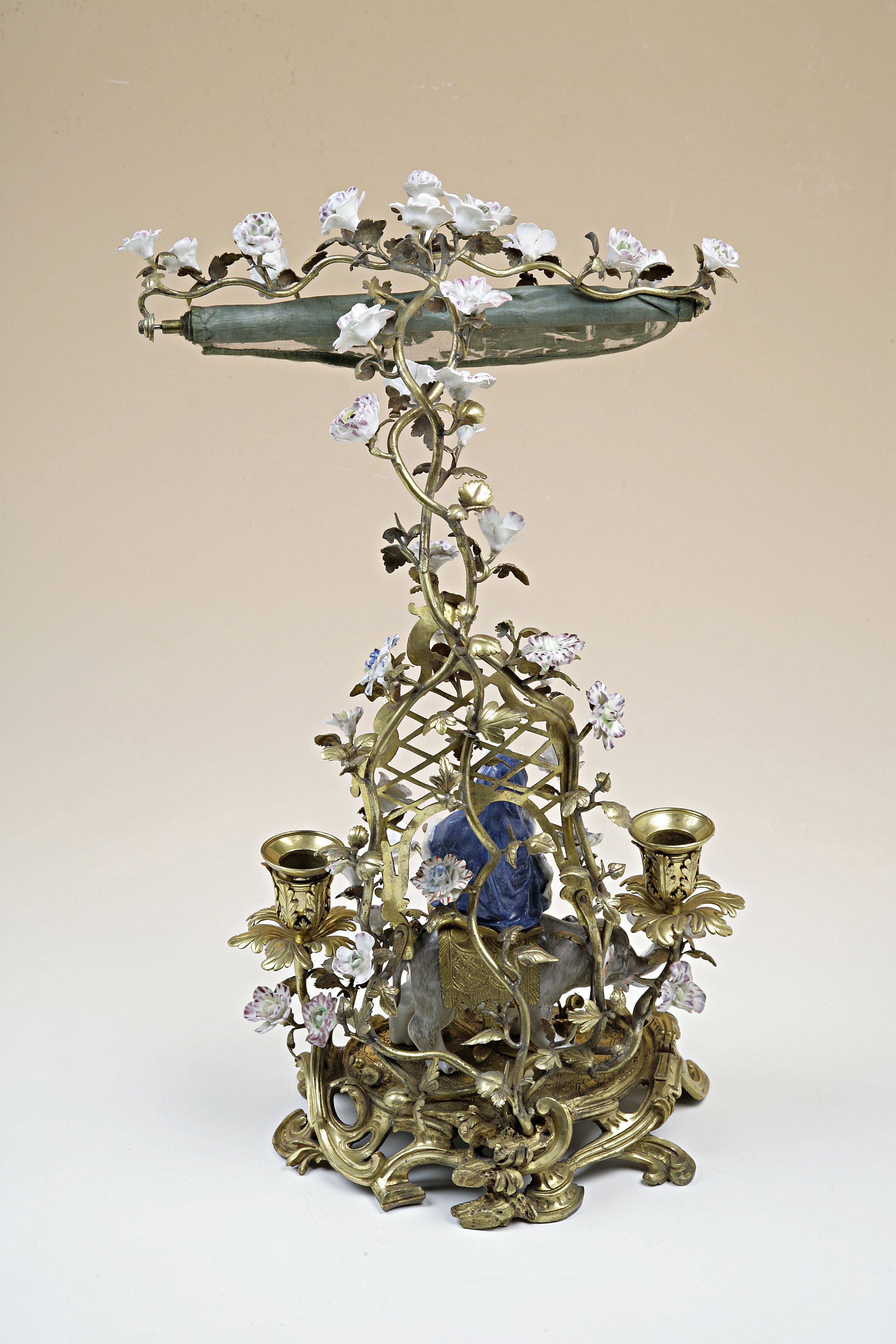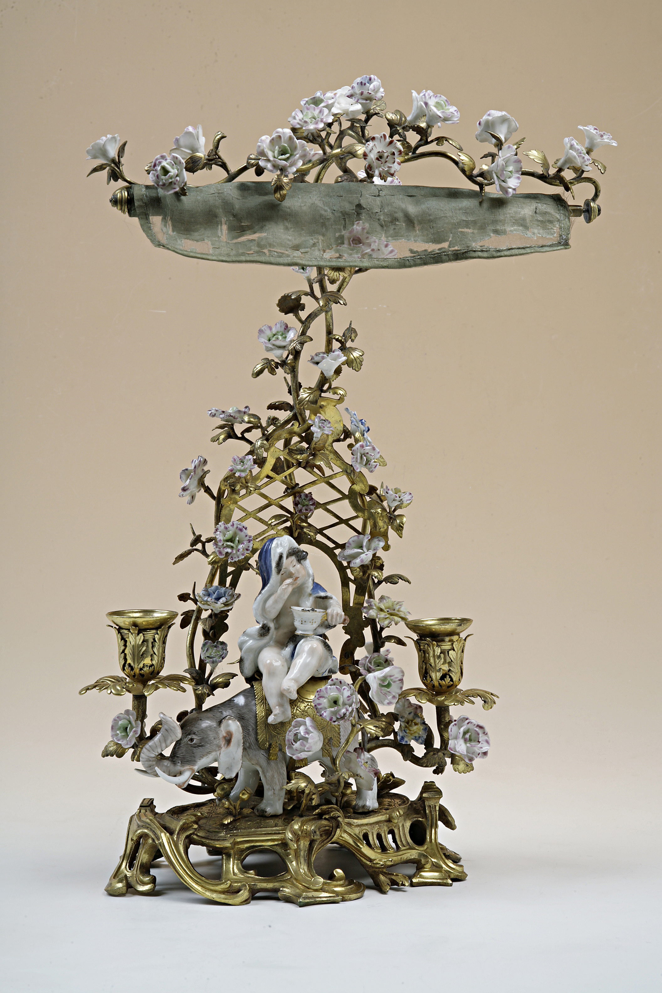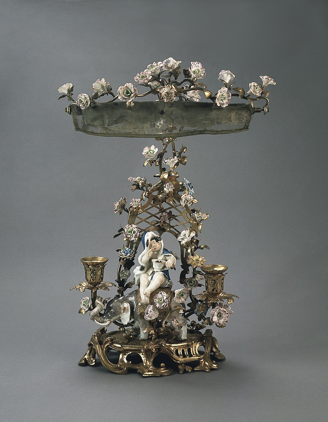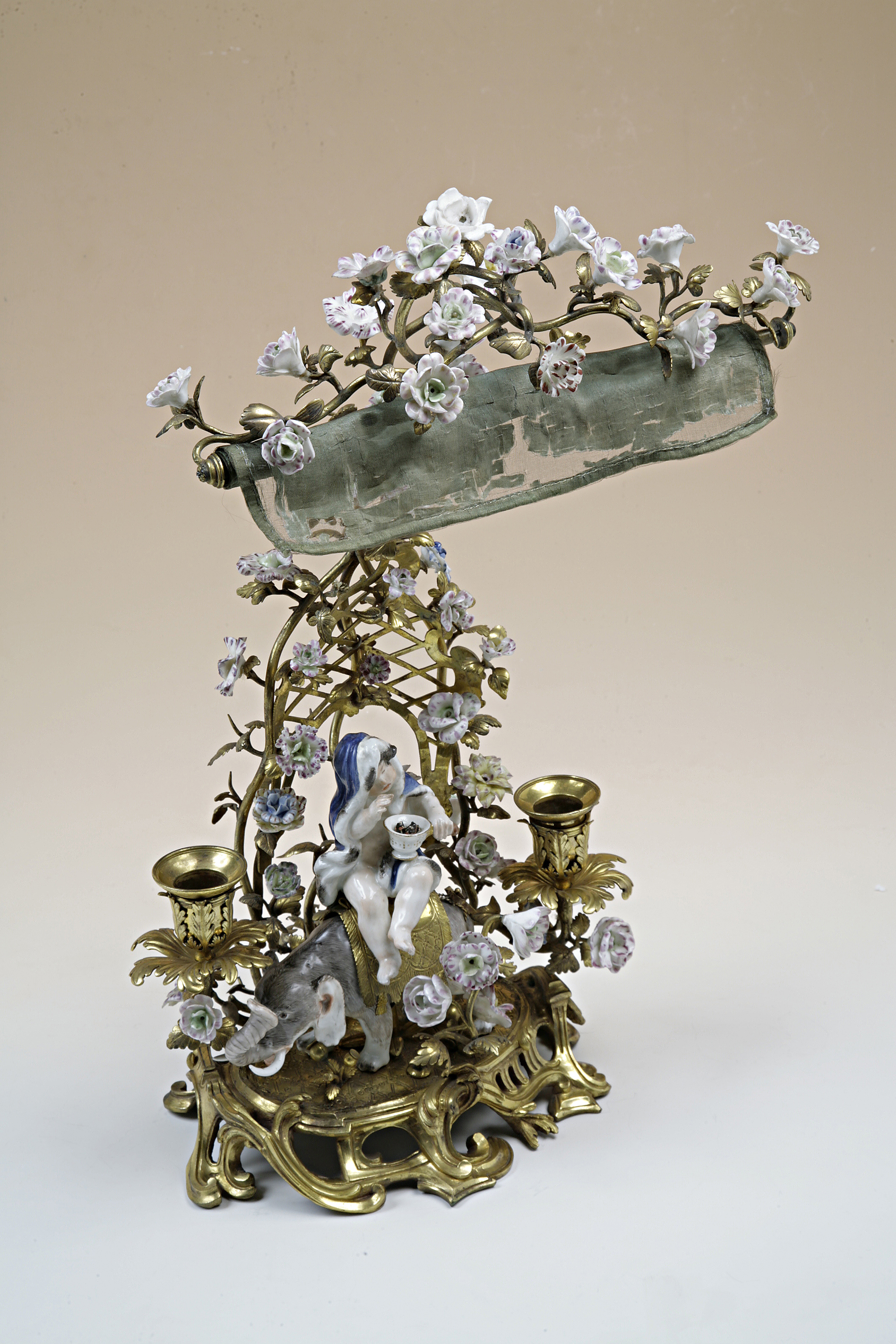 Ljusställning med gardin. Av förgylld brons med figurin och blommor av porslin. På sockeln en barnfigur sittande på en elefant. På baksidan uppåtriktade smala rankor med blommor. I mitten en ljuspipa. Porslinsblommorna och ställningen av förgylld brons är tillverkade i Paris. Barnfiguren från 1741, efter modell av J.J.Kändler och Elefanten från 1747 efter modell av Peter Reinicke är tillverkade vid Meissen. Lyxartiklar som denna dubbla ljusstake med sänkbar gardin uppfanns och lanserades av franska "marchands-merciers" (handelsmän)