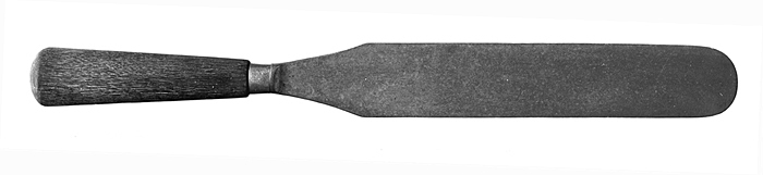 PANNKAKSSPADE Av stål, med träskaft. Blad tunt, brett, jämnbrett med rundad ytterände, inre änden kilformigt hopdragen mot skaftet; vid skaftroten en flänsliknande utsvällning s. k. ansats. Skaft av svartfärgad teak, med ovalt tvärsnitt och avsmalnande inåt samt med rundad ytterände; på inre änden en holk av nysilver. Längd: 38 cm. Blad, bredd: 4,1 cm. Skaft, längd: 13 cm. Fransk tillverkning, Paris; firman SABATIER.