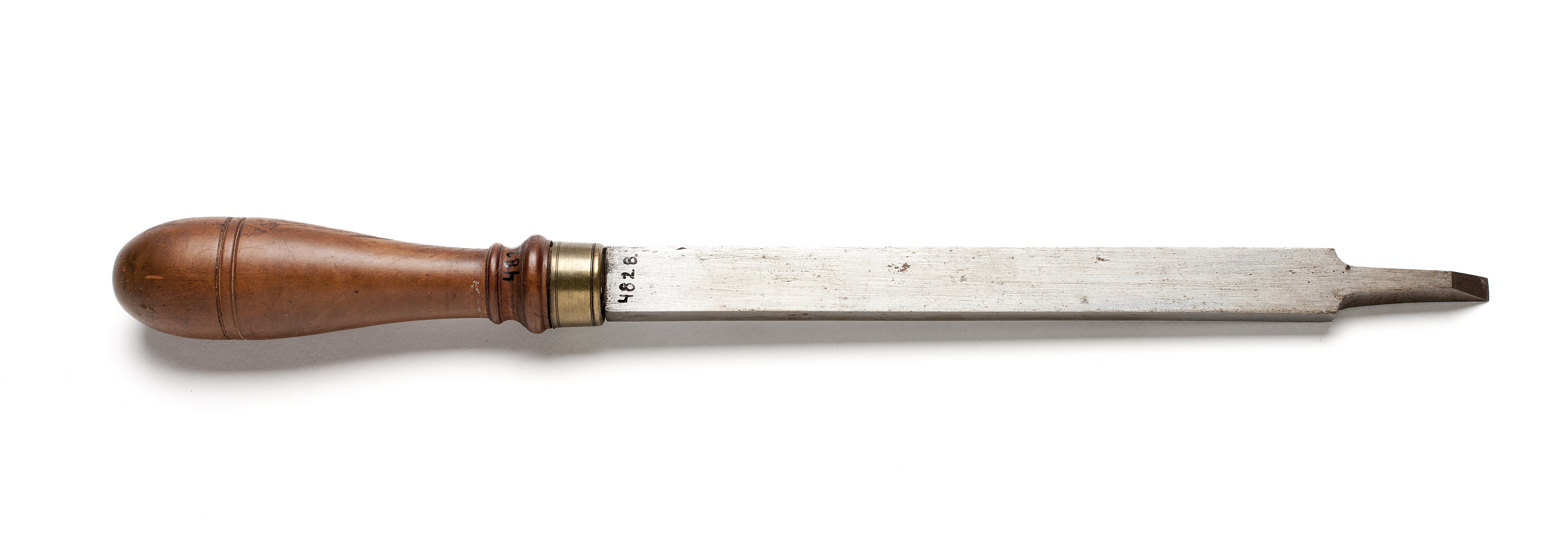 Klinga med rektangulär genomskärning, avsmalnande i änden via en konkavitet på vardera sidan. Svarvat skaft av päronträ med två vulster nedtill ("skoklostertyp"). Mässingsring.