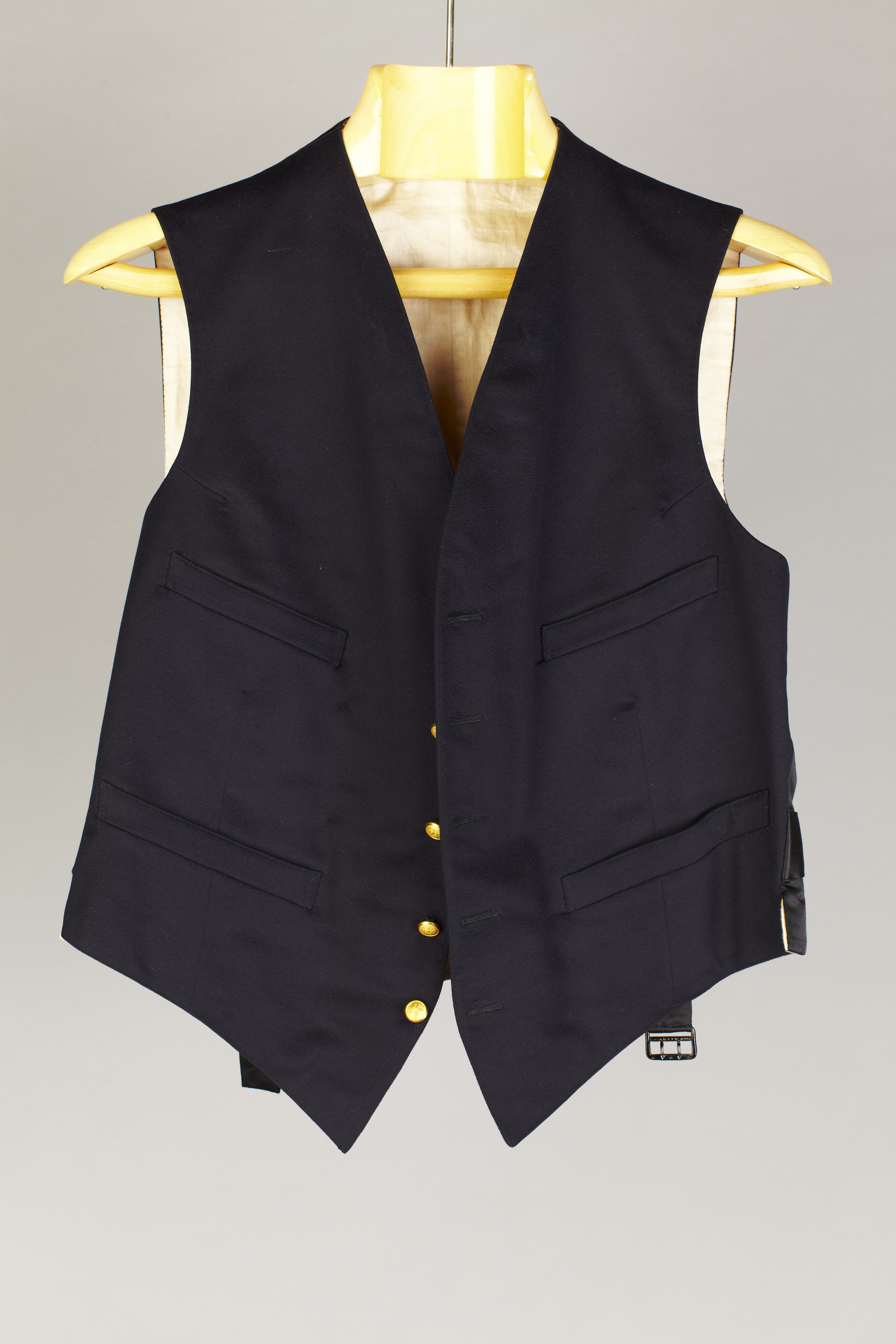 Väst av mörkblått kläde med enkel knäppning med fem förgyllda knappar med krona, d: 14 mm.Fyra stolpfickor fram. Bakstycke av svart siden med spänntampar med svart sölja märkt:"SOLIDE". Foder av vit bomull, innerficka med lock. Buren av Eric Adolf Hallin (1870-1965) utnämnd till kammarherre 1912.