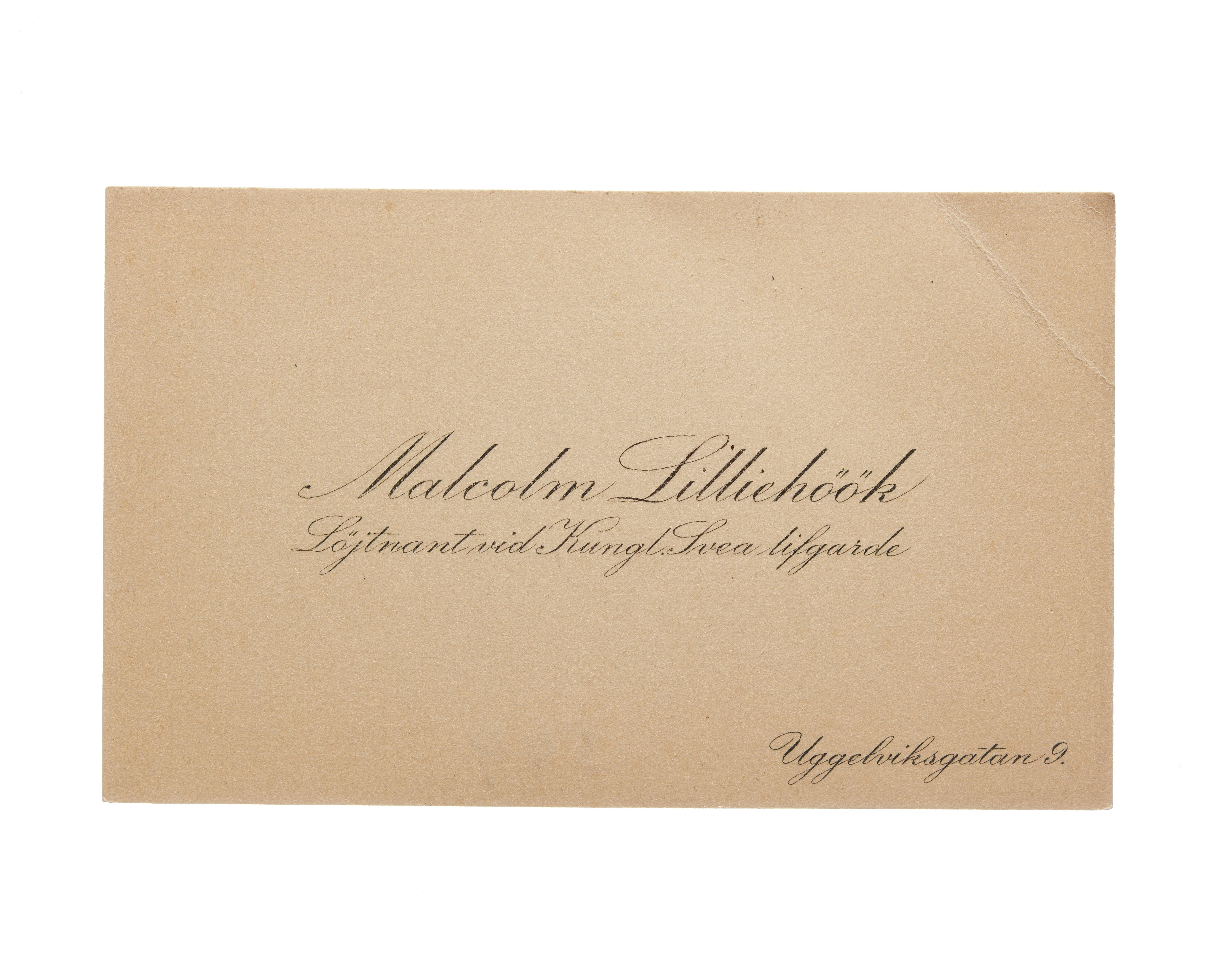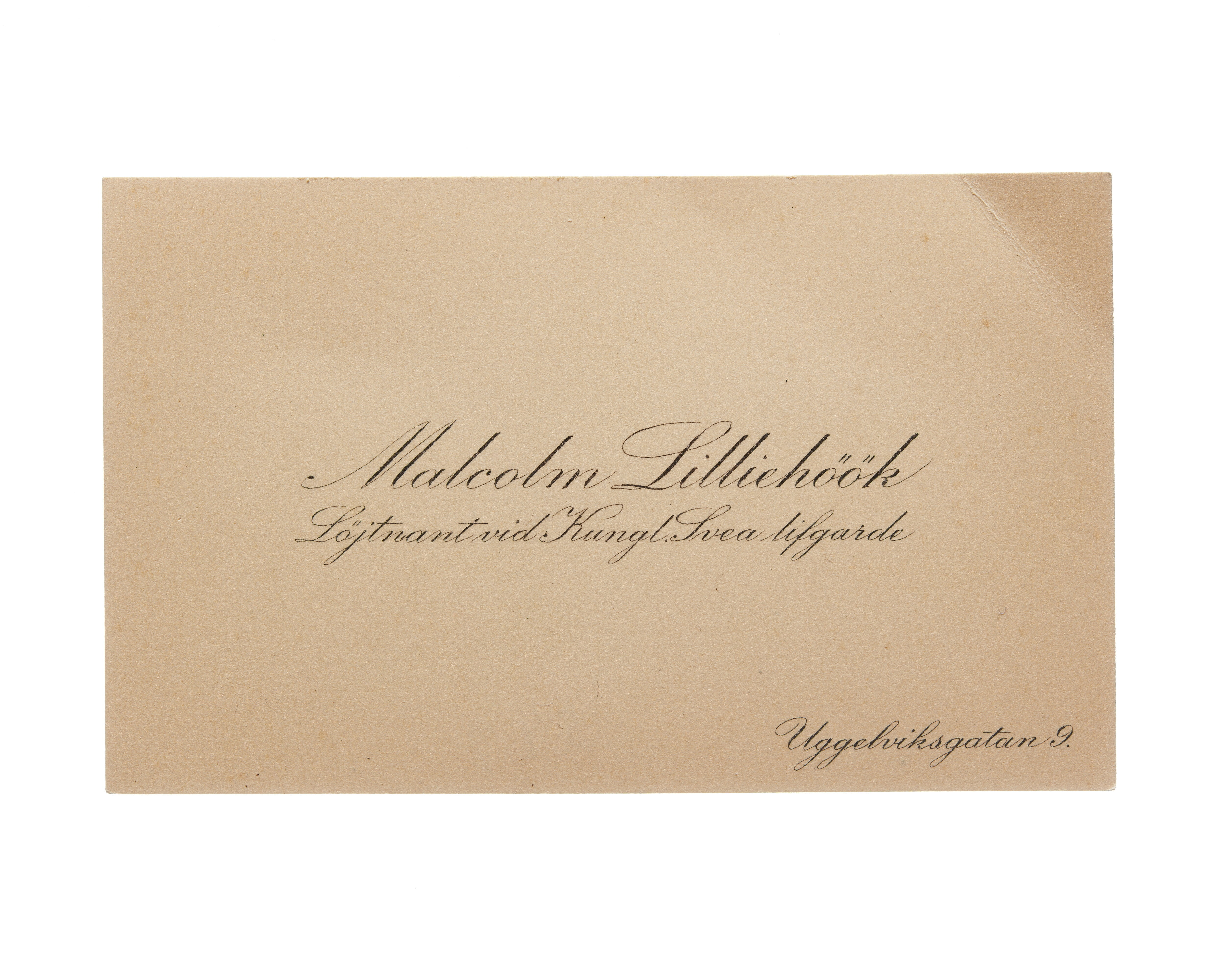 Visitkort från Malcolm Lilliehöök, Löjtnant vid Kungl. Svea livgarde.