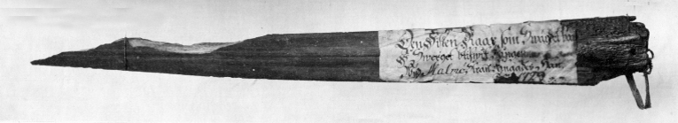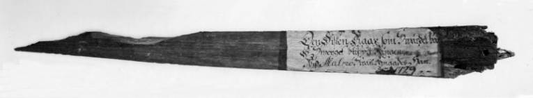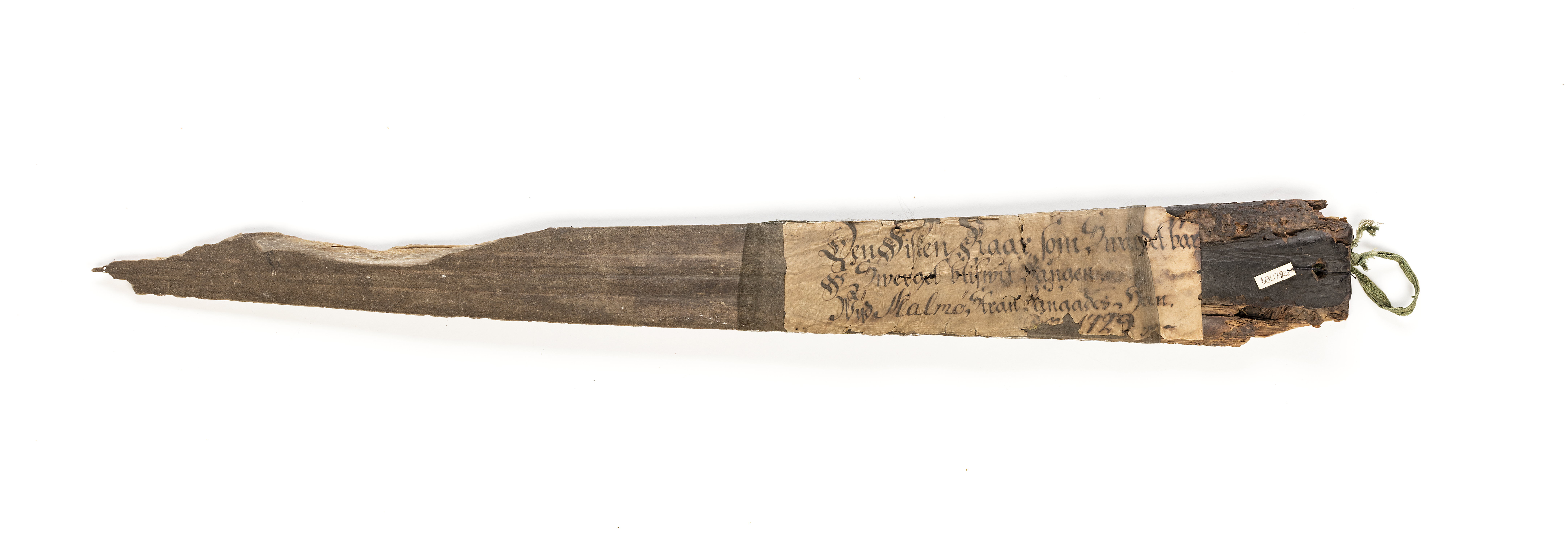Pappersetikett med bläckpåskrift: "Den fisken Raar, som Swärdet bar // J Swerget blifwit Fången, // Wijd Malmö Stran fångades Han // År 1729".