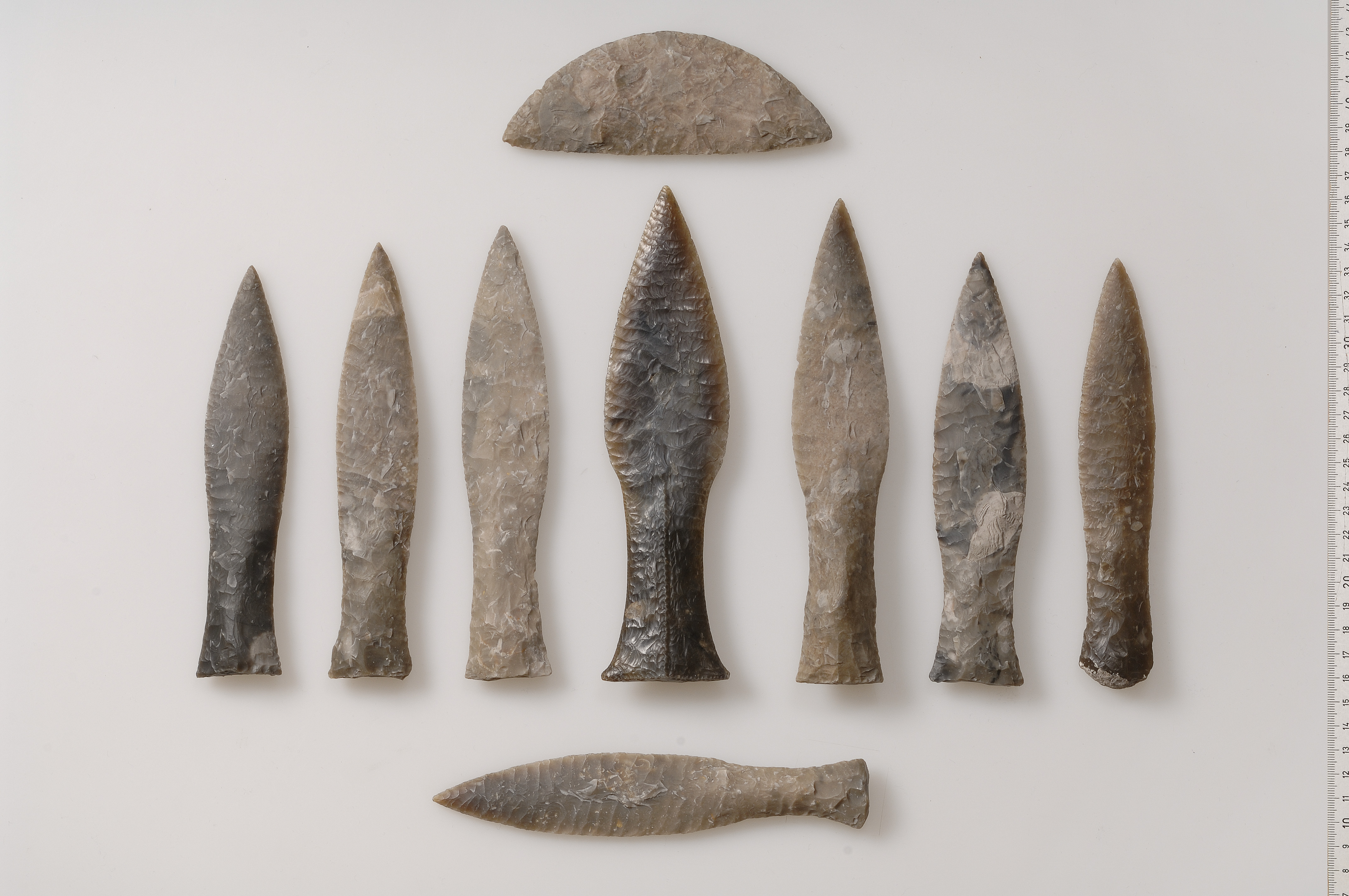 1 av 9 flintdolkar funna tillsammans med 1 flintskära ungefär 2 fot (0,6 meter) under jordytan. Urtagen.