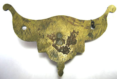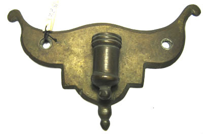 Av mörknad mässing med fasade kanter. Platt med åt sidorna uppåtsvängda vingar, avslutade med liten kula, nertill rundat utskott. I mitten hylsa, l 34 mm, med upptill tre skurna ringar och nertill krage med kula, hylsan fäst med två nitar. I beslagets bägge kanter ett genomgående hål för fästning.