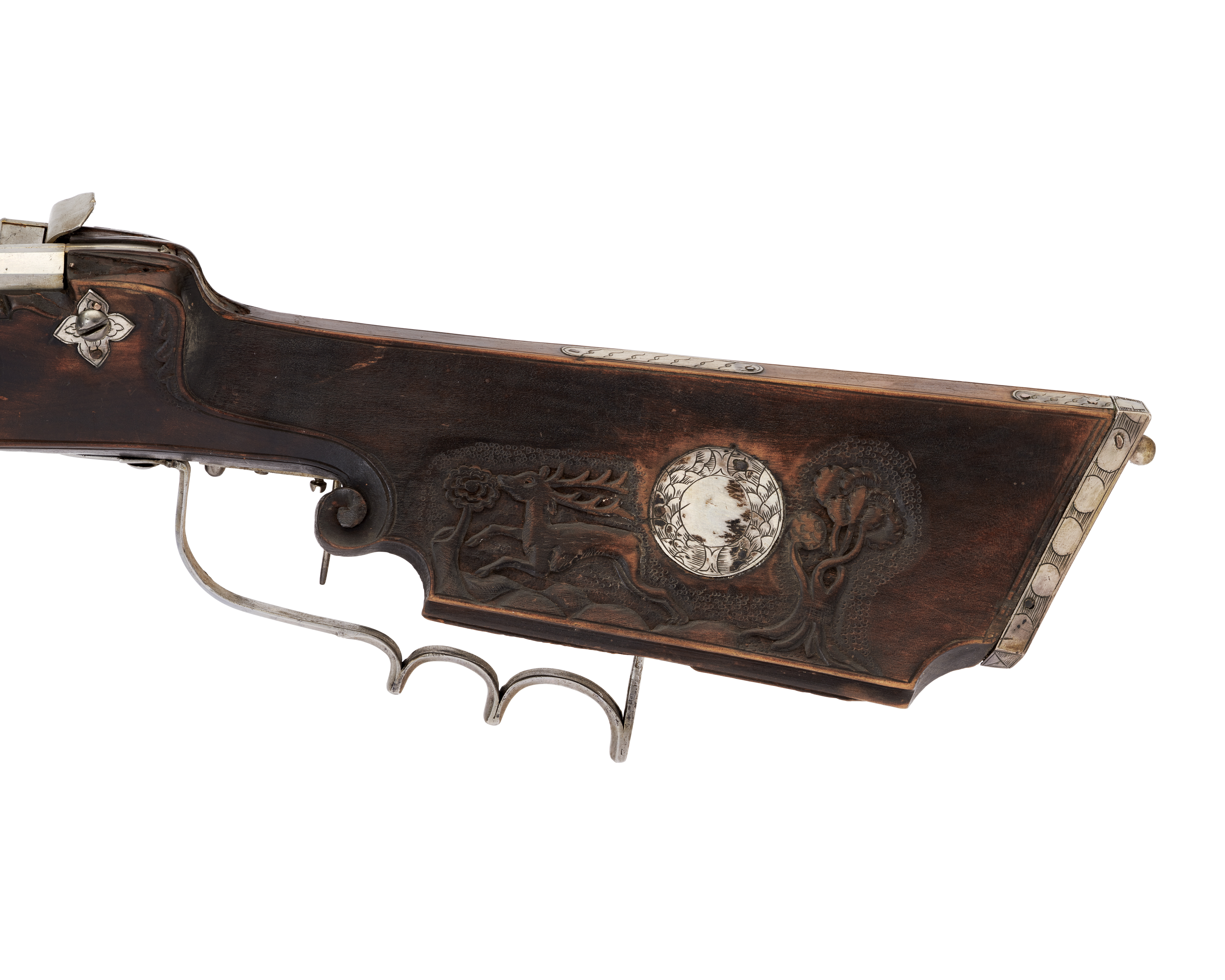 Enligt 1651 års tyska rustkammarförteckning: "168/Ein Klein kügel Rohr von Ihr Gnad: der Hr Feldt Marschalln, mit einer Erbsskugel Schwarz geschäffte glatten schlechten schlosse mit Silbern weissem Anschlage". Åttkantig, slätborrad pipa av stål. Hörsikte av stål, stolpkorn av mässing. Fyra häften. Hjullås med plant låsbleck av stål, tysk typ, bakåt avsmalnande genom två fall. Avslutas i en trubbig ytterände med insvängda sidor. Hjulet fäst med ring kl. 3 och kl. 9. Bakåtböjd krutskärm. Hane med lös överkäke ringformat fingergrepp med utböjd flik. Ringformad hanhals. Svärtad helstock av trä, kolvlåda med lock av trä, beslag av silver med graverad dekor. Bakplåt av graverat silver, stödkula av silver. Beslag av graverade silverplåtar på koven. På anslaget rund graverad silverplatta. Snidad dekor i form av hjort och bladslingor. Två låsbrickor av graverat silver, fyrpassformiga. Fyrpassformiga pipstiftsbrickor. Sluten laddstocksränna. Näsband och rörka i ett av graverat silver. Avtryckare med snällare, varbygel av stål med 2,5 fingerläge. Tillbehör: Laddstock av mässing. Märkt: 150 ovanför låsblecket, stanstyp 5376. 168 framför varbygeln, stanstyp 537.