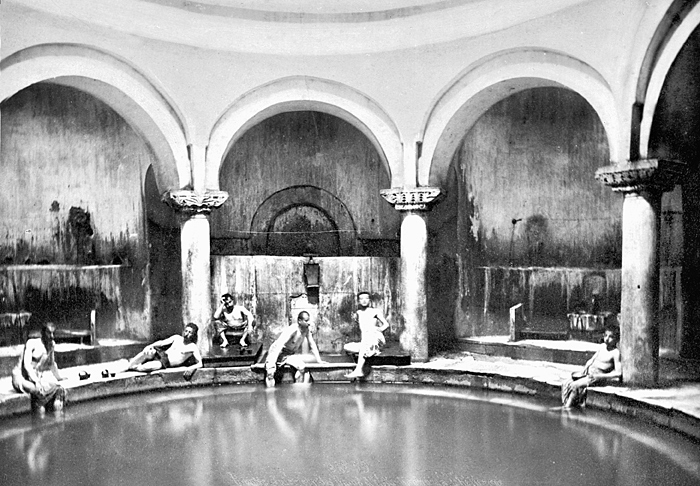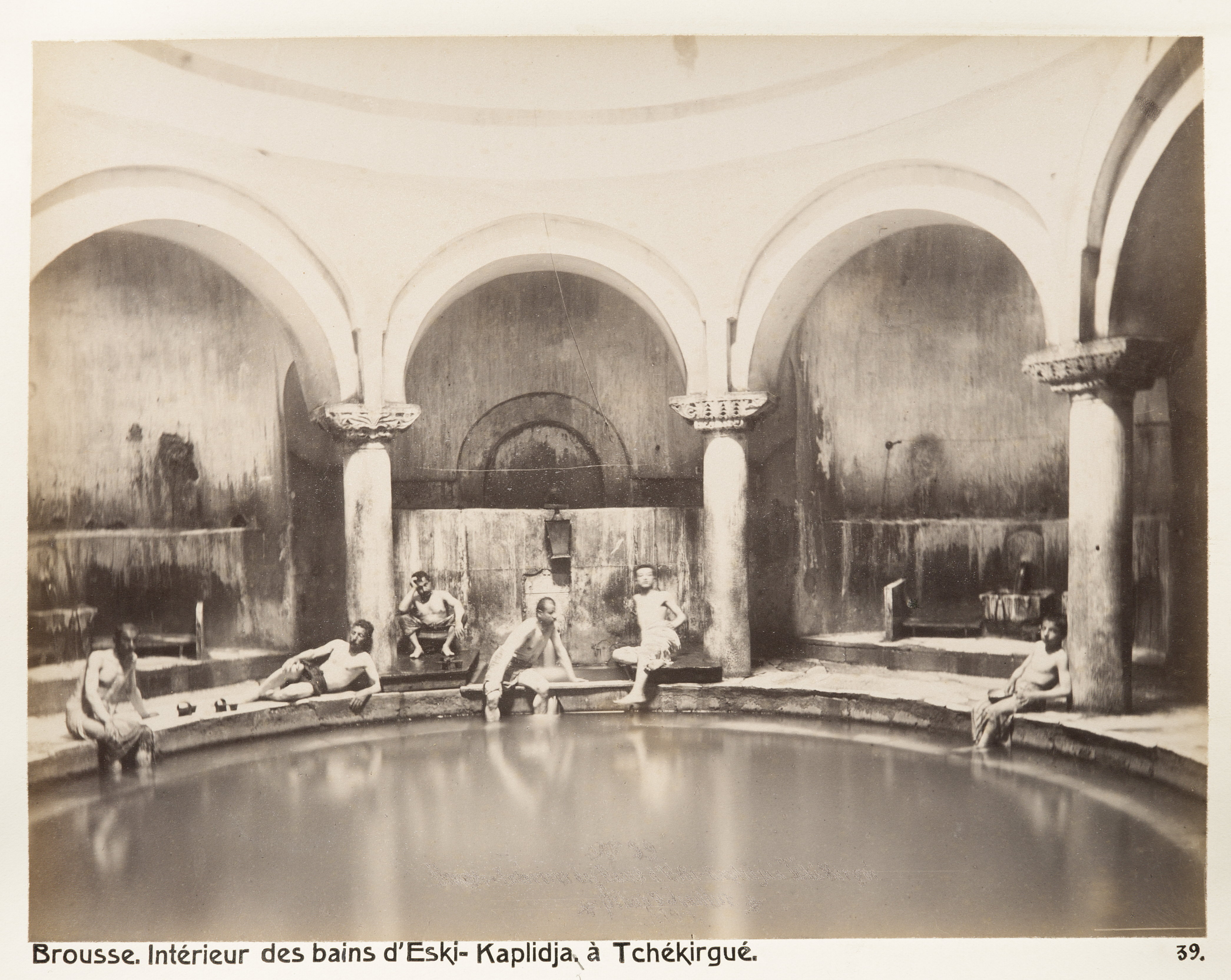 Interiör från badet Eski Kaplıca i Çekirge, Bursa. Text på originalet: "Brousse. Intérieur des bains d`Eski-Kaplidja à Tchékirgué." Fotografierna LXVI:O.01.-54. kommer från resan till Turkiet och Mindre Asien som Wilhelmina och Walther von Hallwyl gjorde den 27 april - 20 juni 1901. De lämnade Sverige den 5 november 1900 för Egypten, där de stannade till den 28 mars 1901, då de fortsatte till Palestina. Den 27 april fortsatte de till Turkiet och Mindre Asien. Med på resan var Wilhelminas sällskapsdam, fröken Ida Uhse. I Konstantinopel (Istanbul) anslöt sig Wilhelminas mor Johanna Kempe och kusindottern Elma Hök. Fotografierna är inköpta av Wilhelmina i Konstantinopel (Istanbul) och Brussa. Alla uppgifter kommer från Ida Uhses reseanteckningar.