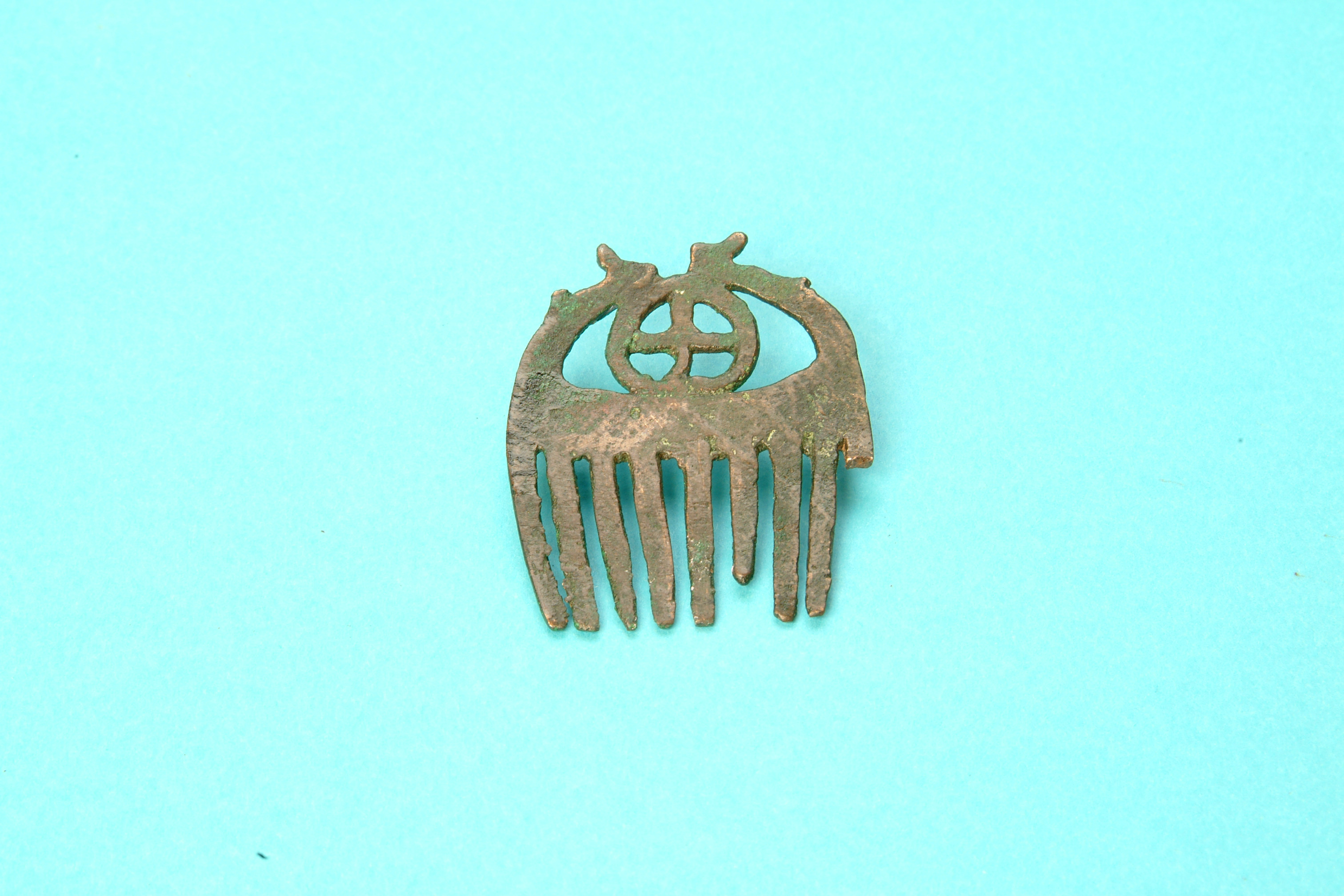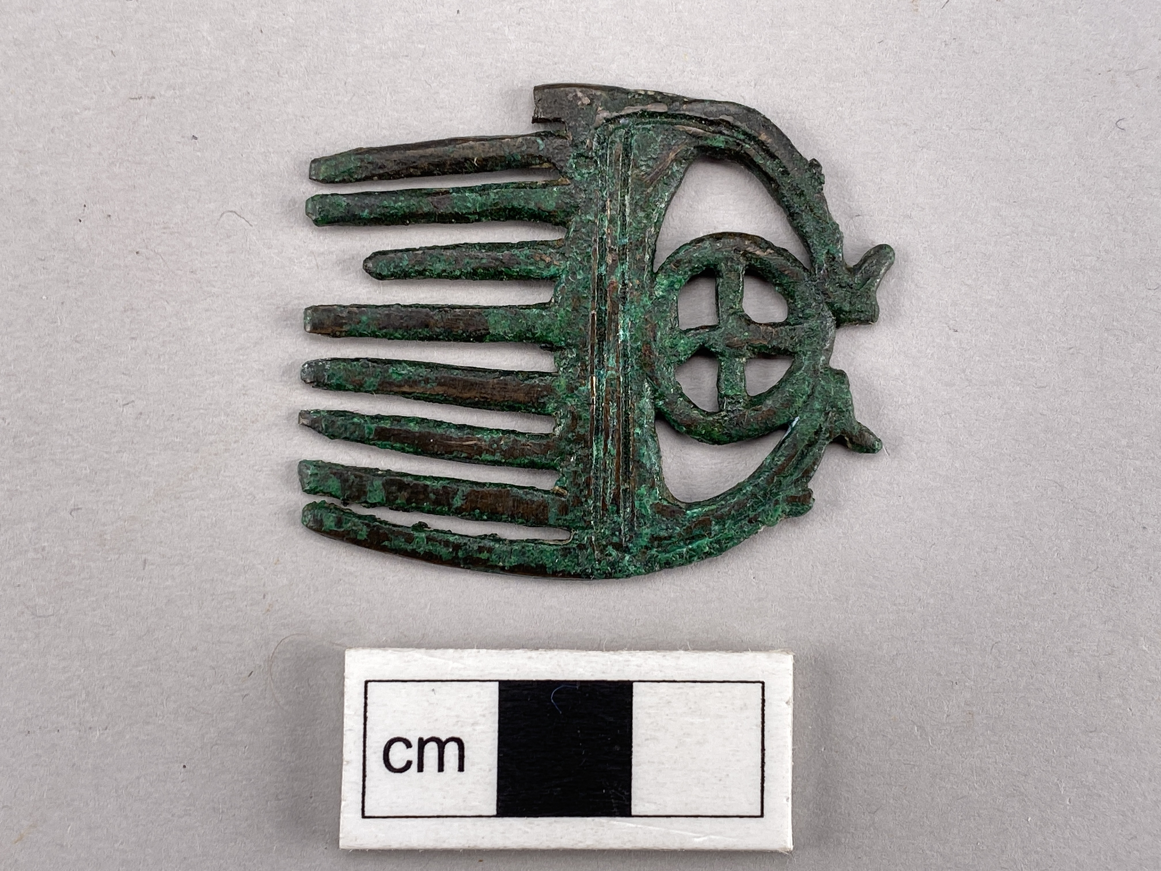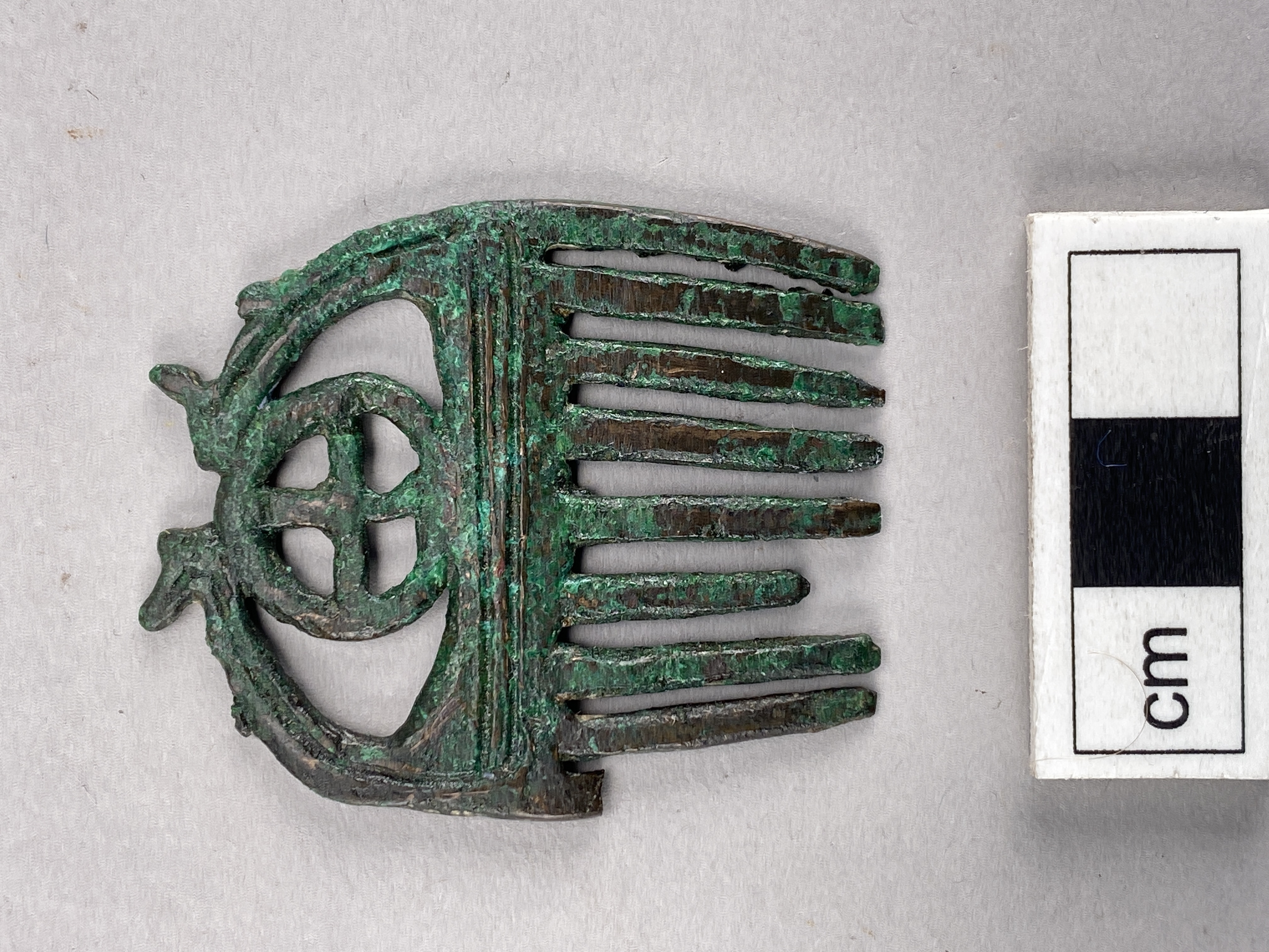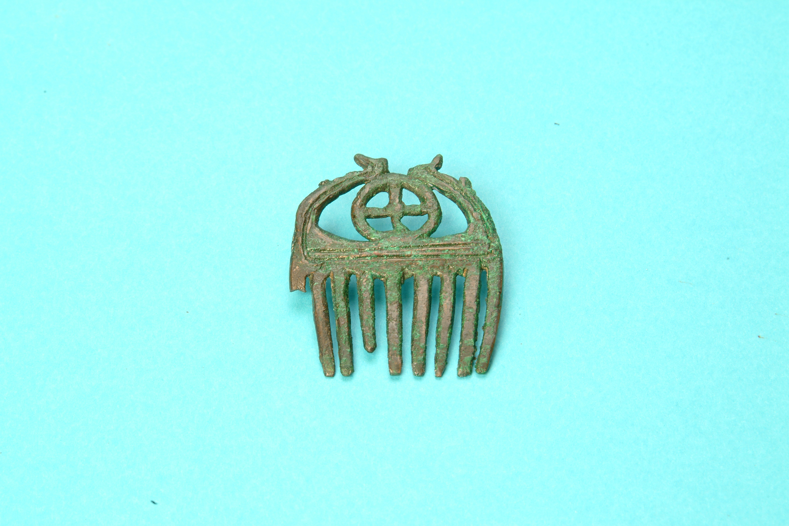 Liten kam av brons med nio tänder och en hjulformig prydnad i övre delen.